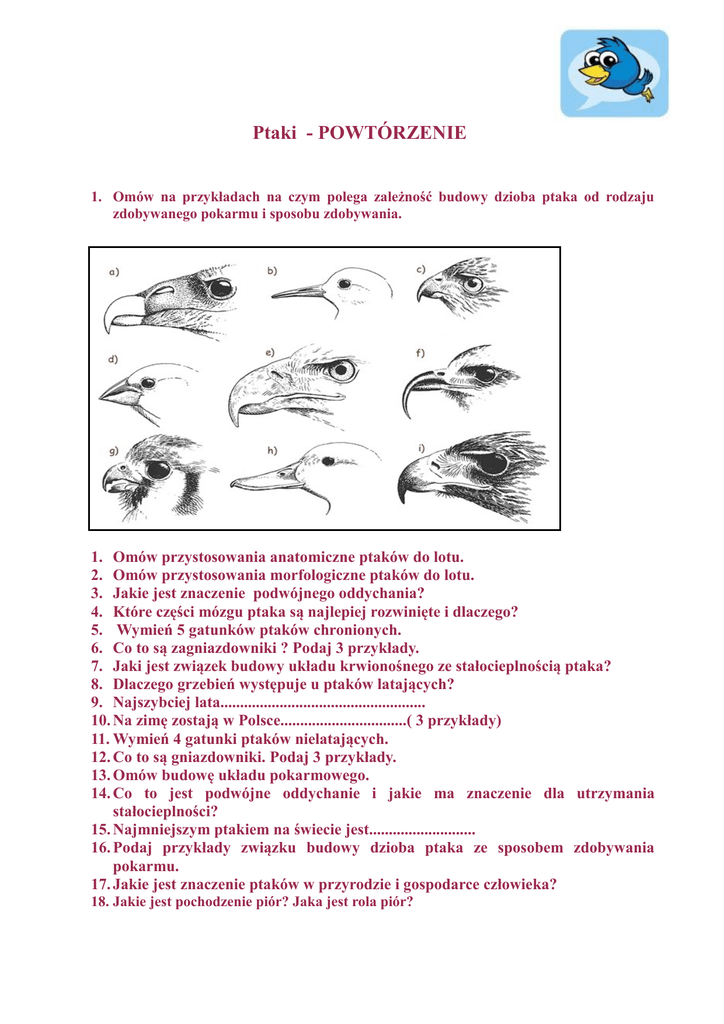 Ptaki - POWTÓRZENIE 1. Omów na przykładach na czym polega zależność budowy dzioba ptaka od rodzaju zdobywanego pokarmu i sposobu zdobywania. 1. Omów przystosowania anatomiczne ptaków do lotu. 2. Omów przystosowania morfologiczne ptaków do lotu. 3. Jakie jest znaczenie podwójnego oddychania? 4. Które części mózgu ptaka są najlepiej rozwinięte i dlaczego? 5. Wymień 5 gatunków ptaków chronionych. 6. Co to są zagniazdowniki ? Podaj 3 przykłady. 7. Jaki jest związek budowy układu krwionośnego ze stałocieplnością ptaka? 8. Dlaczego grzebień występuje u ptaków latających? 9. Najszybciej lata.................................................... 10. Na zimę zostają w Polsce................................( 3 przykłady) 11. Wymień 4 gatunki ptaków nielatających. 12. Co to są gniazdowniki. Podaj 3 przykłady. 13. Omów budowę układu pokarmowego. 14. Co to jest podwójne oddychanie i jakie ma znaczenie dla utrzymania stałocieplności? 15. Najmniejszym ptakiem na świecie jest........................... 16. Podaj przykłady związku budowy dzioba ptaka ze sposobem zdobywania pokarmu. 17. Jakie jest znaczenie ptaków w przyrodzie i gospodarce człowieka? 18. Jakie jest pochodzenie piór? Jaka jest rola piór? 19. Jakie są nazwy poniższych ptaków 20. Omów budowę mózgu ptaka, za co odpowiadają poszczególne części. 21. Jaki tryb życia prowadził ten ptak, dlaczego jest nazwany formą przejściową między gadami a ptakami? Rozpoznaj popularne ptaki Polski