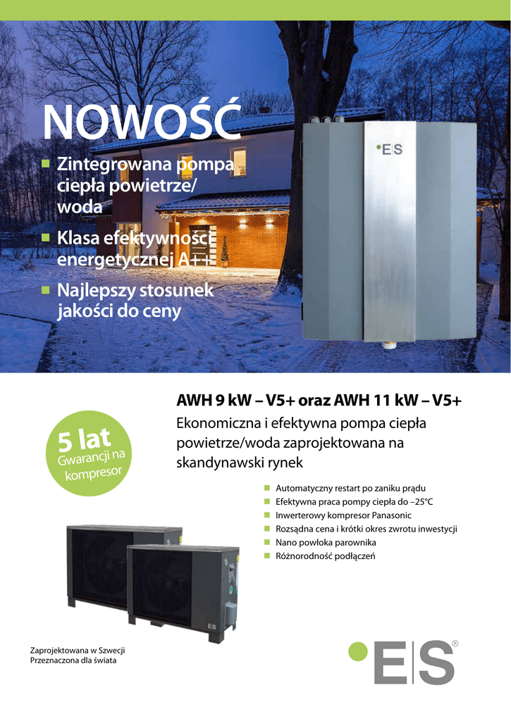 NOWOŚĆ n Zintegrowana pompa ciepła powietrze/ woda n Klasa efektywności energetycznej A++ n Najlepszy stosunek jakości do ceny AWH 9 kW – V5+ oraz AWH 11 kW – V5+ laraanctji na 5 Gw kompresor Zaprojektowana w Szwecji Przeznaczona dla świata Ekonomiczna i efektywna pompa ciepła powietrze/woda zaprojektowana na skandynawski rynek n n n n n n Automatyczny restart po zaniku prądu Efektywna praca pompy ciepła do –25°C Inwerterowy kompresor Panasonic Rozsądna cena i krótki okres zwrotu inwestycji Nano powłoka parownika Różnorodność podłączeń V5+ pompy ciepła powietrze/woda. Ekonomiczne, komfortowe i przyjazne środowisku Teraz dwie wersje w dwóch różnych mocach AWH 9kW-V5+ oraz AWH 11kW-V5+ AWH została zaprojektowana tak, aby łatwo integrowała się z istniejącymi systemami grzewczymi. Jeśli wystąpi taka potrzeba, grzałka wspomoże jej pracę. Jednostka zewnętrzna jest stylowa i kompaktowa co ułatwia jej montaż na niewielkiej powierzchni. Jednostka wewnętrzna jest wyposażona w pompę cyrkulacyjną, wymiennik ciepła oraz sterownik. Na rynek skandynawski System split z kompletnym zimowym wyposażeniem, co oznacza że wymiana ciepła z instalacją grzewczą budynku odbywa się wewnątrz i tylko układ chłodniczy jest na zewnątrz. To najbardziej efektywne i bezpieczne rozwiązanie w zimnym klimacie. Najwyższej klasy odszranianie; nano powłoka parownika. Przez wymiennik przepływa duża ilość powietrza, od którego jest odbierane ciepło, dlatego na wymienniku zewnętrznym tworzy się warstwa lodu. Program odszraniania ES działa tak, że odszranianie odbywa się tylko, gdy jest to potrzebne. Powierzchnia parownika została pokryta nano-powłoką aby zniwelować formowanie się lodu oraz zwiększyć efektywność pompy ciepła. Kompletne sterowanie ciepłem Seria V5+ jest wyposażona w kompletne sterowanie oparte na krzywej grzewczej. Im niższa jest temperatura zewnętrzna, tym wyższa temperatura wody jest dostarczana do obiegu grzewczego. Ta funkcja zwiększa wydajność pompy ciepła, gdyż dostarczamy czynnik grzewczy o dokładnie takiej temperaturze, jaka jest wymagana przez budynek. Dzięki technice inwerterowej, pompa ciepła automatycznie dopasowuje moc grzewczą do zapotrzebowania budynku na podstawie temperatury zewnętrznej. Dane techniczne AWH 9 kW – V5+ W pump consists of three parts: The9.800 heat Maksymalna moc grzewcza Maksymalna moc chłodnicza 5.050 W Współczynnik wydajności (COP) • Outdoor unit, which houses the high4.21 quality compressor from Panasonic. • Jednostka wewnętrzna wyposażona jest w wymiennik ciepła, sterownik oraz pompę cyrkulacyjną. • Jednostkę wewnętrzną i zewnętrzną łączą rury chłodnicze co redukuje możliwość uszkodzenia urządzenia w razie zaniku prądu. • Pompa ciepła nadaje się zarówno do nowych budynków, jak również rozbudowy już istniejących systemów grzewczych, z którymi świetnie się integruje. • Jeśli pompa ciepła pokrywa 50% zapotrzebowania budynku w najzimniejsze dni w klimacie zimnym, normalnie pokrywa ona 80-90% zapotrzebowania cieplnego budynku w ciągu roku. Jeśli pompa ciepła została prawidłowo dobrana, pompa ciepła ES powietrze/woda znacząco zmniejszy koszty ogrzewania generowane przez poprzednie systemy (olej, prąd, gaz, pellet...). AWH 11 kW – V5+ 11.500 W 6.740 W 5.1 A++ A++ Moc napędowa – chłodzenie 1303 - 3201 W 924 - 3132 W Moc napędowa – ogrzewanie 1170 - 2708 W 915 - 3028 W Zakres pracy - ogrzewanie -25° C – +45° C -25° C – +45° C Samokontrola odszraniania Tak Tak Podgrzewanie tacy ociekowej Tak Tak Podgrzewanie kompresora Tak Tak Elektroniczny zawór rozprężny Tak Tak Pompa cyrkulacyjna klasy A Tak, Grundfos Tak, Grundfos Wewnętrzny wymiennik ciepła Płytowy GEA* Płytowy GEA Podłączenie systemu grzewczego G1” G1” Kompresor Panasonic Twin Rotary Inverter Panasonic Twin Rotary Inverter Poziom hałasu wewnątrz/zewnątrz 29 dB(A) / 54 dB(A) 29 dB(A) / 55 dB(A) Waga jedn. wewnętrznej/zewnętrznej 26 kg / 62,5 kg 28 kg / 70 kg Gaz chłodniczy - rury R410A - 3/8 - 1/2 R410A - 3/8 - 1⁄2 Wymiary jednostki wewnętrznej, Dł x Gł x Wys 414 x 220 x 520 mm 414 x 220 x 720 mm Wymiary jednostki zewnętrznej, Dł x Gł x Wys 934 x 354 x 753 mm 1044 x 414 x 763 mm Napięcie zasilania 230 V, 50 Hz, 16A x 2 230 V 50 Hz, 16A x 2 Rozłącznik różnicowoprądowy Wymgany Wymgany Klasa energetyczna *W niektórych modelach Gaz chłodniczy ma GWP powyżej 150 Dystrybutor w Polsce: Tel: 58 5564888 • [email protected] • www.PowerOfGreen.eu Producent: Energy Save Nordic AB • Kristineholmsvägen 26B • SE-441 39 Alingsås, Sweden Kwiecień 2016 Oszczędź na kosztach ogrzewania poprzez dodanie pompy ciepła do istniejącej instalacji grzewczej. Nie wyrzucaj starego kotła - użyj go jako szczytowe źródło ciepła.