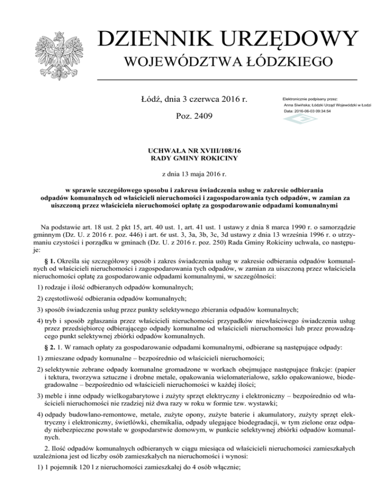 DZIENNIK URZĘDOWY WOJEWÓDZTWA ŁÓDZKIEGO Łódź, dnia 3 czerwca 2016 r. Elektronicznie podpisany przez: Anna Siwińska; Łódzki Urząd Wojewódzki w Łodzi Poz. 2409 Data: 2016-06-03 09:34:54 UCHWAŁA NR XVIII/108/16 RADY GMINY ROKICINY z dnia 13 maja 2016 r. w sprawie szczegółowego sposobu i zakresu świadczenia usług w zakresie odbierania odpadów komunalnych od właścicieli nieruchomości i zagospodarowania tych odpadów, w zamian za uiszczoną przez właściciela nieruchomości opłatę za gospodarowanie odpadami komunalnymi Na podstawie art. 18 ust. 2 pkt 15, art. 40 ust. 1, art. 41 ust. 1 ustawy z dnia 8 marca 1990 r. o samorządzie gminnym (Dz. U. z 2016 r. poz. 446) i art. 6r ust. 3, 3a, 3b, 3c, 3d ustawy z dnia 13 września 1996 r. o utrzymaniu czystości i porządku w gminach (Dz. U. z 2016 r. poz. 250) Rada Gminy Rokiciny uchwala, co następuje: § 1. Określa się szczegółowy sposób i zakres świadczenia usług w zakresie odbierania odpadów komunalnych od właścicieli nieruchomości i zagospodarowania tych odpadów, w zamian za uiszczoną przez właściciela nieruchomości opłatę za gospodarowanie odpadami komunalnymi, w szczególności: 1) rodzaje i ilość odbieranych odpadów komunalnych; 2) częstotliwość odbierania odpadów komunalnych; 3) sposób świadczenia usług przez punkty selektywnego zbierania odpadów komunalnych; 4) tryb i sposób zgłaszania przez właścicieli nieruchomości przypadków niewłaściwego świadczenia usług przez przedsiębiorcę odbierającego odpady komunalne od właścicieli nieruchomości lub przez prowadzącego punkt selektywnej zbiórki odpadów komunalnych. § 2. 1. W ramach opłaty za gospodarowanie odpadami komunalnymi, odbierane są następujące odpady: 1) zmieszane odpady komunalne – bezpośrednio od właścicieli nieruchomości; 2) selektywnie zebrane odpady komunalne gromadzone w workach obejmujące następujące frakcje: (papier i tektura, tworzywa sztuczne i drobne metale, opakowania wielomateriałowe, szkło opakowaniowe, biodegradowalne – bezpośrednio od właścicieli nieruchomości w każdej ilości; 3) meble i inne odpady wielkogabarytowe i zużyty sprzęt elektryczny i elektroniczny – bezpośrednio od właścicieli nieruchomości nie rzadziej niż dwa razy w roku w formie tzw. wystawki; 4) odpady budowlano-remontowe, metale, zużyte opony, zużyte baterie i akumulatory, zużyty sprzęt elektryczny i elektroniczny, świetlówki, chemikalia, odpady ulegające biodegradacji, w tym zielone oraz odpady niebezpieczne powstałe w gospodarstwie domowym, w punkcie selektywnej zbiórki odpadów komunalnych. 2. Ilość odpadów komunalnych odbieranych w ciągu miesiąca od właścicieli nieruchomości zamieszkałych uzależniona jest od liczby osób zamieszkałych na nieruchomości i wynosi: 1) 1 pojemnik 120 l z nieruchomości zamieszkałej do 4 osób włącznie; Dziennik Urzędowy Województwa Łódzkiego –2– Poz. 2409 2) 2 pojemniki 120 l z nieruchomości zamieszkałej od 5 do 8 osób włącznie; 3) 3 pojemniki 120 l z nieruchomości zamieszkałej przez 9 osób i więcej. 3. Odpady, o jakich mowa w § 2 ust. 1 pkt 2, obierane są w workach koloru: 1) niebieski – papier i tektura; 2) żółty – tworzywa sztuczne, drobny metal i opakowania wielomateriałowe; 3) zielony – szkło; 4) brązowy – biodegradowalne. 4. Ilość odpadów komunalnych odbieranych w ciągu miesiąca od właścicieli nieruchomości niezamieszkałych jest uzależniona od zadeklarowanej liczby i wielkości pojemników, w których gromadzone są odpady komunalne. 5. Przeterminowane leki należy przekazywać do punktów zbiórki zlokalizowanych na terenie aptek i placówek służby zdrowia lub do punktu selektywnej zbiórki odpadów komunalnych. 6. Zużyte baterie i akumulatory inne niż przemysłowe i samochodowe należy przekazywać do punktu zbiórki znajdującego się w Urzędzie Gminy w Rokicinach lub do punktu selektywnej zbiórki odpadów komunalnych. 7. Odpady budowlano-remontowe, pochodzące z indywidualnie prowadzonych drobnych remontów i innych robót budowlanych wykorzystywanych we własnym zakresie, na wykonanie których nie jest wymagane uzyskanie pozwolenia na budowę ani też zgłoszenie zamiaru prowadzenia robót do właściwego organu administracji, można przekazywać do punktu selektywnej zbiórki odpadów komunalnych. § 3. 1. Ustala się, że zmieszane odpady komunalne będą odbierane z częstotliwością – nie rzadziej niż co 4 tygodnie z terenu Gminy Rokiciny od właścicieli nieruchomości: 1) w zabudowie jednorodzinnej; 2) w zabudowie wielorodzinnej; 3) z terenu nieruchomości niezamieszkałych, na których powstają odpady komunalne; 4) z terenu nieruchomości, gdzie znajdują się domki letniskowe lub innych nieruchomości wykorzystywanych na cele rekreacyjno-wypoczynkowe. 2. Odpady komunalne, o jakich mowa w ust. 1, w okresie od maja do września odbierane będą – nie rzadziej niż co 2 tygodnie. 3. Odpady komunalne zbierane w sposób selektywny, wymienione w § 2 ust. 1 pkt 2 odbierane będą od właścicieli nieruchomości, o jakich mowa w ust. 1 – nie rzadziej niż co 4 tygodnie. 4. Odpady komunalne zbierane w sposób selektywny, wymienione w § 2 ust. 1 pkt 2 z placówek użyteczności publicznej odbierane będą na zgłoszenie. § 4. 1. Punkt selektywnej zbiórki odpadów komunalnych znajduje się na terenie gminnej oczyszczalni ścieków w Rokicinach przy ul. Tymienieckiego 3, i jest czynny w każdą środę i sobotę w godzinach od 10.00 do 14.00 za wyjątkiem świąt. 2. Przekazujący odpady do punku selektywnej zbiórki odpadów komunalnych, winien przestrzegać zasad „Regulaminu Punktu Selektywnej Zbiórki Odpadów Komunalnych w Gminie Rokiciny” ustalonego zarządzeniem nr 96/2013 Wójta Gminy Rokiciny z dnia 14 listopada 2013 r. 3. Regulamin, o jakim mowa w § 4 ust. 2, dostępny jest na stronie internetowej Gminy Rokiciny www.rokiciny.net. § 5. Przypadki niewłaściwego świ