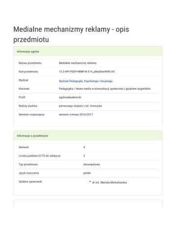Medialne mechanizmy reklamy - opis przedmiotu Informacje ogólne Nazwa przedmiotu Medialne mechanizmy reklamy Kod przedmiotu 15.3-WP-PEDP-MMR-W-S14_pNadGenWWLVO Wydział Wydział Pedagogiki, Psychologii i Socjologii Kierunek Pedagogika / Nowe media w komunikacji społecznej z językiem angielskim Profil ogólnoakademicki Rodzaj studiów pierwszego stopnia z tyt. licencjata Semestr rozpoczęcia semestr zimowy 2016/2017 Informacje o przedmiocie Semestr 4 Liczba punktów ECTS do zdobycia 3 Typ przedmiotu obowiązkowy Język nauczania polski Sylabus opracował dr inż. Mariola Michałowska Formy zajęć Forma Liczba godzin w Liczba godzin w Liczba godzin w Liczba godzin w Forma zajęć semestrze tygodniu semestrze tygodniu zaliczenia (stacjonarne) (stacjonarne) (niestacjonarne) (niestacjonarne) 15 1 9 ,6 Wykład Zaliczenie na ocenę Ćwiczenia 15 1 9 ,6 Zaliczenie na ocenę Cel przedmiotu Przekazanie studentom kompleksowej wiedzy z zakresu medialnych mechanizmów reklamy. Zapoznanie studentów z planowaniem kampanii reklamowej w mediach, zasadami i kryteriami wyboru mediów, tworzeniem skutecznego tekstu reklamowego. Przygotowanie studentów do samodzielnego funkcjonowania w świecie współczesnej komunikacji medialnej. Kształtowanie umiejętności głębokiej analizy i samodzielnego konstruowania właściwej formy komunikatu werbalnego czy wizualnego w obszarze reklamy, wyjaśnienia silnych i słabych stron poszczególnych przekazów reklamowych, a także kształtowanie umiejętności pracy w grupie społecznej. Wymagania wstępne Podstawowe zasady pisowni i ortografii języka polskiego oraz podstawowe umiejętności obsługi edytora tekstu (Microsoft Word, OpenOffice Writer), budowy prezentacji (Microsoft PowerPoint, OpenOffice Impress) oraz obsługi programów graficznych (Corel Draw, Adobe Photoshop). Zakres tematyczny Wykłady Definiowanie i historia reklamy. Miejsce reklamy w działaniach marketingowych firmy. Cechy, cele, funkcje reklamy oraz kryteria klasyfikacji reklamy. Fazy procesu tworzenia reklamy. Modele reklamy. Metody budowy przekazu reklamowego. Cztery kategorie reklam-macierz FCB. Reguły tworzenia skutecznych tekstów reklamowych. Elementy tekstu reklamowego. Argumenty za i przeciw reklamie. Procesy zapamiętywania i ich znaczenie dla konstrukcji i emisji reklam. Znaczenie i mechanizmy oddziaływania mediów. Zalety i wady różnych form reklam. Kolory i ich wykorzystanie w reklamie. Mechanizm oddziaływania reklamy. Zarys psychologii reklamy. Etapy planowania kampanii reklamowej w mediach. Zasady i kryteria wyboru mediów. Ocena efektywności przeprowadzonej kampanii reklamowej. Ćwiczenia Analiza działań reklamowych firm i określanie celów tych działań. Ocena systemu identyfikacji wizualnej wybranych firm. Dobór odpowiednich mediów reklamy do rodzaju produktu. Konstruowanie tekstu reklamowego. Cechy dobrego sloganu reklamowego. Czynniki wpływające na dobór mediów i środków reklamy. Wpływ reklamy na zachowanie konsumenta. Odbiór reklamy-percepcja. Techniki oparte na automatycznych mechanizmach percepcji. Tworzenie reklam obrazem. Język reklamy. Projekt kampanii reklamowej w mediach. Metody kształcenia Wykłady – pokaz, wykład konwencjonalny Ćwiczenia – dyskusje grupowe, burza mózgów, prace indywidualne, prace grupowe, studia przypadków, metoda projektu, klasyczna metoda problemowa, praca z literaturą przedmiotu. Efekty kształcenia i metody weryfikacji osiągania efektów kształcenia Opis efektu Symbole Metody weryfikacji Forma zajęć efektów Student zna elementarną terminologię K_W01 używaną w obszarze mediów i Kolokwium pisemne z Wykład progami punktowymi mechanizmów oddziaływania reklamy, rozumie jej źródła oraz zastosowania w obrębie pokrewnych dyscyplin naukowych Ma elementarną wiedzę dotyczącą K_W08 Kolokwium pisemne z procesów komunikowania K_W20 progami punktowymi interpersonalnego i społecznego, ich prawidłowości i zakłóceń Wykład Opis efektu Symbole Metody weryfikacji Forma zajęć efektów Potrafi samodzielnie zdobywać wiedzę i K_U04 rozwijać swoje profesjonalne umiejętności, Ocena prezentacji; Wykład Ocena wystąpienia korzystając z różnych źródeł nowoczesnych technologii, przygotowuje dokumenty tekstowe, projektuje przekaz reklamowy, których konstrukcja jest zgodna z podanymi uprzednio wymogami Ma świadomość poziomu swojej wiedzy i K_K01 Kolokwium; umiejętności, rozumie potrzebę ciągłego Konwersacja – ocena dokształcania się zawodowego i rozwoju aktywności i osobistego, dokonuje samooceny własnych przygotowania kompetencji i doskonali umiejętności, merytorycznego Ćwiczenia wyznacza kierunki własnego rozwoju i kształcenia Dostrzega i formułuje problemy moralne i K_K05 Kolokwium; dylematy etyczne związane z własną i Konwersacja – ocena cudzą pracą, poszukuje optymalnych aktywności i rozwiązań, postępuje zgodnie z zasadami przygotowania Ćwiczenia merytorycznego Warunki zaliczenia Wiadomości z zajęć realizowanych zastosowaniem metody wykładu oraz samodzielnej pracy z książką będą sprawdzane z zastosowaniem testów z progami punktowymi. Umiejętności praktyczne, np. analiza przekazu medialnego czy umiejętność konstruowania komunikatu reklamowego, oceniane będą na podstawie oceny jakości prac – projekty z progami punktowymi. Weryfikacja kompetencji społecznych odbywa się na podstawie analizy realizowanych samodzielnie projektów z zastosowaniem progów punktowych. Prowadzący ustalają, iż zaliczenie (ocena końcowa z przedmiotu) będzie średnią arytmetyczną pozytywnych ocen końcowych z: ćwiczeń i wykładów. Wykłady Zaliczenie wykładów: kolokwium pisemne z progami punktowymi. Warunkiem uzyskania oceny pozytywnej jest zdobycie minimum 60% punktów. Ćwiczenia Zaliczenie ćwiczeń: pozytywne zaliczenie wszystkich kolokwiów oraz wszystkich innych podlegających ocenie zadań i prac. Ocena końcowa jest średnią arytmetyczną wszystkich