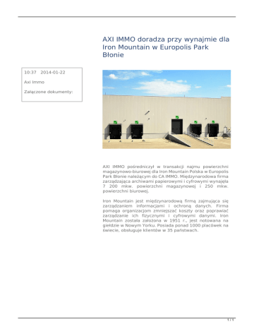 AXI IMMO doradza przy wynajmie dla Iron Mountain w Europolis Park Błonie 10:37 2014-01-22 Axi Immo Załączone dokumenty: AXI IMMO pośredniczył w transakcji najmu powierzchni magazynowo-biurowej dla Iron Mountain Polska w Europolis Park Błonie należącym do CA IMMO. Międzynarodowa firma zarządzająca archiwami papierowymi i cyfrowymi wynajęła 7 200 mkw. powierzchni magazynowej i 250 mkw. powierzchni biurowej. Iron Mountain jest międzynarodową firmą zajmująca się zarządzaniem informacjami i ochroną danych. Firma pomaga organizacjom zmniejszać koszty oraz poprawiać zarządzanie ich fizycznymi i cyfrowymi danymi. Iron Mountain została założona w 1951 r., jest notowana na giełdzie w Nowym Yorku. Posiada ponad 1000 placówek na świecie, obsługuje klientów w 35 państwach. 1/1