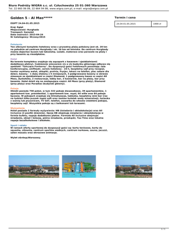 Biuro Podróży WIGRA s.c. ul. Człuchowska 25 01-360 Warszawa Tel. 22 665 06 06, 22 664 94 86, www.wigra.com.pl, e-mail: [email protected] Golden 5 - Al Mas***** EGIPT 24.04-01.05.2015 Termin i cena 24.04-01.05.2015 1999 zł Kraj: Egipt Miejscowość: Hurghada Transport: Samolot Data ważności: 2015-04-24 Nr katalogowy: Wczasy/2015 Położenie Ten olbrzymi kompleks hotelowy wraz z prywatną plażą położony jest ok. 20 km na południe od centrum Hurghady i ok. 16 km od lotniska. Do centrum Hurghady można dojechać busem lub taksówką. Leżaki, materace oraz parasole na plaży i przy basenie są nieodpłatne. Hotel Na terenie kompleksu znajduje się aquapark z basenem i zjeżdżalniami( dodatkowo płatny). Codziennie wieczorem vis a vis budynku głównego odbywa się spektakl "Tańczące Fontanny". Do dyspozycji gości hotelowych pozostają: sala konferencyjna, amfiteatr, serwis hotelowy - 24 h, bezpłatny sejf przy recepcji, kantor wymiany walut, sklepiki, pralnia, fryzjer, lekarz na telefon, plac zabaw dla dzieci, baseny - 1 duży złożony z 5 mniejszych, 3 podgrzewane baseny w okresie zimowym ze zjeżdżalniami w części Diamond, 1 podgrzewany basen w części All Mass, dyskoteka, 2 restauracje, lobby bar, 3 kawiarnie, bar na plaży, bar przy basenie. Hotel dzieli się na następujące części: All Mass (przy plaży), Diamond (przy plaży) oraz Paradise (budynek główny). Pokoje Obiekt posiada 750 pokoi, w tym 322 pokoje dwuosobowe, 39 apartamentów, 1 apartament tzw. presidential, 1 apartament tzw. royal, 64 wille oraz 84 pokoje łączone. W pokojach znajduje się klimatyzacja, lodówka, bezpłatny mini bar (raz na tydzień kilka puszek napoi soft oraz zestaw butelek wody mineralnej), łazienka z wanną lub prysznicem, TV SAT, telefon, suszarka do włosów (niektóre pokoje), bezpłatny sejf. Wszystkie pokoje są z balkonami lub tarasami. Wyżywienie Hotel posiada 2 formuły wyżywienia: HB (śniadania i obiadokolacje) oraz All Inclusive (3 posiłki dziennie). Opcja HB obejmuje śniadania i obiadokolacje w formie bufetu, napoje dodatkowo płatne. Formuła All Inclusive obejmuje: śniadanie, obiad i kolację, późne śniadanie, przekąski, Tea Time oraz lokalne napoje bezalkoholowe i alkohole. Sport i relaks W ramach oferty sportowej do dyspozycji gości są: korty tenisowe, korty do squasha, siłownia, centrum sportów wodnych, centrum nurkowe, sauna, jacuzzi, salon masażu oraz okresowo animacje. Wylot z Warszawy. 1/1 Powered by TCPDF (www.tcpdf.org)