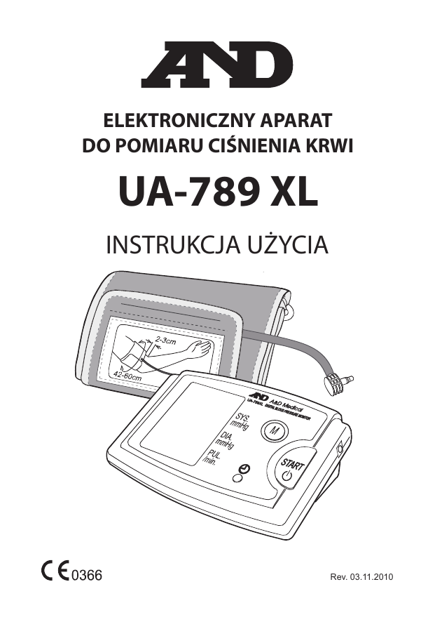 ELEKTRONICZNY APARAT DO POMIARU CIŚNIENIA KRWI UA-789 XL INSTRUKCJA UŻYCIA Rev. 03.11.2010 Spis treści Szanowni Klienci . . . . . . . . . . . . . . . . . . . . . . . . . . . . . . . . . . . . . . . . . . . . . . . . . . . . . . . . . . . . . . 2 Uwagi wstępne . . . . . . . . . . . . . . . . . . . . . . . . . . . . . . . . . . . . . . . . . . . . . . . . . . . . . . . . . . . . 2 Środki ostrożności . . . . . . . . . . . . . . . . . . . . . . . . . . . . . . . . . . . . . . . . . . . . . . . . . . . . . . . . . 2 Oznaczenie części . . . . . . . . . . . . . . . . . . . . . . . . . . . . . . . . . . . . . . . . . . . . . . . . . . . . . . . . . 3 Symbole. . . . . . . . . . . . . . . . . . . . . . . . . . . . . . . . . . . . . . . . . . . . . . . . . . . . . . . . . . . . . . . . . . . 4 Sposób działania . . . . . . . . . . . . . . . . . . . . . . . . . . . . . . . . . . . . . . . . . . . . . . . . . . . . . . . . . . . . . . 5 1.Normalny pomiar z zapisaniem wyników . . . . . . . . . . . . . . . . . . . . . . . . . . . . . . . . . 5 2.Odczytywanie wyników z pamięci aparatu. . . . . . . . . . . . . . . . . . . . . . . . . . . . . . . . 5 3.Usuwanie zapisów z pamięci . . . . . . . . . . . . . . . . . . . . . . . . . . . . . . . . . . . . . . . . . . . . . 5 4.Pomiar z oczekiwanym ciśnieniem skurczowym . . . . . . . . . . . . . . . . . . . . . . . . . . 5 Używanie urządzenia . . . . . . . . . . . . . . . . . . . . . . . . . . . . . . . . . . . . . . . . . . . . . . . . . . . . . . . . . . 6 Wkładanie/wymiana baterii . . . . . . . . . . . . . . . . . . . . . . . . . . . . . . . . . . . . . . . . . . . . . . . . 6 Podłączenie przewodu powietrza . . . . . . . . . . . . . . . . . . . . . . . . . . . . . . . . . . . . . . . . . . 6 Regulacja wbudowanego zegara . . . . . . . . . . . . . . . . . . . . . . . . . . . . . . . . . . . . . . . . . . . 7 Ustawianie trzech terminów funkcji przypominania . . . . . . . . . . . . . . . . . . . . . . . . 7 Wyłączenie dzwonka na wyświetlaczu . . . . . . . . . . . . . . . . . . . . . . . . . . . . . . . . . . . . . 8 Zakładanie mankietu . . . . . . . . . . . . . . . . . . . . . . . . . . . . . . . . . . . . . . . . . . . . . . . . . . . . . . 8 Jak właściwie przeprowadzić pomiar? . . . . . . . . . . . . . . . . . . . . . . . . . . . . . . . . . . . . . . 8 Pomiar . . . . . . . . . . . . . . . . . . . . . . . . . . . . . . . . . . . . . . . . . . . . . . . . . . . . . . . . . . . . . . . . . . . . 8 Po dokonaniu pomiaru. . . . . . . . . . . . . . . . . . . . . . . . . . . . . . . . . . . . . . . . . . . . . . . . . . . . . 8 Pomiary . . . . . . . . . . . . . . . . . . . . . . . . . . . . . . . . . . . . . . . . . . . . . . . . . . . . . . . . . . . . . . . . . . . . . . . 9 Normalny pomiar . . . . . . . . . . . . . . . . . . . . . . . . . . . . . . . . . . . . . . . . . . . . . . . . . . . . . . . . . . 9 Pomiar z oczekiwanym ciśnieniem skurczowym . . . . . . . . . . . . . . . . . . . . . . . . . . . 10 Wskazówki dla uzyskania prawidłowych pomiarów. . . . . . . . . . . . . . . . . . . . . . . . 10 Odczytywanie wyników z pamięci aparatu . . . . . . . . . . . . . . . . . . . . . . . . . . . . . . . . . . . . 11 Co to jest nieregularne bicie serca? . . . . . . . . . . . . . . . . . . . . . . . . . . . . . . . . . . . . . . . . . . . 12 Słupkowy wskaźnik ciśnienia . . . . . . . . . . . . . . . . . . . . . . . . . . . . . . . . . . . . . . . . . . . . . . . . . 12 Wskaźniki klasyfikacji według Światowej Organizacji Zdrowia . . . . . . . . . . . . . . . . . 12 Informacje na temat ciśnienia krwi. . . . . . . . . . . . . . . . . . . . . . . . . . . . . . . . . . . . . . . . . . . . 13 Co to jest ciśnienie krwi?. . . . . . . . . . . . . . . . . . . . . . . . . . . . . . . . . . . . . . . . . . . . . . . . . . 13 Co to jest nadciśnienie i jak je kontrolować? . . . . . . . . . . . . . . . . . . . . . . . . . . . . . . 13 Dlaczego warto mierzyć ciśnienie w domu ? . . . . . . . . . . . . . . . . . . . . . . . . . . . . . . 13 Klasyfikacja ciśnienia krwi według Światowej Organizacji Zdrowia . . . . . . . . . 13 Różnice w ciśnieniu krwi . . . . . . . . . . . . . . . . . . . . . . . . . . . . . . . . . . . . . . . . . . . . . . . . . 13 Rozwiązywanie problemów . . . . . . . . . . . . . . . . . . . . . . . . . . . . . . . . . . . . . . . . . . . . . . . . . . 14 Konserwacja . . . . . . . . . . . . . . . . . . . . . . . . . . . . . . . . . . . . . . . . . . . . . . . . . . . . . . . . . . . . . . . . . 15 Dane techniczne . . . . . . . . . . . . . . . . . . . . . . . . . . . . . . . . . . . . . . . . . . . . . . . . . . . . . . . . . . . . . 15 1 Szanowni Klienci Gratulujemy zakupu najnowocześniejszego aparatu do mierzenia ciśnienia firmy A&D, jednego z najbardziej zaawansowanych, dostępnych obecnie urządzeń. Zaprojektowany tak, aby jego użycie było łatwe, a wskazania dokładne, aparat do mierzenia ciśnienia ułatwi Państwu przestrzeganie codziennego schematu mierzenia ciśnienia krwi. Zalecamy dokładne przeczytanie niniejszej instrukcji przed pierwszym użyciem. Uwagi wstępne Urządzenie jest zgodne z Dyrektywą Europejską 93/42 EWG dla Wyrobów Medycznych. Potwierdza to wyraźne oznaczenie zgodności CE0366 (0366: numer referencyjny jednostki notyfikowanej potwierdzającej zgodność z Dyrektywą). Urządzenie jest przeznaczone wyłącznie dla osób dorosłych, nie należy go stosować u noworodków lub niemowląt. Środowisko stosowania Urządzenie należy używać wewnątrz pomieszczeń. Środki ostrożności Urządzenie przeznaczone jest do stosowania na duże ramię. Nie nadaje się do stosowania ze średnim lub małym rozmiarem mankietu. Należy stosować rozmiar L (duży) lub XL (bardzo duży). Wielkość ramienia 32 cm do 45 cm 42 cm do 60 cm Zalecany rozmiar mankietu Mankiet rozmiar L Mankiet rozmiar XL Nr katalogowy produktu UA-CUFDBKLA-EC - W skład urządzenia wchodzą precyzyjne komponenty. Należy unik
