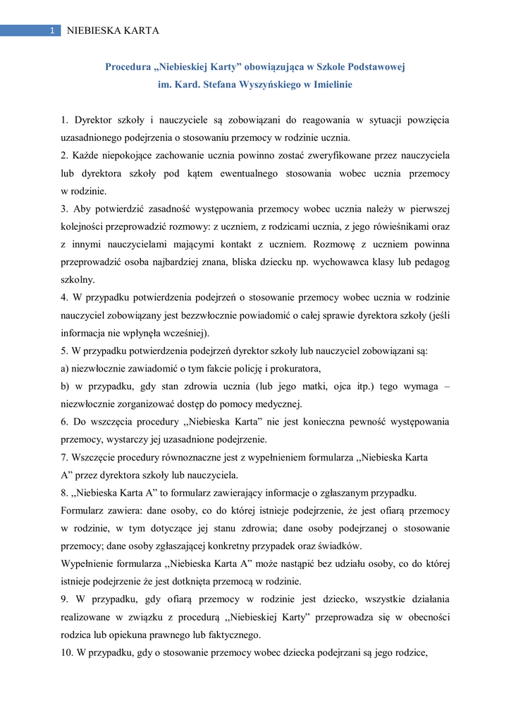 1 NIEBIESKA KARTA Procedura „Niebieskiej Karty” obowiązująca w Szkole Podstawowej im. Kard. Stefana Wyszyńskiego w Imielinie 1. Dyrektor szkoły i nauczyciele są zobowiązani do reagowania w sytuacji powzięcia uzasadnionego podejrzenia o stosowaniu przemocy w rodzinie ucznia. 2. Każde niepokojące zachowanie ucznia powinno zostać zweryfikowane przez nauczyciela lub dyrektora szkoły pod kątem ewentualnego stosowania wobec ucznia przemocy w rodzinie. 3. Aby potwierdzić zasadność występowania przemocy wobec ucznia należy w pierwszej kolejności przeprowadzić rozmowy: z uczniem, z rodzicami ucznia, z jego rówieśnikami oraz z innymi nauczycielami mającymi kontakt z uczniem. Rozmowę z uczniem powinna przeprowadzić osoba najbardziej znana, bliska dziecku np. wychowawca klasy lub pedagog szkolny. 4. W przypadku potwierdzenia podejrzeń o stosowanie przemocy wobec ucznia w rodzinie nauczyciel zobowiązany jest bezzwłocznie powiadomić o całej sprawie dyrektora szkoły (jeśli informacja nie wpłynęła wcześniej). 5. W przypadku potwierdzenia podejrzeń dyrektor szkoły lub nauczyciel zobowiązani są: a) niezwłocznie zawiadomić o tym fakcie policję i prokuratora, b) w przypadku, gdy stan zdrowia ucznia (lub jego matki, ojca itp.) tego wymaga – niezwłocznie zorganizować dostęp do pomocy medycznej. 6. Do wszczęcia procedury ,,Niebieska Karta” nie jest konieczna pewność występowania przemocy, wystarczy jej uzasadnione podejrzenie. 7. Wszczęcie procedury równoznaczne jest z wypełnieniem formularza ,,Niebieska Karta A” przez dyrektora szkoły lub nauczyciela. 8. ,,Niebieska Karta A” to formularz zawierający informacje o zgłaszanym przypadku. Formularz zawiera: dane osoby, co do której istnieje podejrzenie, że jest ofiarą przemocy w rodzinie, w tym dotyczące jej stanu zdrowia; dane osoby podejrzanej o stosowanie przemocy; dane osoby zgłaszającej konkretny przypadek oraz świadków. Wypełnienie formularza ,,Niebieska Karta A” może nastąpić bez udziału osoby, co do której istnieje podejrzenie że jest dotknięta przemocą w rodzinie. 9. W przypadku, gdy ofiarą przemocy w rodzinie jest dziecko, wszystkie działania realizowane w związku z procedurą ,,Niebieskiej Karty” przeprowadza się w obecności rodzica lub opiekuna prawnego lub faktycznego. 10. W przypadku, gdy o stosowanie przemocy wobec dziecka podejrzani są jego rodzice, 2 NIEBIESKA KARTA opiekunowie prawni lub faktyczni, to wszystkie działania realizowane w związku z procedurą ,,Niebieskiej Karty” z udziałem dziecka przeprowadza się w obecności osoby dziecku najbliższej w rozumieniu art.115 kk (dziadkowie, pełnoletnie rodzeństwo dziecka). 11. Dyrektor szkoły lub nauczyciel wszczynają procedurę ,,Niebieskiej Karty” również w przypadku, gdy dotknięty przemocą jest inny dorosły członek rodziny np. matka ucznia. 12. Wszczynając procedurę dyrektor lub nauczyciel zobowiązany jest podjąć działania interwencyjne mające na celu zapewnienie bezpieczeństwa osobie, co do której istnieje podejrzenie, że jest dotknięta przemocą w rodzinie. 13. W przypadku bezpośredniego zagrożenia życia lub zdrowia dziecka w związku z przemocą w rodzinie dyrektor zobowiązany jest do skontaktowania się z pracownikiem socjalnym, który z kolei w takim przypadku ma prawo odebrać dziecko z rodziny i umieścić je u innej niezamieszkującej wspólnie osoby najbliższej, tj. w przypadku dziecka są to dziadkowie, rodzeństwo lub osoba pozostająca we wspólnym pożyciu lub stosowne instytucje. 14. Po wypełnieniu formularza ,,Niebieska Karta A” dyrektor lub nauczyciel wypełniają formularz ,,Niebieska Karta B” , czyli pouczenie dla osób dotkniętych przemocą w rodzinie. 15. Formularz ,,Niebieska Karta B” zawiera wykaz czynności, do których ma prawo prokurator w toku postępowania przygotowawczego, wykaz czynności dokonywanych przez bliskich, które są ścigane przez prawo oraz zwięzły opis postępowania w przypadku doświadczenia przemocy w rodzinie, z dołączoną listą instytucji i organizacji, do których można zwrócić się o pomoc. 16. Formularz ,,Niebieska Karta B” wręcza się osobie, co do której istnieje podejrzenie, że jest zagrożona przemocą w rodzinie, nie otrzymuje go osoba, wobec której zachodzi podejrzenie, że jest sprawcą przemocy. 17. Dyrektor szkoły lub nauczyciel zobowiązani są do poinformowania ucznia i jego rodzica (opiekuna lub osoby najbliższej) o możliwościach uzyskania pomocy, możliwościach podjęcia dalszych działań mających na celu poprawę sytuacji życiowej (opisanie, do jakich instytucji można się zwrócić, gdzie w okolicy się takie znajdują i jaki jest zakres ich działania). 18. Dyrektor lub nauczyciel zobowiązani są do zdiagnozowania potrzeb dotkniętego przemocą ucznia i wdrożenia działań pomocowych (np. złożenia w imieniu ucznia wniosku o stypendium szkolne czy dożywianie, zorganizowanie dla ucznia zajęć dydaktyczno – wyrównawczych, powiadomienie pedagoga szkolnego o zaistniałej sytuacji i zorganizowanie uczniowi konsultacji, leczenia w specjalistycznej poradni itd.). 3 NIEBIESKA KARTA 19. W zależności od sytuacji dyrektor szkoły lub nauczyciel podejmują decyzję o przeprowadzeniu rozmowy ze sprawcą przemocy na temat konsekwencji jej stosowania i możliwości podjęcia leczenia lub terapii. Rozmowa ze sprawcą przemocy nie jest obowiązkowa. 20. Po wypełnieniu formularza ,,Niebieska Karta A” i przekazaniu formularza ,,Niebieska Karta B” osobie, co do której istnieje podejrzenie, że jest dotknięta przemocą w rodzinie, dyrektor szkoły lub nauczyciel, który wszczął procedurę musi niezwłocznie (nie później niż w ciągu siedmiu dni od dnia rozpoczęcia procedury) przekazać wypełniony formularz ,,Niebieska Karta A” do przewodniczącego zespołu interdyscyplinarnego, przy czym zachowuje dla siebie kopię formularza. 21. Przewodniczący zespołu interdyscyplinar
