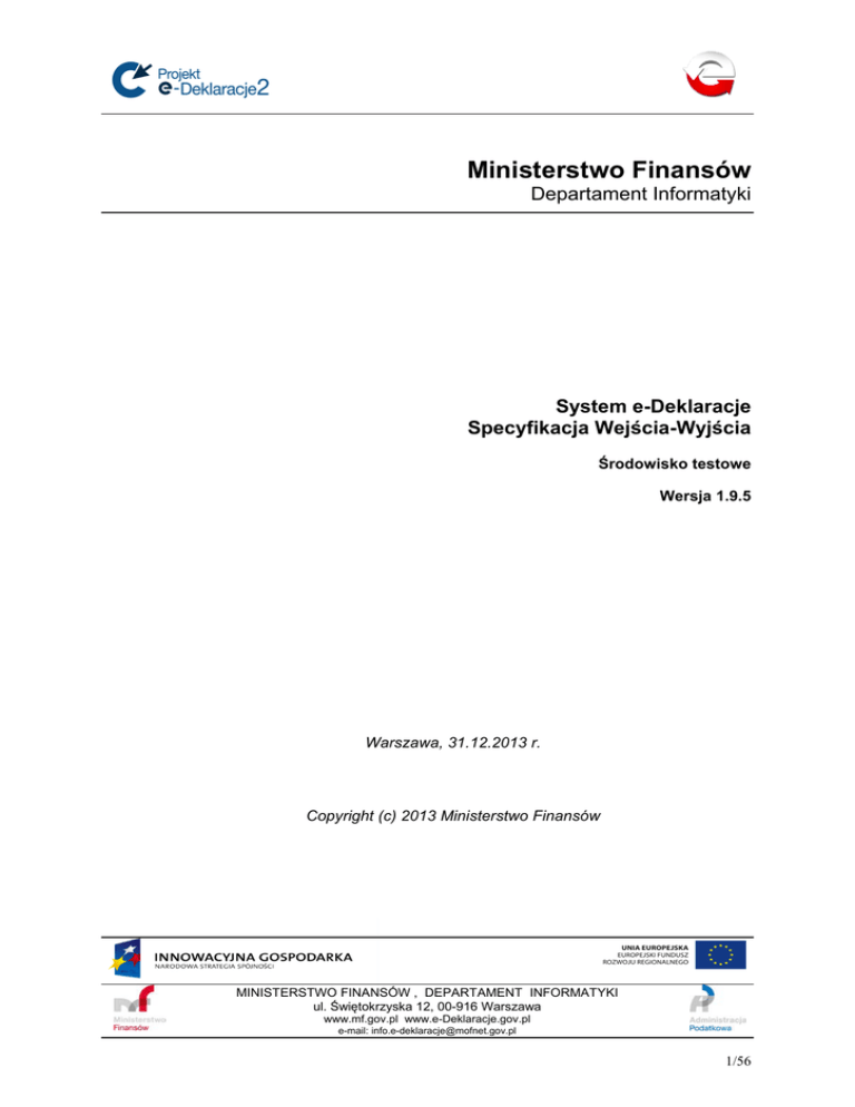 Ministerstwo Finansów Departament Informatyki System e-Deklaracje Specyfikacja Wejścia-Wyjścia Środowisko testowe Wersja 1.9.5 Warszawa, 31.12.2013 r. Copyright (c) 2013 Ministerstwo Finansów MINISTERSTWO FINANSÓW , DEPARTAMENT INFORMATYKI ul. Świętokrzyska 12, 00-916 Warszawa www.mf.gov.pl www.e-Deklaracje.gov.pl e-mail: [email protected] 1/56 Projekt e-Deklaracje 2 Historia dokumentu Wersja Data wersji Opis 1.3 2009-12-31 Modyfikacja 1.4 2010-12-31 Modyfikacja Akcja Rozdziały (**) Autorzy (*) W, N, Z 1.4, 2, 4.3, 4.5, 4.6 W, N, Z 1.4, 2, 2.2.1, 2.2.2. Zatwierdził (***) 2.2.5, 2.5.5, 2.6, 3.4, 4, 4.2, 4.4.2 1.4, 2.3, 2.4, 2.9, 2.10, 4.2.2, 4.4.2 1.4 1.4.1 2011-01-10 Modyfikacja W, N, Z 1.4.2 2011-02-10 Modyfikacja W, N, Z 1.5 2011-12-15 Modyfikacja W, N, Z 1.4, 2, 2.2, 2.3, 2.4, 2.5.5, 2.6, 2.9, 2.10, 3.3, 3.4, 3.5, 4.1.2, 4.2.2, 4.3.2, 4.4.2 1.2, 2.10, 4.4 1.5.1 2011-12-20 Modyfikacja W, N, Z 1.6 2012-01-10 Modyfikacja W, N, Z 1.4, 2, 2.4.1, 2.5.5, 1.7 2012-03-26 Modyfikacja 1.8.0 2012-09-18 Modyfikacja 1.8.1 2012-10-01 Modyfikacja 2.6, 4.1.3, 4.2.3, 4.3.3, 4.4.3 W, N, Z 1.2, 1.3, 1.4, 2, 2.4, 2.5, 2.6, 2.8, 2.11, 2.12, 3.1, 3.5, 4.2, 4.3, 4.4, 4.5, 4.6 W, N, Z 1.4, 2, 2.5.5, 2.6, 4.4.2 1.4 W, N, Z 1.8.2 2012-12-07 Modyfikacja W, N, Z 1.4, 2, 2.2.2, 2.5.5, 1.9.0 2013-01-02 Modyfikacja W, N, Z 1.9.1 2013-04-18 Modyfikacja W, N, Z 1.9.2 2013-06-17 Modyfikacja W, N, Z 2.6, 2.11, 2.11.1, 2.11.2, 2.13, 3.1, 3.2 1.4, 2, 2.5.5, 2.6, 2.8, 4.4.3 1.2, 1.4, 2, 2.2.1.2, 2.5.5 2.6 1.4, 4.4.2 1.9.3 2013-07-12 Modyfikacja W, Z 1.4, 4.4.2 1.9.4 2013-10-24 Modyfikacja W, Z 1.9.5 2013-12-31 Modyfikacja W, Z 1.2, 2.5.1, 2.5.2, 2.5.3, 2.5.4, 2.10, 3.4, 4.4.3 1.4, 2, 2.2, 2.2.1, 2.2.1.1, 2.2.3, 2.5.5, 2.6, 2.8, 2.11, 2.11.1, 2.11.2, 2.13 (*) Akcje: W = Wstaw, Z = Zamień, We = Weryfikuj, N = Nowy (**) Rozdziały: W = Wszystkie (***) Zatwierdził (jeśli dotyczy) osoba zatwierdzająca podpisuje się w ostatnim wypełnionym wierszu, dla zatwierdzonej wersji papierowej, którą przekazuje się do archiwum. 2/56 Projekt e-Deklaracje 2 Informacja o zmianach w wersji 1.9.5 Dokument specyfikacji zmodyfikowany w związku z publikacją w CRD nowych wzorów XSD. Informacja o zmianach w wersji 1.9.4 Dokument specyfikacji zmodyfikowany w związku ze zmianami środowiska technicznego. Główne zmiany dla systemu testowego dotyczą formatu podpisu UPO oraz kodowania polskich znaków diakrytycznych w UPO. 1. UPO było podpisane XAdES enveloped, w nowym UPO jest podpis XAdES enveloping. 2. UPO nie zawierało deklaracji XML mówiącej o standardzie kodowania. Nowe UPO zawiera zalecany nagłówek z deklaracją kodowania UTF-8. 3. UPO zawierało literę „ó” zakodowaną jednobajtowo, jako wartość #F3 (hex) Unicode. W nowym UPO litera „ó” zakodowana jest, zgodnie z deklaracją w nagłówku, w standardzie UTF-8, czyli dwubajtowo, jako wartość #C3 #B3 (hex). 4. UPO kodowało literę „ó” przez encję ó . Nowe UPO nie koduje litery „ó” przy pomocy encji, ponieważ jest to standardowy znak w UTF-8 i zgodnie ze specyfikacją http://www.w3.org/TR/xml/ nie wymaga żadnego kodowania. Trzeba jednak pamiętać, że w takim przypadku strumień zawiera znaki o kodach 195 (dec) i 179 (dec), zatem musi być przetwarzany z uwzględnieniem ósmego bitu, a wszelkie konwersje między obiektem typu String i tablicą bajtów muszą uwzględniać prawidłowe kodowanie. Informacja o zmianach w wersji 1.9.3 Dokument specyfikacji zmodyfikowany w związku ze zmianą opisu dla statusu błędu „423”. Informacja o zmianach w wersji 1.9.2 Dokument specyfikacji zmodyfikowany w związku z publikacją w repozytorium CRD nowych wzorów XSD oraz rozszerzeniem funkcjonalności systemu testowego (nowe statusy błędu „423”, „424”, „425”). Informacja o zmianach w wersji 1.9.1 Dokument specyfikacji zmodyfikowany w związku z publikacją w repozytorium CRD nowych wzorów XSD oraz doprecyzowaniem zakresu funkcjonalności systemu testowego. Informacja o zmianach w wersji 1.9.0 Dokument specyfikacji zmodyfikowany w związku z publikacją Rozporządzenia [34] Ministra Finansów z dnia 24 grudnia 2012 r. (Dz.U. z dnia 31.12.2012 r. poz. 1537). Ponadto dodano w rozdziale 2.8 opis wymagania dotyczącego postaci kanonicznej dokumentu elektronicznego. Informacja o zmianach w wersji 1.8.2 Dokument specyfikacji zmodyfikowany w związku z publikacją w CRD nowych wzorów XSD. Informacja o zmianach w wersji 1.8.1 Dokument specyfikacji zmodyfikowany w związku z publikacją Rozporządzenia [32] i zmianami : • funkcjonalności systemu e-Deklaracje i dodaniem obsługi kolejnej grupy deklaracji elektronicznych z podpisem elektronicznym nieweryfikowanym za pomocą ważnego kwalifikowanego certyfikatu (dane autoryzujące) obejmującej VAT-7(12), VAT-7D(3), VAT-7K(6) i PCC-3(2); • funkcjonalności systemu e-Deklaracje i zmianą opisu dla statusów błędów „410”, „411”, „412”, „414” oraz dodaniem nowego statusu błędu „422”. 3/56 Projekt e-Deklaracje 2 Spis treści 1. WPROWADZENIE...................................................................................................................................... 6 1.1 1.2 1.3 1.4 2. PRZEZNACZENIE ...................................................................................................................................... 6 ZAKRES ................................................................................................................................................... 6 DEFINICJE, AKRONIMY, SKRÓTY ............................................................................................................. 7 REFERENCJE ............................................................................................................................................ 8 PREZENTACJA STRUKTURY DOKUMENTU ELEKTRONICZNEGO......................................... 11 2.1 OPIS STRUKTURY ..............................................................................