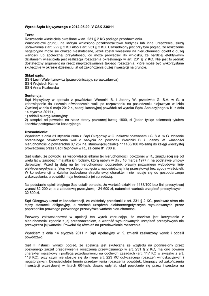 Wyrok Sądu Najwyższego z 2012-05-09, V CSK 236/11 Teza: Roszczenie właściciela określone w art. 231 § 2 KC podlega przedawnieniu. Właścicielowi gruntu, na którym wniesiono pozakontraktowo budynek lub inne urządzenie, służą uprawnienia z art. 222 § 2 KC albo z art. 231 § 2 KC. Uzasadniony jest przy tym pogląd, że roszczenie negatoryjne może się okazać nieskuteczne, jeżeli został wniesiony na nieruchomości obiekt o dużej wartości lub społecznej przydatności, co może prowadzić do wniosku, że bardziej efektywnym działaniem właściciela jest realizacja roszczenia określonego w art. 231 § 2 KC. Nie jest to jednak dostateczny argument na rzecz nieprzedawnienia takiego roszczenia, które może być wykorzystane skutecznie w okresie dziesięciu lat od zakończenia dużej inwestycji na gruncie. Skład sądu: SSN Lech Walentynowicz (przewodniczący, sprawozdawca) SSN Wojciech Katner SSN Anna Kozłowska Sentencja: Sąd Najwyższy w sprawie z powództwa Weroniki B. i Joanny W. przeciwko G. S.A. w G. o zobowiązanie do złożenia oświadczenia woli, po rozpoznaniu na posiedzeniu niejawnym w Izbie Cywilnej w dniu 9 maja 2012 r., skargi kasacyjnej powódek od wyroku Sądu Apelacyjnego w K. z dnia 14 stycznia 2011 r., 1) oddalił skargę kasacyjną: 2) zasądził od powódek na rzecz strony pozwanej kwotę 1800, zł (jeden tysiąc osiemset) tytułem kosztów postępowania kasacyjnego. Uzasadnienie: Wyrokiem z dnia 31 stycznia 2006 r. Sąd Okręgowy w G. nakazał pozwanemu G. S.A. w G. złożenie notarialnego oświadczenia woli o nabyciu od powódek Weroniki B. i Joanny W. własności nieruchomości o powierzchni 0,1257 ha, stanowiącej działkę nr 1188/100 wpisaną do księgi wieczystej prowadzonej przez Sąd Rejonowy w R., za cenę 81 700 zł. Sąd ustalił, że powódki są współwłaścicielkami tej nieruchomości, położonej w R., znajdującej się od wielu lat w zasobach majątku ich rodziny, którą nabyły w dniu 16 marca 1977 r. na podstawie umowy darowizny. Przed tą datą na tej nieruchomości poprzednik prawny pozwanego wybudował linię elektroenergetyczną (słup wysokiego napięcia z napowietrzną linią przesyłową) bez zgody właścicieli. W konsekwencji ta działka budowlana straciła swój charakter i nie nadaje się do gospodarczego wykorzystania, a powódki mają trudność z jej sprzedażą. Na podstawie opinii biegłego Sąd ustalił ponadto, że wartość działki nr 1188/100 bez linii przesyłowej wynosi 82 200 zł, a z zabudową przesyłową - 24 600 zł, natomiast wartość urządzeń przesyłowych 32 800 zł. Sąd Okręgowy uznał w konsekwencji, że zaistniały przesłanki z art. 231 § 2 KC, ponieważ stron nie łączy stosunek obligacyjny, a wartość urządzeń elektroenergetycznych wybudowanych przez poprzednika prawnego pozwanego przewyższa wartość nieruchomości. Pozwany zakwestionował w apelacji ten wyrok zarzucając, że możliwe jest korzystanie z nieruchomości zgodnie z jej przeznaczeniem, a wartość wybudowanych urządzeń przesyłowych nie przewyższa jej wartości. Powołał się również na przedawnienie roszczenia. Wyrokiem z dnia 14 stycznia 2011 r. Sąd Apelacyjny w K. zmienił zaskarżony wyrok i oddalił powództwo. Sąd II instancji wyraził pogląd, że apelacja jest skuteczna ze względu na podniesiony przez pozwanego zarzut przedawnienia roszczenia przewidzianego w art. 231 § 2 KC, ma ono bowiem charakter majątkowy i podlega przedawnieniu na ogólnych zasadach (art. 117 KC w związku z art. 118 KC), przy czym nie stosuje się do niego art. 223 KC dotyczącego roszczeń windykacyjnych i negatoryjnych. Dziesięcioletni termin przedawnienia roszczenia powódek, biegnący od zakończenia inwestycji przesyłowej w latach 60-tych, dawno upłynął, stąd powołanie się przez inwestora na przedawnienie nie koliduje z zasadami współżycia społecznego. Powódki w skardze kasacyjnej wniosły o zmianę wyroku odwoławczego i oddalenie apelacji. Skarżące powołały się na naruszenie prawa materialnego, a mianowicie art. 222, 223 i 231 § 2 KC przez uznanie, że dochodzone roszczenie podlega przedawnieniu. Zarzuciły również, iż Sąd Apelacyjny nie zastosował z urzędu art. 5 KC i nie stwierdził, że powołany przez pozwanego zarzut przedawnienia stanowi nadużycie prawa. Sąd Najwyższy zważył, co następuje: W rozpoznawanej sprawie wyłonił się istotny, decydujący o jej wyniku problem prawny dotyczący przedawnienia przewidzianego w art. 231 § 2 KC roszczenia właściciela o wykup gruntu. W wyroku z dnia 13 grudnia 2007 r., I CSK 364/07 Sąd Najwyższy wyraził pogląd, że roszczenie to podlega na ogólnych zasadach 10-letniemu przedawnieniu jako roszczenie majątkowe (art. 117 i 118 KC). Nie można bowiem stosować do niego wyjątkowej reguły o nieprzedawnieniu roszczeń przewidzianych w art. 223 KC. Art. 231 § 2 KC pozostaje w zbiegu z art. 222 § 2 KC, co oznacza że właściciel ma inne uprawnienia w zależności od tego, z którego roszczenia skorzysta; jeżeli dochodzi nieprzedawniającej się actio negatoria, to nie może żądać wykupu zajętej działki. Sąd Najwyższy w wyroku tym odniósł się do uchwały z dnia 18 marca 1968 r., III CZP 15/68 (OSNCP 1968, nr 8-9, poz. 138), stwierdzającej, że roszczenie przewidziane w art. 231 § 1 KC nie ulega przedawnieniu, wyjaśniając, iż roszczenie posiadacza łączy się ściśle ze stanami posiadania nieruchomości będącym niezbędną jego przesłanką i wygasa po utracie posiadania. Taka przesłanka nie występuje natomiast przy roszczeniu właściciela o wykup gruntu. Pogląd ten nie został zakwestionowany w judykaturze. W uzasadnieniu wyroku z dnia 15 stycznia 2009 r., I CSK 333/07 (OSNC 2009 D, poz. 97), Sąd Najwyższy wskazał, że roszczenie właściciela przewidziane w art. 231 § 2 KC przedawnia się z upływem dziecięciu lat od dnia wniesienia na gruncie budynku lub innego urządzenia (art. 118 KC). Wyrażone w piśmiennictwie