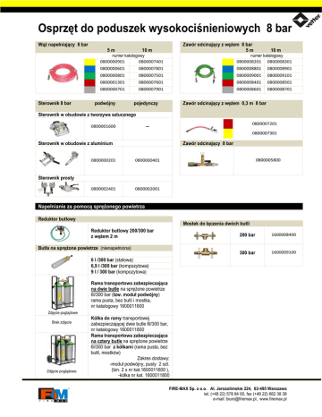 Osprzęt do poduszek wysokociśnieniowych 8 bar Wąż napełniający 8 bar 5m Sterownik 8 bar Zawór odcinający z wężem 8 bar 5m 10 m 10 m numer katalogowy 0800000901 0800007401 numer katalogowy 0800008201 0800008301 0800000601 0800007801 0800008801 0800008901 0800000801 0800007501 0800009001 0800009101 0800001301 0800007601 0800008401 0800008501 0800000701 0800007901 0800008601 0800008701 podwójny pojedynczy Zawór odcinający z wężem 0,3 m 8 bar Sterownik w obudowie z tworzywa sztucznego 0800007201 -- 0800001600 0800007301 Sterownik w obudowie z aluminium Zawór odcinający 8 bar 0800000201 0800000401 0800002401 0800002001 0800005800 Sterownik prosty Napełnianie za pomocą sprężonego powietrza Reduktor butlowy Mostek do łączenia dwóch butli Reduktor butlowy 200/300 bar z wężem 2 m Butla na sprężone powietrze (nienapełniona) 200 bar 1600008400 300 bar 1600009100 6 l /300 bar (stalowa) 6,9 l /300 bar (kompozytowa) 9 l / 300 bar (kompozytowa) Rama transportowa zabezpieczająca na dwie butle na sprężone powietrze 6l/300 bar (tzw. moduł podwójny) rama pusta, bez butli i mostka, nr katalogowy 1600011600 Zdjęcie poglądowe Brak zdjęcia Zdjęcie poglądowe Kółka do ramy transportowej zabezpieczającej dwie butle 6l/300 bar, nr katalogowy 1600011800 Rama transportowa zabezpieczająca na cztery butle na sprężone powietrze 6l/300 bar z kółkami (rama pusta, bez butli, mostków) Zakres dostawy: -moduł podwójny, pusty 2 szt. (tzn. 2 x nr kat.1600011600 ), -kółka nr kat. 1600011800 FIRE-MAX Sp. z o.o. Al. Jerozolimskie 224, 02-495 Warszawa tel. (+48 22) 578 84 00, fax (+48 22) 662 38 38 e-mail: [email protected], www.firemax.pl Napełnianie za pomocą alternatywnych źródeł powietrza dla każdego innego źródła powietrza (oprócz butli na sprężone powietrze) potrzebujesz jeden z dwóch zielonych węży doprowadzających powietrze Nr katalogowy 1600013401 Wąż doprowadzający powietrze 10m, zielony 1600013601 Wąż doprowadzający powietrze 10m, zielony, z zaworem odcinającym Nr katalogowy 1600007800 Adapter do napełniania opon samochodu ciężarowego 1600008000 Zawór do napełniania opon samoch. przy pomocy uniwersalnej pompki ręcznej/nożnej lub innego źródła powietrza Zestaw adapterów do wszystkich źródeł powietrza Nr katalogowy zestawu 1600012501 1600012900 1600007500 Skład zestawu: 1600012600 Nr katalogowy Wąż doprowadzający powietrze 10m, zielony 1600013401 Wąż doprowadzający powietrze 10m, zielony z zaworem odcinającym 1600013601 Adapter do napełniania opon samochodu ciężarowego 1600007800 Zawór do napełniania opon samoch. przy pomocy uniwersalnej pompki ręcznej/nożnej lub innego źródła powietrza 1600008000 Przyłącze zaworowe opony samochodu ciężarowego 1600012900 Adapter do pobierania powietrza z przyłącza samochodu, 2-drożny system hamulcowy 1600007500 Zaślepka (zamyka linię sterującą systemu hamulcowego) 1600012600 Adapter do sprężarki 1600012000 Adapter do instalacji sprężonego powietrza/sprężarki przenośnej 1600008200 Torba transportowa 1520002500 1600008200 Przyłącze zaworowe opony samochodu ciężarowego Adapter do pobierania powietrza z przyłącza samochodu, 2-drożny system hamulcowy Zaślepka (zamyka linię sterującą systemu hamulcowego) Adapter do stałej instalacji sprężonego powietrza /sprężarki przenośnej 1600012000 Adapter do sprężarki 1600014500 Reduktor wstępny 20 bar 1600008700 Pompka ręczna powietrza 520 cm3/1 cykl (używając jej nie potrzebujesz ani adapterów, ani węży) 1600009400 Pompka nożna powietrza 420 cm3/1 cykl (używając jej nie potrzebujesz ani adapterów, ani węży) FIRE-MAX Sp. z o.o. Al. Jerozolimskie 224, 02-495 Warszawa tel. (+48 22) 578 84 00, fax (+48 22) 662 38 38 e-mail: [email protected], www.firemax.pl