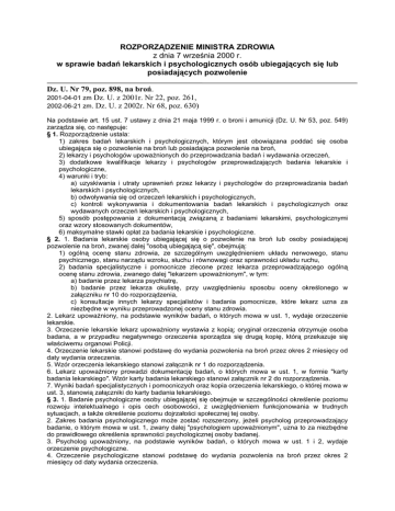 ROZPORZĄDZENIE MINISTRA ZDROWIA z dnia 7 września 2000 r. w sprawie badań lekarskich i psychologicznych osób ubiegających się lub posiadających pozwolenie Dz. U. Nr 79, poz. 898, na broń. 2001-04-01 zm Dz. U. z 2001r. Nr 22, poz. 261, 2002-06-21 zm. Dz. U. z 2002r. Nr 68, poz. 630) Na podstawie art. 15 ust. 7 ustawy z dnia 21 maja 1999 r. o broni i amunicji (Dz. U. Nr 53, poz. 549) zarządza się, co następuje: § 1. Rozporządzenie ustala: 1) zakres badań lekarskich i psychologicznych, którym jest obowiązana poddać się osoba ubiegająca się o pozwolenie na broń lub posiadająca pozwolenie na broń, 2) lekarzy i psychologów upoważnionych do przeprowadzania badań i wydawania orzeczeń, 3) dodatkowe kwalifikacje lekarzy i psychologów przeprowadzających badania lekarskie i psychologiczne, 4) warunki i tryb: a) uzyskiwania i utraty uprawnień przez lekarzy i psychologów do przeprowadzania badań lekarskich i psychologicznych, b) odwoływania się od orzeczeń lekarskich i psychologicznych, c) kontroli wykonywania i dokumentowania badań lekarskich i psychologicznych oraz wydawanych orzeczeń lekarskich i psychologicznych, 5) sposób postępowania z dokumentacją związaną z badaniami lekarskimi, psychologicznymi oraz wzory stosowanych dokumentów, 6) maksymalne stawki opłat za badania lekarskie i psychologiczne. § 2. 1. Badania lekarskie osoby ubiegającej się o pozwolenie na broń lub osoby posiadającej pozwolenie na broń, zwanej dalej "osobą ubiegającą się", obejmują: 1) ogólną ocenę stanu zdrowia, ze szczególnym uwzględnieniem układu nerwowego, stanu psychicznego, stanu narządu wzroku, słuchu i równowagi oraz sprawności układu ruchu, 2) badania specjalistyczne i pomocnicze zlecone przez lekarza przeprowadzającego ogólną ocenę stanu zdrowia, zwanego dalej "lekarzem upoważnionym", w tym: a) badanie przez lekarza psychiatrę, b) badanie przez lekarza okulistę, przy uwzględnieniu sposobu oceny określonego w załączniku nr 10 do rozporządzenia, c) konsultacje innych lekarzy specjalistów i badania pomocnicze, które lekarz uzna za niezbędne w wyniku przeprowadzonej oceny stanu zdrowia. 2. Lekarz upoważniony, na podstawie wyników badań, o których mowa w ust. 1, wydaje orzeczenie lekarskie. 3. Orzeczenie lekarskie lekarz upoważniony wystawia z kopią; oryginał orzeczenia otrzymuje osoba badana, a w przypadku negatywnego orzeczenia sporządza się drugą kopię, którą przekazuje się właściwemu organowi Policji. 4. Orzeczenie lekarskie stanowi podstawę do wydania pozwolenia na broń przez okres 2 miesięcy od daty wydania orzeczenia. 5. Wzór orzeczenia lekarskiego stanowi załącznik nr 1 do rozporządzenia. 6. Lekarz upoważniony prowadzi dokumentację badań, o których mowa w ust. 1, w formie "karty badania lekarskiego". Wzór karty badania lekarskiego stanowi załącznik nr 2 do rozporządzenia. 7. Wyniki badań specjalistycznych i pomocniczych oraz kopia orzeczenia lekarskiego, o której mowa w ust. 3, stanowią załączniki do karty badania lekarskiego. § 3. 1. Badanie psychologiczne osoby ubiegającej się obejmuje w szczególności określenie poziomu rozwoju intelektualnego i opis cech osobowości, z uwzględnieniem funkcjonowania w trudnych sytuacjach, a także określenie poziomu dojrzałości społecznej tej osoby. 2. Zakres badania psychologicznego może zostać rozszerzony, jeżeli psycholog przeprowadzający badanie, o którym mowa w ust. 1, zwany dalej "psychologiem upoważnionym", uzna to za niezbędne do prawidłowego określenia sprawności psychologicznej osoby badanej. 3. Psycholog upoważniony, na podstawie wyników badań, o których mowa w ust. 1 i 2, wydaje orzeczenie psychologiczne. 4. Orzeczenie psychologiczne stanowi podstawę do wydania pozwolenia na broń przez okres 2 miesięcy od daty wydania orzeczenia. 5. Wzór orzeczenia psychologicznego stanowi załącznik nr 3 do rozporządzenia. 6. Orzeczenie psychologiczne psycholog upoważniony wystawia z kopią; oryginał orzeczenia otrzymuje osoba badana, a w przypadku negatywnego orzeczenia sporządza się drugą kopię, którą przekazuje się właściwemu organowi Policji. 7. Dokumentację badań psychologicznych stanowią wyniki badań przeprowadzonych przez psychologa w zakresie określonym rozporządzeniem; kopia orzeczenia psychologicznego stanowi załącznik do dokumentacji. § 4. 1. Lekarzem upoważnionym do przeprowadzania badań i wydawania orzeczeń lekarskich stwierdzających istnienie lub brak przeciwwskazań do dysponowania bronią jest lekarz, który posiada: 1) prawo wykonywania zawodu, 2) co najmniej pięcioletni staż pracy w zawodzie, 2a) specjalizację w dziedzinie: chorób wewnętrznych, medycyny ogólnej, medycyny rodzinnej, medycyny pracy, medycyny przemysłowej, medycyny transportu, medycyny lotniczej, medycyny kolejowej, medycyny morskiej i tropikalnej lub medycyny sportowej, 3) dodatkowe kwalifikacje z zakresu przeprowadzania badań lekarskich osób ubiegających się, 4) zaświadczenie o wpisie do rejestru prowadzonego przez komendanta wojewódzkiego Policji. 2. Komendant wojewódzki Policji prowadzi rejestr i wystawia zaświadczenie o wpisie do rejestru; wzór zaświadczenia stanowi załącznik nr 4 do rozporządzenia. 3. Lekarz upoważniony używa pieczęci, której wzór stanowi załącznik nr 5 do rozporządzenia. § 5. 1. Dodatkowe kwalifikacje, o których mowa w § 4 ust. 1 pkt 3, lekarz uzyskuje po ukończeniu z wynikiem pozytywnym szkolenia z zakresu przeprowadzania badań lekarskich i wydawania orzeczeń lekarskich osobom ubiegającym się. 2. Szkolenie, o którym mowa w ust. 1, obejmuje zajęcia teoretyczne i praktyczne, w wymiarze łącznym co najmniej 42 godzin, w zakresie: 1) wybranych przepisów o broni i amunicji, 2) wybranych informacji o broni, 3) zasad orzecznictwa lekarskiego, ze szczególnym uwzględnieniem przepisów prawnych dotyczących orzekania o zakresie sprawności psychofizycznej do dysponowania bron