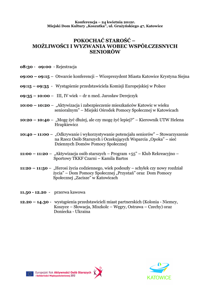 Konferencja – 24 kwietnia 2012r. Miejski Dom Kultury „Koszutka”, ul. Grażyńskiego 47, Katowice POKOCHAĆ STAROŚĆ – MOŻLIWOŚCI I WYZWANIA WOBEC WSPÓŁCZESNYCH SENIORÓW o8:30 - o9:00 - Rejestracja o9:00 – o9:15 – Otwarcie konferencji – Wiceprezydent Miasta Katowice Krystyna Siejna o9:15 – o9:35 - Wystąpienie przedstawiciela Komisji Europejskiej w Polsce o9:35 – 10:00 – III, IV wiek – dr n med. Jarosław Derejczyk 10:00 – 10:20 – „Aktywizacja i zabezpieczenie mieszkańców Katowic w wieku senioralnym” – Miejski Ośrodek Pomocy Społecznej w Katowicach 10:20 – 10:40 – „Mogę żyć dłużej, ale czy mogę żyć lepiej?” – Kierownik UTW Helena Hrapkiewicz 10:40 – 11:00 – „Odkrywanie i wykorzystywanie potencjału seniorów” – Stowarzyszenie na Rzecz Osób Starszych i Oczekujących Wsparcia „Opoka” – sieć Dziennych Domów Pomocy Społecznej 11:00 – 11:20 – „Aktywizacja osób starszych – Program +55” – Klub Rekreacyjno – Sportowy TKKF Czarni – Kamila Bartos 11:20 – 11:50 – „Herosi życia codziennego, wiek podeszły – schyłek czy nowy rozdział życia” – Dom Pomocy Społecznej „Przystań” oraz Dom Pomocy Społecznej „Zacisze” w Katowicach 11.50 - 12.20 - przerwa kawowa 12.20 – 14.30 - wystąpienia przedstawicieli miast partnerskich (Kolonia - Niemcy, Koszyce – Słowacja, Miszkolc – Węgry, Ostrawa – Czechy) oraz Doniecka - Ukraina