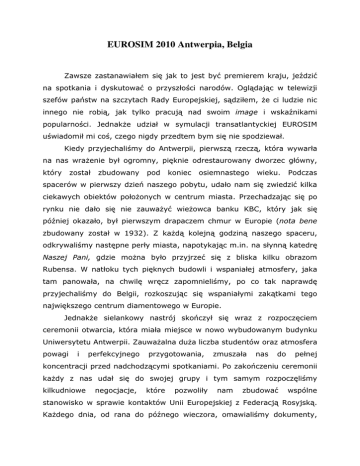 EUROSIM 2010 Antwerpia, Belgia Zawsze zastanawiałem się jak to jest być premierem kraju, jeździć na spotkania i dyskutować o przyszłości narodów. Oglądając w telewizji szefów państw na szczytach Rady Europejskiej, sądziłem, że ci ludzie nic innego nie robią, jak tylko pracują nad swoim image i wskaźnikami popularności. Jednakże udział w symulacji transatlantyckiej EUROSIM uświadomił mi coś, czego nigdy przedtem bym się nie spodziewał. Kiedy przyjechaliśmy do Antwerpii, pierwszą rzeczą, która wywarła na nas wrażenie był ogromny, pięknie odrestaurowany dworzec główny, który został zbudowany pod koniec osiemnastego wieku. Podczas spacerów w pierwszy dzień naszego pobytu, udało nam się zwiedzić kilka ciekawych obiektów położonych w centrum miasta. Przechadzając się po rynku nie dało się nie zauważyć wieżowca banku KBC, który jak się później okazało, był pierwszym drapaczem chmur w Europie (nota bene zbudowany został w 1932). Z każdą kolejną godziną naszego spaceru, odkrywaliśmy następne perły miasta, napotykając m.in. na słynną katedrę Naszej Pani, gdzie można było przyjrzeć się z bliska kilku obrazom Rubensa. W natłoku tych pięknych budowli i wspaniałej atmosfery, jaka tam panowała, na chwilę wręcz zapomnieliśmy, po co tak naprawdę przyjechaliśmy do Belgii, rozkoszując się wspaniałymi zakątkami tego największego centrum diamentowego w Europie. Jednakże sielankowy nastrój skończył się wraz z rozpoczęciem ceremonii otwarcia, która miała miejsce w nowo wybudowanym budynku Uniwersytetu Antwerpii. Zauważalna duża liczba studentów oraz atmosfera powagi i perfekcyjnego przygotowania, zmuszała nas do pełnej koncentracji przed nadchodzącymi spotkaniami. Po zakończeniu ceremonii każdy z nas udał się do swojej grupy i tym samym rozpoczęliśmy kilkudniowe negocjacje, które pozwoliły nam zbudować wspólne stanowisko w sprawie kontaktów Unii Europejskiej z Federacją Rosyjską. Każdego dnia, od rana do późnego wieczora, omawialiśmy dokumenty, wymienialiśmy poglądy oraz zawiązywaliśmy koalicje, by móc wspólnie wypracować końcowy dokument, który położyłby podwaliny pod przyszłą współpracę z Federacją Rosyjską. Podczas tych obrad każdy z uczestników symulacji traktował swoją rolę bardzo poważnie. Tym samym atmosfera, która panowała w każdej z sal, była wręcz identyczna jak w prawdziwych obradach Rady Europejskiej czy Rady Unii Europejskiej. Ten wysoki poziom realizmu wpływał na uczestników, którzy czasami wręcz zmieniając tonację głosu i mowę ciała próbowali przeforsować swój punkt widzenia, a więc punkt widzenia kraju, który reprezentowali – zapominając całkowicie o własnej narodowości. Uwieńczeniem tych kilkudniowych ciężkich prac był wieczorny bankiet w ratuszu w przeddzień zakończenia symulacji, wydany przez prezydenta miasta Antwerpii. Sam prezydent nie był na nim obecny, jednakże zostaliśmy ciepło przywitani przez jednego z członków rady miasta. Sam ratusz jak i jego całe wnętrze zostało wybudowane na przełomie siedemnastego i osiemnastego wieku. Pozłacane sale, marmurowe wykończenia oraz piękne obrazy, powodowały, że czuliśmy się jak na dworze króla. Do tego wszystkiego wykwintne potrawy oraz kelnerzy reagujący na każde skinienie, sprawiły, że nie mogliśmy się wręcz nacieszyć atmosferą tego wieczoru. W ostatni dzień symulacji wypracowywaliśmy ostatnie uzgodnienia i poddaliśmy naszą kilkudniową pracę pod oficjalne głosowanie. Najbardziej ucieszyła mnie informacja, że dokumenty, które udało nam się wspólnie stworzyć, zostaną przesłane do Brukseli. Tym samym, nasza praca nie poszła na marne, co więcej, może być realnie wykorzystywana w polepszaniu działań międzynarodowych i polityki zewnętrznej Unii Europejskiej. Teraz, bogatszy o doświadczenie, zrozumiałem, że nie jest wcale łatwo być głową państwa, a tym bardziej negocjować interesy swojego narodu. Symulacja EUROSIM w Belgii uświadomiła mi, jak szalenie ważna jest dyplomacja, zrozumienie, a przede wszystkim znalezienie wspólnego języka w środowisku międzynarodowym. Bez tych czynników, nie byłoby możliwe utworzenie Wspólnoty Węgla i Stali, która dała początek temu, co dzisiaj nazywamy Unią Europejską, a może za niedługo nazwiemy Państwem Europejskim. Andrzej Świdziński Student III roku Stosunków Międzynarodowych Dolnośląska Szkoła Wyższa