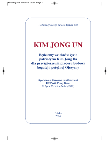 KimJongUn3 16/07/14 09:31 Page 1 Robotnicy całego świata, łączcie się! KIM JONG UN Będziemy wcielać w życie patriotyzm Kim Jong Ila dla przyspieszenia procesu budowy bogatej i potężnej Ojczyzny Spotkanie z kierowniczymi kadrami KC Partii Pracy Korei 26 lipca 101 roku Juche (2012) Polska 2014 KimJongUn3 16/07/14 09:31 Page 2 KimJongUn3 16/07/14 09:31 Page 3 Dzisiaj my urzeczywistniamy wielkie dzieło – dzieło budowy potężnego i rozkwitającego socjalistycznego państwa. I w tym procesie bardzo ważne jest, by wcielać w życie patriotyzm Kim Jong Ila. Wcześniej, posługując się podawanymi mi już przypadkami, poważnie mówiłem o patriotyzmie Kim Jong Ila. Jednak, niestety, nasze kierownicze kadry na razie nie posiadają głębokiego zrozumienia patriotyzmu Kim Jong Ila oraz nie umieją prawidłowo, metodycznie i efektywnie poprowadzić pracy mającej na celu wcielenia go w praktyce. Akcentujemy patriotyzm Kim Jong Ila nie dlatego, aby wykrzykiwać jego idee jak hasła, czy nieść go jak sztandar. Naszym celem jest, aby kadry kierownicze, członkowie partii, wszyscy ludzie pracy zapoznali się ze wspaniałymi wzorcami patriotyzmu prezentowanymi osobiście przez wielkiego Kim Jong Ila i konsekwentnie zastosowali go w swojej działalności w imię budowania bogatej i potężnej Ojczyzny. Towarzysz Kim Jong Il - niezrównany patriota. Jak nikt inny gorąco kochał swoją Ojczyznę i naród, poświęcił całe swoje życie sprawie pomnażania bogactwa i potęgi Ojczyzny, jej rozkwitowi i szczęściu narodu, dokonał nieśmiertelnych czynów, które, jako nieprzemijające stronice weszły do historii Ojczyzny. W jego sercu zawsze, gdzie by się nie znajdował, jak świętość zachowywały się obrazy ukochanej Ojczyzny i narodu. Widząc gęste lasy i przestrzeń wspaniale uporządkowanych pól, rysował w myślach jutrzejszy dzień Oj3 KimJongUn3 16/07/14 09:31 Page 4 czyzny wróżący dostatek, potęgę i rozkwit, przyszłe szczęście naszego narodu, którym pokolenia będą się delektować i cichutko, z serdecznością mówił jakby do siebie: „zielone góry”, „zielone pola”. A w podróżach zagranicznych zdarzało się, że całkowicie opanowany tęsknotą za daleką Ojczyzną i swoim narodem, z wielkim przejęciem wołał: „nasza Ojczyzna!”, „nasz naród!”. Widząc w trakcie jakiejś inspekcji góry z rzadko rosnącymi drzewami, z bólem serca, z przejęciem opowiadał: z dawien dawna nasz kraj nazywał się i nazywa „wyszytą jedwabiem przepiękną ziemią rozciągniętą na trzy tysiące ri”, co znaczy, że powinniśmy lepiej zagospodarowywać nasz kraj rodzinny, jak przystoi „wyszytej jedwabiem przepięknej ziemi” w epoce Partii Pracy i przekazać ją w takim stanie naszym potomkom. A zobaczywszy wokół miejsca dyslokacji jednostki wojskowej góry obsadzone drzewami, o które dbają ręce żołnierzy Armii Ludowej, cieszył się bezgranicznie i wysoko oceniając poczucie patriotyzmu żołnierzy przyznawał im wysoki tytuł – „jednostka patriotów”. Zobaczywszy przytulną wioskę i koszary tonące w morzu moreli i kaki, radośnie się uśmiechając, z rozrzewnieniem nazywał je po ludowemu: „Wioska z morelami”, „Kompania z drzewami kaki”. Od pierwszych dni swojej działalności rewolucyjnej, uskrzydlony twardym postanowieniem bycia gospodarzem odpowiedzialnym za sprawę rewolucji koreańskiej, poświęcił całe swoje życie, całego siebie, sprawie obrony socjalistycznej Ojczyzny i sławienia jej godności, do ostatnich minut swojego życia szedł i szedł drogą pat4 KimJongUn3 16/07/14 09:31 Page 5 riotycznego, pełnego poświęcenia służeniu Ojczyźnie i narodowi. Walka w obronie socjalistycznej Ojczyzny była najbardziej zaciętą konfrontacją z koalicyjnymi siłami imperializmu, bezprecedensową w historii najbezwzględniejszą bitwą. Aby pokonać trudną, ciężką sytuację, która wytworzyła się w Ojczyźnie i obronić Ojczyznę, Towarzysz Kim Jong Il wszedł na drogę walki na śmierć i życie – na nielekki marsz Songun. O tym, jaką ciężką drogę przeszedł on z patriotycznym poświęceniem w imię obrony socjalistycznej Ojczyzny, jednoznacznie świadczy jego jedyna watowana kurtka, którą nosił już od okresu „Trudnego marszu” do ostatnich dni swojego życia. O ile pamiętam, pewnego roku, on, nie bez wzruszenia wspominając dni, kiedy przezwyciężył ciężkie próby, nagle zaczął opowiadać o swojej watowanej kurtce, którą właśnie miał na sobie. Z przejęciem mówił: tę watowaną kurtkę zacząłem nosić od tego czasu, gdy po utracie kochanego wodza weszliśmy na drogę „Trudnego marszu”; nie mogę zapomnieć tej ciężkiej historii i dlatego teraz nie zdejmuję jej; ta watowana kurtka, powiedziałbym, jest symbolem rewolucji Songun. Wszyscy wiedzą, że watowana kurtka staje się coraz cieńsza, jeśli nosić ją przez długi czas i nie chroni przed mrozem. A on w takiej cienkiej kurtce nie tyle myślał o przenikliwym chłodzie i mrozie, co rozpalał się gorącym poczuciem obowiązku stania na straży Ojczyzny. I ponad dziesięć lat chodził w tej jedynej watowanej kurtce, i przejawiając żelazną wolę i ponadludzką energię, odwiedzał najdalsze posterunki obrony Oj5 KimJongUn3 16/07/14 09:31 Page 6 czyzny oraz otaczając troską swoich żołnierzy wykuwał z nich śmiałków gotowych walczyć z przeciwnikiem w myśl zasady „jeden przeciwko stu”. W srogie śnieżne zamiecie szedł i szedł do żołnierzy pokonując stromą przełęcz Chol oraz góry Osong i przecinając fale wzburzonego morza płynął na wyspę Cho. Te i wszystkie inne wysunięte posterunki obrony Ojczyzny będą świadkami jego patriotycznego poświęcenia w marszu Songun. Dzięki jego mądremu przywództwu nasza Ojczyzna pozbawiona przed stu laty swojej państwowości w wyniku słabości jej sił militarnych, teraz demonstruje przed całym światem swój imponujący wizerunek jako światowej potęgi