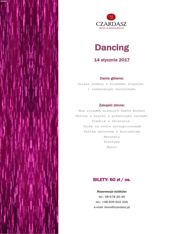 Dancing 14 stycznia 2017 Danie główne: Gulasz podany z kluskami śląskimi i zasmażanymi buraczkami Zakąski zimne: Mix roladek mięsnych Szefa Kuchni Rulony z szynki z pikantnymi serkami Śledzik w śmietanie Jajka na sosie szczypiorkowym Sałtka gyrosowa z kurczakiem Marynaty Pieczywo Masło BILETY: 60 zł / os. Rezerwacje stolików: tel.: 58 678 20 40 tel.: +48 609 610 335 e-mail: [email protected]
