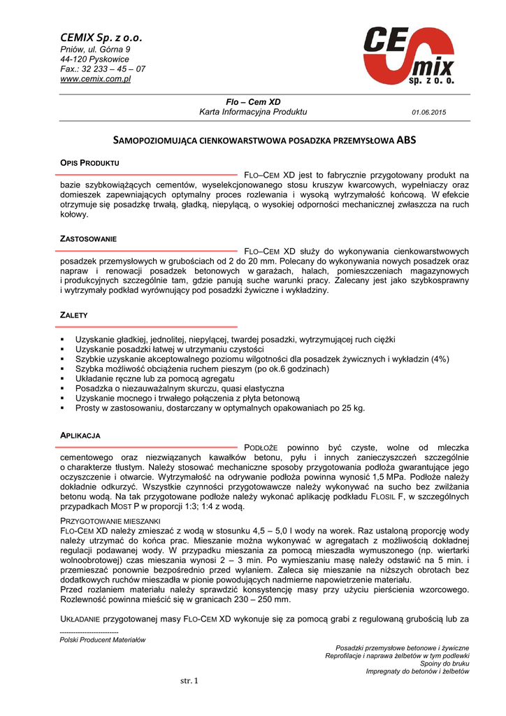 CEMIX Sp. z o.o. Pniów, ul. Górna 9 44-120 Pyskowice Fax.: 32 233 – 45 – 07 www.cemix.com.pl Flo – Cem XD Karta Informacyjna Produktu 01.06.2015 SAMOPOZIOMUJĄCA CIENKOWARSTWOWA POSADZKA PRZEMYSŁOWA ABS OPIS PRODUKTU FLO–CEM XD jest to fabrycznie przygotowany produkt na bazie szybkowiążących cementów, wyselekcjonowanego stosu kruszyw kwarcowych, wypełniaczy oraz domieszek zapewniających optymalny proces rozlewania i wysoką wytrzymałość końcową. W efekcie otrzymuje się posadzkę trwałą, gładką, niepylącą, o wysokiej odporności mechanicznej zwłaszcza na ruch kołowy. ZASTOSOWANIE FLO–CEM XD służy do wykonywania cienkowarstwowych posadzek przemysłowych w grubościach od 2 do 20 mm. Polecany do wykonywania nowych posadzek oraz napraw i renowacji posadzek betonowych w garażach, halach, pomieszczeniach magazynowych i produkcyjnych szczególnie tam, gdzie panują suche warunki pracy. Zalecany jest jako szybkosprawny i wytrzymały podkład wyrównujący pod posadzki żywiczne i wykładziny. ZALETY Uzyskanie gładkiej, jednolitej, niepylącej, twardej posadzki, wytrzymującej ruch ciężki Uzyskanie posadzki łatwej w utrzymaniu czystości Szybkie uzyskanie akceptowalnego poziomu wilgotności dla posadzek żywicznych i wykładzin (4%) Szybka możliwość obciążenia ruchem pieszym (po ok.6 godzinach) Układanie ręczne lub za pomocą agregatu Posadzka o niezauważalnym skurczu, quasi elastyczna Uzyskanie mocnego i trwałego połączenia z płyta betonową Prosty w zastosowaniu, dostarczany w optymalnych opakowaniach po 25 kg. APLIKACJA PODŁOŻE powinno być czyste, wolne od mleczka cementowego oraz niezwiązanych kawałków betonu, pyłu i innych zanieczyszczeń szczególnie o charakterze tłustym. Należy stosować mechaniczne sposoby przygotowania podłoża gwarantujące jego oczyszczenie i otwarcie. Wytrzymałość na odrywanie podłoża powinna wynosić 1,5 MPa. Podłoże należy dokładnie odkurzyć. Wszystkie czynności przygotowawcze należy wykonywać na sucho bez zwilżania betonu wodą. Na tak przygotowane podłoże należy wykonać aplikację podkładu FLOSIL F, w szczególnych przypadkach MOST P w proporcji 1:3; 1:4 z wodą. PRZYGOTOWANIE MIESZANKI FLO-CEM XD należy zmieszać z wodą w stosunku 4,5 – 5,0 l wody na worek. Raz ustaloną proporcję wody należy utrzymać do końca prac. Mieszanie można wykonywać w agregatach z możliwością dokładnej regulacji podawanej wody. W przypadku mieszania za pomocą mieszadła wymuszonego (np. wiertarki wolnoobrotowej) czas mieszania wynosi 2 – 3 min. Po wymieszaniu masę należy odstawić na 5 min. i przemieszać ponownie bezpośrednio przed wylaniem. Zaleca się mieszanie na niższych obrotach bez dodatkowych ruchów mieszadła w pionie powodujących nadmierne napowietrzenie materiału. Przed rozlaniem materiału należy sprawdzić konsystencję masy przy użyciu pierścienia wzorcowego. Rozlewność powinna mieścić się w granicach 230 – 250 mm. UKŁADANIE przygotowanej masy FLO-CEM XD wykonuje się za pomocą grabi z regulowaną grubością lub za -------------------------Polski Producent Materiałów Posadzki przemysłowe betonowe i żywiczne Reprofilacje i naprawa żelbetów w tym podlewki Spoiny do bruku Impregnaty do betonów i żelbetów str. 1 CEMIX Sp. z o.o. Pniów, ul. Górna 9 44-120 Pyskowice Fax.: 32 233 – 45 – 07 www.cemix.com.pl Flo – Cem XD Karta Informacyjna Produktu 01.06.2015 pomocą pac przeznaczonych do układania posadzek samopoziomujących. W celu odpowietrzenia ułożonej posadzki, bezpośrednio po jej rozciągnięciu, należy używać wałków kolczastych o ostrych końcach. Posadzkę wałkuje się na krzyż spokojnym jednostajnym ruchem do momentu zauważenia zmniejszonej rozlewności. Dolewanie kolejnych porcji materiału należy wykonywać w czasie nie dłuższym niż 10 minut od wylania wcześniejszej porcji materiału. Wszystkie dylatacje należy przenieść na wykonaną posadzkę. Prace należy prowadzić w suchych warunkach przy temperaturze podłoża i powietrza w granicach od 10oC do 25oC. W pomieszczeniach nie może panować przeciąg. Pielęgnacja nie jest wymagana, zaleca się jednak ochronę przez 24 godziny w przypadku silnego punktowego nasłonecznienia oraz przed przeciągiem. Nakładanie wybranych żywic oraz wykładzin można rozpocząć po upływie 12 godzin. PARAMETRY TECHNICZNE 1,7 KG/1MM GRUBOŚCI/1M2 ZUŻYCIE WYTRZYMAŁOŚĆ NA ŚCISKANIE PO 1 DNIU >20 MPA WYTRZYMAŁOŚĆ NA ŚCISKANIE PO 28 DNIACH >30 MPA WYTRZYMAŁOŚĆ NA ZGINANIE PO 28 DNIACH >7 MPA SKURCZ PO 28 DNIACH 0,05% PRZYCZEPNOŚĆ DO PODŁOŻA >1,5 MPA WOREK 25 KG, PALETA 1000 KG OPAKOWANIE 4,5 – 5 LITRÓW WODY/25 KG MIESZANIE OD 10 DO 25 OC ZAKRES STOSOWANIA OBCIĄŻANIE LEKKIM RUCHEM PIESZYM MINIMUM PO 6 GODZINACH W NORMALNYCH WARUNKACH DLA ZUŻYCIA 10 KG/M2 OBCIĄŻANIE PEŁNE PO UPŁYWIE 7 DNI KOLORY BEŻOWY PRZECHOWYWANIE DO 6MIESIĘCY W SUCHYCH I CHŁODNYCH POMIESZCZENIACH Wyrób zgodny z PN-EN 13813, badanie w warunkach laboratoryjnych -------------------------Polski Producent Materiałów Posadzki przemysłowe betonowe i żywiczne Reprofilacje i naprawa żelbetów w tym podlewki Spoiny do bruku Impregnaty do betonów i żelbetów str. 2 CEMIX Sp. z o.o. Pniów, ul. Górna 9 44-120 Pyskowice Fax.: 32 233 – 45 – 07 www.cemix.com.pl Flo – Cem XD Karta Informacyjna Produktu 01.06.2015 PIELĘGNACJA I EKSPLOATACJA POSADZKA nie wymaga pielęgnacji, należy ją chronić w szczególnych sytuacjach np.: mocne nasłonecznienie, przeciągi. Lekki ruch pieszy jest możliwy po 6 godz. od wylania posadzki. Użytkowanie techniczne posadzki powinno być ograniczone przez 12 – 24 godz. w celu ochrony przed uszkodzeniem powierzchni. Normalny ruch pieszy i wykonywanie dylatacji jest dopuszczalne po 24 – 48 godz. Posadzka może być w pełni obciążana i użytkowana po 7 dniach od wylania. Niska temperatura i wysoka wilgotność podczas układania i dojrzewania wpływa na wy