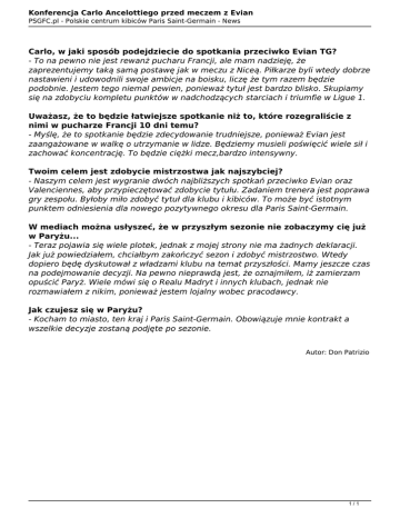 Konferencja Carlo Ancelottiego przed meczem z Evian PSGFC.pl - Polskie centrum kibiców Paris Saint-Germain - News Carlo, w jaki sposób podejdziecie do spotkania przeciwko Evian TG? - To na pewno nie jest rewanż pucharu Francji, ale mam nadzieję, że zaprezentujemy taką samą postawę jak w meczu z Niceą. Piłkarze byli wtedy dobrze nastawieni i udowodnili swoje ambicje na boisku, liczę że tym razem będzie podobnie. Jestem tego niemal pewien, ponieważ tytuł jest bardzo blisko. Skupiamy się na zdobyciu kompletu punktów w nadchodzących starciach i triumfie w Ligue 1. Uważasz, że to będzie łatwiejsze spotkanie niż to, które rozegraliście z nimi w pucharze Francji 10 dni temu? - Myślę, że to spotkanie będzie zdecydowanie trudniejsze, ponieważ Evian jest zaangażowane w walkę o utrzymanie w lidze. Będziemy musieli poświęcić wiele sił i zachować koncentrację. To będzie ciężki mecz,bardzo intensywny. Twoim celem jest zdobycie mistrzostwa jak najszybciej? - Naszym celem jest wygranie dwóch najbliższych spotkań przeciwko Evian oraz Valenciennes, aby przypieczętować zdobycie tytułu. Zadaniem trenera jest poprawa gry zespołu. Byłoby miło zdobyć tytuł dla klubu i kibiców. To może być istotnym punktem odniesienia dla nowego pozytywnego okresu dla Paris Saint-Germain. W mediach można usłyszeć, że w przyszłym sezonie nie zobaczymy cię już w Paryżu... - Teraz pojawia się wiele plotek, jednak z mojej strony nie ma żadnych deklaracji. Jak już powiedziałem, chciałbym zakończyć sezon i zdobyć mistrzostwo. Wtedy dopiero będę dyskutował z władzami klubu na temat przyszłości. Mamy jeszcze czas na podejmowanie decyzji. Na pewno nieprawdą jest, że oznajmiłem, iż zamierzam opuścić Paryż. Wiele mówi się o Realu Madryt i innych klubach, jednak nie rozmawiałem z nikim, ponieważ jestem lojalny wobec pracodawcy. Jak czujesz się w Paryżu? - Kocham to miasto, ten kraj i Paris Saint-Germain. Obowiązuje mnie kontrakt a wszelkie decyzje zostaną podjęte po sezonie. Autor: Don Patrizio 1/1 Powered by TCPDF (www.tcpdf.org)