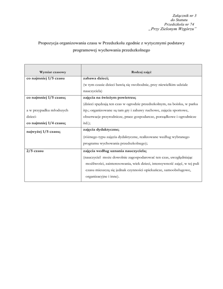 Załącznik nr 3 do Statutu Przedszkola nr 74 „Przy Zielonym Wzgórzu” Propozycja organizowania czasu w Przedszkolu zgodnie z wytycznymi podstawy programowej wychowania przedszkolnego Wymiar czasowy co najmniej 1/5 czasu Rodzaj zajęć zabawa dzieci; (w tym czasie dzieci bawią się swobodnie, przy niewielkim udziale nauczyciela) co najmniej 1/5 czasu; zajęcia na świeżym powietrzu; (dzieci spędzają ten czas w ogrodzie przedszkolnym, na boisku, w parku a w przypadku młodszych itp.; organizowane są tam gry i zabawy ruchowe, zajęcia sportowe, dzieci- obserwacje przyrodnicze, prace gospodarcze, porządkowe i ogrodnicze co najmniej 1/4 czasu; itd.); najwyżej 1/5 czasu; zajęcia dydaktyczne; (różnego typu zajęcia dydaktyczne, realizowane według wybranego programu wychowania przedszkolnego); 2/5 czasu zajęcia według uznania nauczyciela; (nauczyciel może dowolnie zagospodarować ten czas, uwzględniając możliwości, zainteresowania, wiek dzieci, intensywność zajęć, w tej puli czasu mieszczą się jednak czynności opiekuńcze, samoobsługowe, organizacyjne i inne). Załącznik nr 3a do Statutu Przedszkola nr 74 „Przy Zielonym Wzgórzu” RAMOWY ROZKŁAD DNIA REALIZACJA PODSTAWY PROGRAMOWEJ W GODZ. 800 - 1300 Zajęcia opiekuńczo - wychowawcze (w zależności od godzin pracy oddziału - w grupach 700 – 800 łączonych). Zabawy wg inwencji dzieci - kształtowanie umiejętności społecznych dzieci: porozumiewanie się z dziećmi i z dorosłymi, zgodne funkcjonowanie w zabawie i w sytuacjach zadaniowych. Praca indywidualna. Zabawa ruchowa lub ćwiczenia gimnastyczne. Kształtowanie czynności samoobsługowych, nawyków higienicznych i kulturalnych. Wdrażanie 800 - 900 dzieci do utrzymywaniu ładu i porządku. Wprowadzanie w kulturę bycia, wdrażanie do zachowań akceptowanych społecznie, wyrabianie nawyków higieniczno – kulturalnych związanych ze spożywaniem śniadania. 900 - 1000 Zajęcia dydaktyczne, realizowane według założeń nowej podstawy programowej. Tworzenie warunków do zorganizowanej aktywności ruchowej. Organizowanie pobytu dzieci w ogrodzie przedszkolnym, na boisku, w parku itp. - gry i zabawy ruchowe, zajęcia sportowe, obserwacje przyrodnicze, prace gospodarcze, porządkowe i 1000 – 1140 ogrodnicze itd.). Uczenie zasad postępowania warunkujących bezpieczeństwo dziecka w budynku, w ogrodzie i poza terenem przedszkola. Tworzenie warunków do spontanicznej i zorganizowanej aktywności ruchowej. Czynności samoobsługowe, zabiegi higieniczne, przygotowanie do obiadu. Wspieranie 1140 – 1300 samodzielnych działań dziecka, kształtowanie nawyków higienicznych i zachowań prozdrowotnych. Samodzielne spożywanie posiłku, prawidłowe posługiwanie się sztućcami, praca dyżurnych w starszych grupach; Kształtowanie zachowań prozdrowotnych – zapewnienie dzieciom różnych form relaksu w sali i w ogrodzie. Tworzenie warunków do zorganizowanej aktywności ruchowej. Gry i zabawy dydaktyczne wspomagające rozwój umysłowy dziecka. Gry i zabawy badawcze rozwijające zainteresowania otaczającym światem. 1300 – 1415 Zajęcia muzyczne, plastyczne, językowe, teatralne rozwijające uzdolnienia dzieci. Gry i zabawy ruchowe wspomagające rozwój ruchowy dziecka. Zabawy wspomagające rozwój emocjonalny i społeczny dziecka. Zajęcia edukacyjno-wyrównawcze. 1415- 1500 Wyrabianie nawyków higieniczno – kulturalnych związanych ze spożywaniem podwieczorku. Samodzielne, rzetelne wykonywanie zadań dyżurnych w grupach starszych. Zabawy dowolne, rozmowy indywidualne, praca wyrównawcza prowadzona indywidualnie i w 1500 – 1600 małych zespołach. Tworzenie sytuacji edukacyjnych rozwijających indywidualne cechy zdolności i zainteresowania. Zajęcia opiekuńczo-wychowawcze (w zależności od godzin pracy oddziału - w grupach 1600 – 1700 łączonych) - tworzenie warunków sprzyjających spontanicznej aktywności dzieci podczas wymiany informacji, dostarczanie przykładów i doświadczanie rozwiązywania sytuacji konfliktowych na zasadzie kompromisu i akceptacji potrzeb innych osób. 1300 - 1700 W różnych grupach wiekowych organizowanie zajęć dodatkowych zgodnie z potrzebami i możliwościami psychofizycznymi dzieci W trosce o optymalny rozwój dzieci obowiązkiem nauczycieli jest prowadzenie obserwacji pedagogicznych mających na celu poznanie możliwości i potrzeb rozwojowych wychowanków oraz dokumentowanie tych obserwacji. Załącznik nr 2a do Statutu Przedszkola nr 74 „Przy Zielonym Wzgórzu” RAMOWY ROZKŁAD DNIA dla dzieci młodszych (3 latki) 7.00 - 8.15 Schodzenie się dzieci w sali lub w ogrodzie, zabawy indywidualne, aranżowanie otwartych sytuacji wychowawczo- dydaktycznych, pozostawienie dzieciom możliwości wyboru i inicjatywy. Inspirowanie do spontanicznej działalności zabawowej. Praca indywidualna oraz dydaktyczno – wyrównawcza w sali lub w ogrodzie. Praca z dzieckiem zdolnym. 8.15 -8.40 Zabawy ruchowe integrujące całą grupę, czynności higieniczne. 8.40 – 9.00 Śniadanie, przestrzeganie zasad dobrego wychowania podczas spożywania posiłku, ćwiczenie umiejętności posługiwania się sztućcami, mycie zębów. 9.00 – 9.45 Zajęcia dydaktyczne w ramach realizacji programu wychowania przedszkolnego z całą grupą i w małych zespołach. Nabywanie umiejętności przez działanie, stwarzanie sytuacji edukacyjnych stymulujących wszechstronny rozwój dziecka. Organizowanie środowiska inspirującego podejmowanie zabaw tematycznych, dydaktycznych, badawczych i ruchowych. Wspieranie działań twórczych podczas kontaktu dzieci ze sztuką, muzyką i literaturą w miarę możliwości korzystanie z potrzeb specjalistów. 9.45-10.25 Zabawy swobodne wynikające z zainteresowań dzieci w sali lub w ogrodzie. 10.25-10.35 Czynności samoobsługowe w szatni, wdrażanie do samodzielności. 10.35-11.50 Pobyt na powietrzu. Zabawy dowolne i organizowane przez nauczycielki w małych grupach, rozmowy indywidualne, prace por