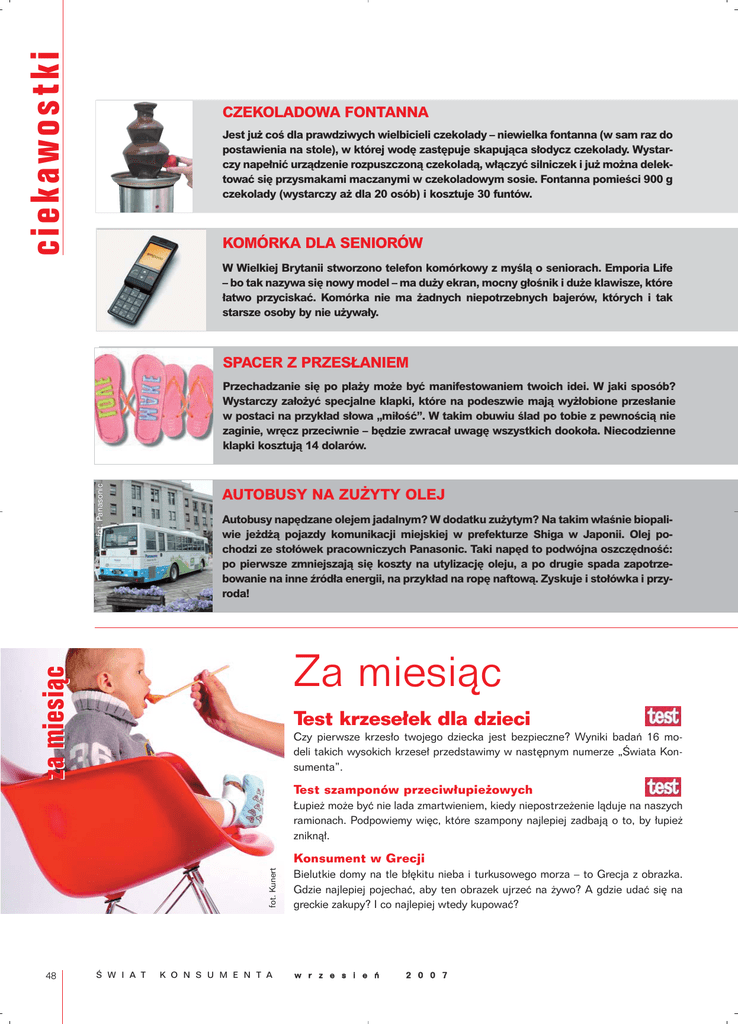 ciekawostki CZEKOLADOWA FONTANNA Jest ju˝ coÊ dla prawdziwych wielbicieli czekolady – niewielka fontanna (w sam raz do postawienia na stole), w której wod´ zast´puje skapujàca s∏odycz czekolady. Wystarczy nape∏niç urzàdzenie rozpuszczonà czekoladà, w∏àczyç silniczek i ju˝ mo˝na delektowaç si´ przysmakami maczanymi w czekoladowym sosie. Fontanna pomieÊci 900 g czekolady (wystarczy a˝ dla 20 osób) i kosztuje 30 funtów. KOMÓRKA DLA SENIORÓW W Wielkiej Brytanii stworzono telefon komórkowy z myÊlà o seniorach. Emporia Life – bo tak nazywa si´ nowy model – ma du˝y ekran, mocny g∏oÊnik i du˝e klawisze, które ∏atwo przyciskaç. Komórka nie ma ˝adnych niepotrzebnych bajerów, których i tak starsze osoby by nie u˝ywa∏y. SPACER Z PRZES¸ANIEM fot. Panasonic Przechadzanie si´ po pla˝y mo˝e byç manifestowaniem twoich idei. W jaki sposób? Wystarczy za∏o˝yç specjalne klapki, które na podeszwie majà wy˝∏obione przes∏anie w postaci na przyk∏ad s∏owa „mi∏oÊç”. W takim obuwiu Êlad po tobie z pewnoÊcià nie zaginie, wr´cz przeciwnie – b´dzie zwraca∏ uwag´ wszystkich dooko∏a. Niecodzienne klapki kosztujà 14 dolarów. AUTOBUSY NA ZU˚YTY OLEJ Autobusy nap´dzane olejem jadalnym? W dodatku zu˝ytym? Na takim w∏aÊnie biopaliwie je˝d˝à pojazdy komunikacji miejskiej w prefekturze Shiga w Japonii. Olej pochodzi ze sto∏ówek pracowniczych Panasonic. Taki nap´d to podwójna oszcz´dnoÊç: po pierwsze zmniejszajà si´ koszty na utylizacj´ oleju, a po drugie spada zapotrzebowanie na inne êród∏a energii, na przyk∏ad na rop´ naftowà. Zyskuje i sto∏ówka i przyroda! za miesiàc Za miesiàc Test krzese∏ek dla dzieci Czy pierwsze krzes∏o twojego dziecka jest bezpieczne? Wyniki badaƒ 16 modeli takich wysokich krzese∏ przedstawimy w nast´pnym numerze „Âwiata Konsumenta”. Test szamponów przeciw∏upie˝owych ¸upie˝ mo˝e byç nie lada zmartwieniem, kiedy niepostrze˝enie làduje na naszych ramionach. Podpowiemy wi´c, które szampony najlepiej zadbajà o to, by ∏upie˝ zniknà∏. fot. Kunert Konsument w Grecji 48  W I A T K O N S U M E N T A Bielutkie domy na tle b∏´kitu nieba i turkusowego morza – to Grecja z obrazka. Gdzie najlepiej pojechaç, aby ten obrazek ujrzeç na ˝ywo? A gdzie udaç si´ na greckie zakupy? I co najlepiej wtedy kupowaç? w r z e s i e ƒ 2 0 0 7