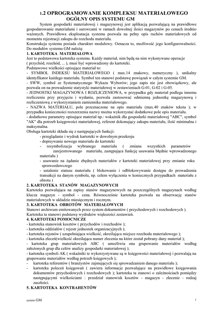 1.2 OPROGRAMOWANIE KOMPLEKSU MATERIAŁOWEGO OGÓLNY OPIS SYSTEMU GM System gospodarki materiałowej i magazynowej jest aplikacją pozwalającą na prawidłowe gospodarowanie materiałami i surowcami w ramach dowolnej ilości magazynów po cenach średnio ważonych. Prawidłowa eksploatacja systemu pozwala na pełny opis ruchów materiałowych od momentu rejestracji zakupu do rozchodu materiału. Konstrukcja systemu posiada charakter modułowy. Oznacza to, możliwość jego konfigurowalności. Do modułów systemu GM należą: 1. KARTOTEKA MATERIAŁOWA Jest to podstawowa kartoteka systemu. Każdy materiał, nim będą na nim wykonywane operacje ( przychód, rozchód, ... ), musi być wprowadzony do kartoteki. Podstawowe wielkości opisujące materiał to: - SYMBOL INDEKSU MATERIAŁOWEGO ( max.14 znakowy, numeryczny ), unikalny identyfikator każdego materiału. Symbol ten stanowi podstawę powiązań w całym systemie GM. - SWW, symbol ze Systematycznego Wykazu Wyborów; jego zapis nie jest obowiązkowy, ale pozwala on na prowadzenie statystyki materiałowej w zestawieniach G-01, G-02 i G-05. - JEDNOSTKI MAGAZYNOWA I ROZLICZENIOWA, w przypadku gdy materiał podlega innemu rozliczeniu przy przyjęciu i wydaniu, pozwala zastosować odmienną jednostkę magazynową i rozliczeniową z wykorzystaniem zamiennika materiałowego. - NAZWA MATERIAŁU, pole przeznaczone na opis materiału (max.40 znaków tekstu ); w przypadku konieczności rozszerzenia nazwy można wykorzystać dodatkowe pole opis materiału. - dodatkowe parametry opisujące materiał np.: wskażnik dla gospodarki materiałowej "ABC", symbol "AK" dla potrzeb księgowości materiałowej, referent dokonujący zakupu materiału, ilość minimalna i maksymalna. Obsługa kartoteki składa się z następujących funkcji: - przeglądanie i wydruk kartoteki w dowolnym przekroju - dopisywanie nowego materiału do kartoteki - resymbolizacja wybranego materiału ( zmiana wszystkich parametrów zarejestrowanego materiału, zastępująca funkcję usuwania błędnie wprowadzonego materiału ) - usuwanie na żądanie zbędnych materiałów z kartoteki materiałowej przy zmianie roku sprawozdawczego - ustalenie statusu materiału ( blokowanie i odblokowywanie dostępu do prowadzenia transakcji na danym symbolu, np. celem wyłączenia w koniecznych przypadkach materiału z obrotu ) 2. KARTOTEKA STANÓW MAGAZYNOWYCH Kartoteka pozwalająca na zapisy stanów magazynowych na poszczególnych magazynach według klucza magazyn - symbol - cena. Równocześnie kartoteka pozwala na obserwację stanów materiałowych w układzie miesięcznym i rocznym. 3. KARTOTEKA OBROTÓW MATERIAŁOWYCH Stanowi archiwum emitowanych przez system dokumentów ( przychodowych i rozchodowych ). Kartoteka ta stanowi podstawę wydruków większości zestawień. 4. KARTOTEKI POMOCNICZE - kartoteka stanowisk kosztów ( przychodów i rozchodów ); - kartoteka oddziałów ( rejestr jednostek organizacyjnych ); - kartoteka rejonów ( uzupełniająca wielkość, określająca miejsce rozchodu materiałowego ); - kartoteka zleceń(wielkość określająca numer zlecenia na które został pobrany dany materiał ); - kartoteka grup materiałowych ABC ( umożliwia ona grupowanie materiałów według założonych grup dla celów analizy gospodarki materiałowej ); - kartoteka symboli AK ( wskaźniki te wykorzystywane są w księgowości materiałowej i pozwalają na grupowanie materiałów według potrzeb księgowych ); - kartoteka referentów ( branżystów zajmujących się sprowadzaniem danego materiału ); - kartoteka poleceń księgowań ( zawiera informacje pozwalające na prawidłowe księgowania dokumentów przychodowych i rozchodowych ); kartoteka ta stanowi o zależnościach pomiędzy następującymi wielkościami : przedział stanowisk kosztów - magazyn - zlecenie - rodzaj zaszłości. 5. KARTOTEKA KONTRAHENTÓW system GM 1 System posiada wbudowaną kartotekę kontrahentów ( dostawcy i odbiorcy ), na wypadek gdyby w początkowym okresie lub na stałe nie funkcjonował centralny katalog kontrahentów (obejmujący również nabywców i inne podmioty prawne istotne z punktu np. rozliczeń finansowych). 6. PRZYCHODY MAGAZYNOWE Emisja dokumentów przychodowych opisanych następującymi wielkościami : indeks materiałowy, magazyn, ilość w jednostkach magazynowych, cena, referent. Pozostałe wielkości są dopisywane automatycznie, o ile nastąpiło odpowiednie przypisanie przy udziale kartotek pomocniczych. Odpowiednia dekretacja zapisu pozwala na emitowanie dokumentów stronujących ( zwrot materiału ) oraz dokumentów korygujących przychód ( w przypadku gdy wprowadzony dokument posiadał błędną ilość lub wartość ). Moduł rejestracji przychodów umożliwia dwa tryby emisji dokumentów: 1. emisja dokumentów w trybie ciągłym ( przyśpiesza wystawianie dokumentów ) 2. buforowanie dokumentów ( pozwala na zapis bez modyfikacji kartotek systemowycho weryfikacji i przeglądnięciu wszystkich dokumentów z bufora, jedną operacja można je wpisać w systemie ). Większość pól posiada wspomaganie poprzez słowniki, umożliwiające automatyczny wybór szukanych wielkości. 7. ZESTAWIENIA ANALITYCZNE PRZYCHODÓW Moduł wyposażony w odpowiedni generator, pozwala na tworzenie analitycznych zestawień dokumentów przychodowych w dowolnych przekrojach. Dodatkowo funkcja pozwala na robienie analitycznych zestawień dokumentów według wspólnego klucza numeru dowodu. 8. ROZCHODY MAGAZYNOWE Sposób obsługi dokumentów rozchodowych jest zbliżony do przychodów. Różnice dotyczą ceny rozchodu, która jest automatycznie ustalana z kartoteki stanów materiałowych i stanowi cenę średnio ważoną w systemie na danym symbolu i magazynie. Dodatkowo znaczące w module są pola opisujące kierunek rozchodu materiałowego ( oddział, rejon, zlecenie ). 9. ZESTAWIENIE ANALITYCZNE ROZCHODÓW Zestawienia rozchodowe są tworzone i obsługiwane w sposób analogiczny do zestawień przycho