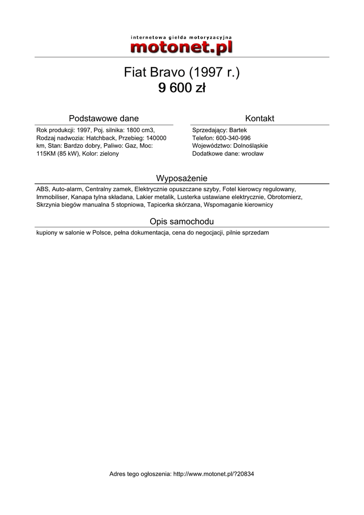 Fiat Bravo (1997 r.) 9 600 zł Podstawowe dane Kontakt Rok produkcji: 1997, Poj. silnika: 1800 cm3, Rodzaj nadwozia: Hatchback, Przebieg: 140000 km, Stan: Bardzo dobry, Paliwo: Gaz, Moc: 115KM (85 kW), Kolor: zielony Sprzedający: Bartek Telefon: 600-340-996 Województwo: Dolnośląskie Dodatkowe dane: wrocław Wyposażenie ABS, Auto-alarm, Centralny zamek, Elektrycznie opuszczane szyby, Fotel kierowcy regulowany, Immobiliser, Kanapa tylna składana, Lakier metalik, Lusterka ustawiane elektrycznie, Obrotomierz, Skrzynia biegów manualna 5 stopniowa, Tapicerka skórzana, Wspomaganie kierownicy Opis samochodu kupiony w salonie w Polsce, pełna dokumentacja, cena do negocjacji, pilnie sprzedam Adres tego ogłoszenia: http://www.motonet.pl/?20834
