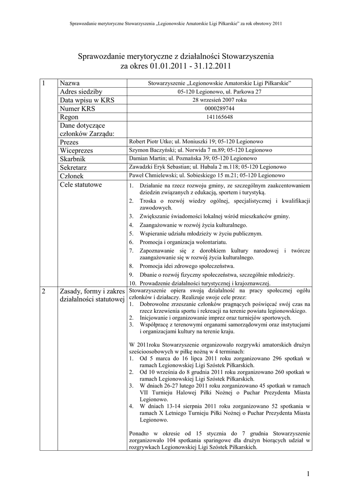 Sprawozdanie merytoryczne Stowarzyszenia „Legionowskie Amatorskie Ligi Piłkarskie” za rok obrotowy 2011 Sprawozdanie merytoryczne z działalności Stowarzyszenia za okres 01.01.2011 - 31.12.2011 1 2 Nazwa Adres siedziby Data wpisu w KRS Numer KRS Regon Dane dotyczące członków Zarządu: Prezes Wiceprezes Skarbnik Sekretarz Członek Cele statutowe Zasady, formy i zakres działalności statutowej Stowarzyszenie „Legionowskie Amatorskie Ligi Piłkarskie” 05-120 Legionowo, ul. Parkowa 27 28 wrzesień 2007 roku 0000289744 141165648 Robert Piotr Utko; ul. Moniuszki 19; 05-120 Legionowo Szymon Baczyński; ul. Norwida 7 m.89; 05-120 Legionowo Damian Martin; ul. Poznańska 39; 05-120 Legionowo Zawadzki Eryk Sebastian; ul. Hubala 2 m.118; 05-120 Legionowo Paweł Chmielewski; ul. Sobieskiego 15 m.21; 05-120 Legionowo 1. Działanie na rzecz rozwoju gminy, ze szczególnym zaakcentowaniem dziedzin związanych z edukacją, sportem i turystyką. 2. Troska o rozwój wiedzy ogólnej, specjalistycznej i kwalifikacji zawodowych. 3. Zwiększanie świadomości lokalnej wśród mieszkańców gminy. 4. Zaangażowanie w rozwój życia kulturalnego. 5. Wspieranie udziału młodzieży w życiu publicznym. 6. Promocja i organizacja wolontariatu. 7. Zapoznawanie się z dorobkiem kultury narodowej i twórcze zaangażowanie się w rozwój życia kulturalnego. 8. Promocja idei zdrowego społeczeństwa. 9. Dbanie o rozwój fizyczny społeczeństwa, szczególnie młodzieży. 10. Prowadzenie działalności turystycznej i krajoznawczej. Stowarzyszenie opiera swoją działalność na pracy społecznej ogółu członków i działaczy. Realizuje swoje cele przez: 1. Dobrowolne zrzeszanie członków pragnących poświęcać swój czas na rzecz krzewienia sportu i rekreacji na terenie powiatu legionowskiego. 2. Inicjowanie i organizowanie imprez oraz turniejów sportowych. 3. Współpracę z terenowymi organami samorządowymi oraz instytucjami i organizacjami kultury na terenie kraju. W 2011roku Stowarzyszenie organizowało rozgrywki amatorskich drużyn sześcioosobowych w piłkę nożną w 4 terminach: 1. Od 5 marca do 16 lipca 2011 roku zorganizowano 296 spotkań w ramach Legionowskiej Ligi Szóstek Piłkarskich. 2. Od 10 września do 8 grudnia 2011 roku zorganizowano 260 spotkań w ramach Legionowskiej Ligi Szóstek Piłkarskich. 3. W dniach 26-27 lutego 2011 roku zorganizowano 45 spotkań w ramach VII Turnieju Halowej Piłki Nożnej o Puchar Prezydenta Miasta Legionowo. 4. W dniach 13-14 sierpnia 2011 roku zorganizowano 52 spotkania w ramach X Letniego Turnieju Piłki Nożnej o Puchar Prezydenta Miasta Legionowo. Ponadto w okresie od 15 stycznia do 7 grudnia Stowarzyszenie zorganizowało 104 spotkania sparingowe dla drużyn biorących udział w rozgrywkach Legionowskiej Ligi Szóstek Piłkarskich. 1 Sprawozdanie merytoryczne Stowarzyszenia „Legionowskie Amatorskie Ligi Piłkarskie” za rok obrotowy 2011 W rozgrywkach organizowanych przez Stowarzyszenie w 2011 roku udział wzięło ponad 1.100 osób. 3 4 5 6 Informacje o prowadzonej Stowarzyszenie prowadzi działalność gospodarczą. działalności gospodarczej Informacja o statusie Uzyskany w dniu 8 grudnia 2008 roku. Organizacji Pożytku Publicznego Odpisy uchwał W załączeniu: Walnego Zgromadzenia podjęte 1. Kopia protokołu z Walnego Zebrania z dnia 20 stycznia 2011 r. w roku 2011 W roku sprawozdawczym przychody składały się z: Informacja o wysokości 1. Przychody statutowe 40.550,00 zł uzyskanych w tym: przychodów z wyodrębnieniem ich Organizacja imprez sportowo–rekreacyjnych 35.000,00 zł Najem boiska 5.550,00 zł źródeł 2. Pozostałe przychody operacyjne w tym: Dotacja z Urzędu Miasta Legionowo Darowizna ze Starostwa Powiatowego w Legionowie Wpływy z tytułu 1% podatku dla OPP Zwrot opłaty KRS 7 8 Informacje o poniesionych kosztach Dane o: a Liczba zatrudnionych b Łączna kwota wynagrodzeń c Wysokość przeciętnego wynagrodzenia d Wydatki na wynagrodzenie z umów-zlecenia e Udzielone pożyczki pieniężne 3. Zysk z działalności operacyjnej: 4. Odsetki bankowe: W roku sprawozdawczym koszty składały się z: 1. 2. 3. 4. 5. 6. Najem boisk Organizacja imprezy zakończenia sezonu Nagrody przekazywane zwycięzcom Składniki majątkowe na potrzeby własne Materiały i artykuły biurowe Opłaty bankowe 22.364,00 zł 15.000,00 zł 4.000,00 zł 2.714,00 zł 650,00 zł 9.204,40 zł 887,59 zł 28.973,78 zł 1.488,00 zł 18.836,70 zł 1.763,59 zł 1.621,53 zł 118,00 zł 0 nie dotyczy nie dotyczy nie dotyczy nie dotyczy 2 Sprawozdanie merytoryczne Stowarzyszenia „Legionowskie Amatorskie Ligi Piłkarskie” za rok obrotowy 2011 f g h i j Kwoty ulokowane Rachunek bieżący w Lukas Bank S.A.: • na dzień 31 grudnia 2011 roku Stowarzyszenie posiadało na rachunku na rachunkach bieżącym kwotę 38.240,04 zł. bankowych Wartości nabytych nie dotyczy obligacji i akcji Nabyte nie nabyto nieruchomości Nabyte pozostałe nie nabyto środki trwałe Wartość aktywów Aktywa na dzień 31.12.2011 38.240,04 zł i zobowiązań w tym Aktywa trwałe Aktywa obrotowe 9 Dane o działalności zleconej przez podmioty państwowe i samorządowe 10 Informacje o rozliczeniach z tytułu ciążących zobowiązań podatkowych i składanych deklaracji 0,00 zł 38.240,04 zł Zobowiązania i rezerwy na zobowiązania na dzień 4.597,78 zł 31.12.2011 Stowarzyszenie przyjmowało działalność zleconą przez podmioty samorządowe: 1. Umowa z Urzędem Miasta Legionowo z dnia 31 stycznia 2011 roku dotycząca realizacji zadania publicznego w zakresie wspierania i upowszechniania rozwoju kultury fizycznej wśród dorosłych mieszkańców miasta w dziedzinie piłka nożna w okresie od dnia 31 stycznia do dnia 31 grudnia 2011 roku. 2. Umowa Patronacka ze Starostwem Powiatowym w Legionowie z dnia 7 lutego 2011 roku dotycząca realizacji następujących zadań: • współpracy ze Starostwem Powiatowym w Legionowie w zakresie promocji piłki nożnej i upowszechniania kultury fiz