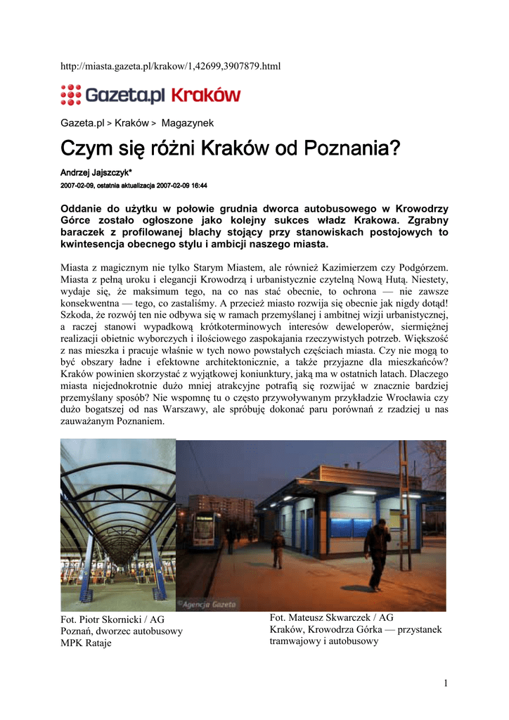 http://miasta.gazeta.pl/krakow/1,42699,3907879.html Gazeta.pl > Kraków > Magazynek Czym się różni Kraków od od Poznania? Andrzej Jajszczyk* 20072007-0202-09, ostatnia aktualizacja 20072007-0202-09 16:44 Oddanie do użytku w połowie grudnia dworca autobusowego w Krowodrzy Górce zostało ogłoszone jako kolejny sukces władz Krakowa. Zgrabny baraczek z profilowanej blachy stojący przy stanowiskach postojowych to kwintesencja obecnego stylu i ambicji naszego miasta. Miasta z magicznym nie tylko Starym Miastem, ale również Kazimierzem czy Podgórzem. Miasta z pełną uroku i elegancji Krowodrzą i urbanistycznie czytelną Nową Hutą. Niestety, wydaje się, że maksimum tego, na co nas stać obecnie, to ochrona — nie zawsze konsekwentna — tego, co zastaliśmy. A przecież miasto rozwija się obecnie jak nigdy dotąd! Szkoda, że rozwój ten nie odbywa się w ramach przemyślanej i ambitnej wizji urbanistycznej, a raczej stanowi wypadkową krótkoterminowych interesów deweloperów, siermiężnej realizacji obietnic wyborczych i ilościowego zaspokajania rzeczywistych potrzeb. Większość z nas mieszka i pracuje właśnie w tych nowo powstałych częściach miasta. Czy nie mogą to być obszary ładne i efektowne architektonicznie, a także przyjazne dla mieszkańców? Kraków powinien skorzystać z wyjątkowej koniunktury, jaką ma w ostatnich latach. Dlaczego miasta niejednokrotnie dużo mniej atrakcyjne potrafią się rozwijać w znacznie bardziej przemyślany sposób? Nie wspomnę tu o często przywoływanym przykładzie Wrocławia czy dużo bogatszej od nas Warszawy, ale spróbuję dokonać paru porównań z rzadziej u nas zauważanym Poznaniem. Fot. Piotr Skornicki / AG Poznań, dworzec autobusowy MPK Rataje Fot. Mateusz Skwarczek / AG Kraków, Krowodrza Górka — przystanek tramwajowy i autobusowy 1 Fot. Łukasz Cynalewski / AG Poznań, Stary Browar Fot. Waldek Sosnowski / AG Kraków, Galeria Kazimierz Fot. Tomasz Kamiński / AG Poznań, hotel Sheraton Obiekty komunikacji miejskiej Nieprzypadkowo przywołałem na wstępie dworzec MPK Krowodrza Górka. W Poznaniu już od lat buduje się dworce MPK zupełnie innej generacji — z zadaszonymi peronami, często o ciekawej architekturze, a także otoczone starannie zaplanowaną zielenią. Dworce takie powstały m.in. przy rondach Rataje i Śródka czy przy ul. Garbary. W dodatku realizowano je najczęściej za pieniądze nie podatników, a firm, które przy okazji mogły zbudować swoje stacje benzynowe. Kolejny, przykryty dachem miejski dworzec autobusowy o oszczędnej, ale dobrej architekturze buduje się przy pętli Poznańskiego Szybkiego Tramwaju na osiedlu Sobieskiego. 2 Nie tylko poznańskie dworce MPK są bardziej przyjazne dla użytkowników. Gdy my w Krakowie od lat dyskutujemy o parkingach podziemnych w pobliżu śródmieścia, to w samym centrum Poznania już od wiosny ubiegłego roku jest czynny taki trzypoziomowy parking na 540 samochodów. Od 2001 r. działają też w mieście nad Wartą liczne parkomaty, których w Krakowie ciągle nie możemy się doczekać. Wielopoziomowe parkingi buduje się w Poznaniu również pod nowymi budynkami biurowymi, jak na przykład przy ul. Garbary i Małe Garbary. Warto dodać, że dba się o to, by wzdłuż trasy, która brutalnie przecięła przed laty starą zabudowę, powstały reprezentacyjne budynki, które tworzą normalną miejską ulicę. Jak się to niestety różni, na przykład, od naszej chaotycznie zabudowanej Kapelanki. Centra handlowe Obiekty związane z komunikacją i transportem to nie jedyny przykład wizji i skuteczności poznaniaków. Kolejny — to galerie handlowe. W stolicy Wielkopolski powstał Stary Browar — nietuzinkowe przedsięwzięcie architektoniczne nieograniczające się wyłącznie do funkcji handlowej, ale obejmujące też galerie sztuki z ambitnym programem ekspozycyjnym, sale z projekcjami kina eksperymentalnego, sale koncertowe, powierzchnie wystawiennicze czy teatr. W 2005 r. Stary Browar zdobył pierwsze miejsce w konkursie na najlepsze centrum handlowe Europy organizowanym przez ICSC (The International Council of Shopping Centers). Jurorzy podkreślili wielką rolę działań kulturalnych, które mają miejsce w Starym Browarze, i ich oddziaływanie na społeczność lokalną. W marcu bieżącego roku zostanie oddana druga, również efektowna, część kompleksu. W Krakowie, także jako adaptacja i rozbudowa starych obiektów przemysłowych, powstała Galeria Kazimierz. Ma niewątpliwie swój urok, chociaż pierwsze publikowane w prasie rysunki, gdy przymierzano się dopiero do tej inwestycji, przedstawiały przedsięwzięcie nieporównanie bardziej ambitne. Oczywiście, krakowscy architekci z biura IMB Asymetria mieli o niebo trudniejsze zadanie niż ich poznańscy koledzy Piotr Barełkowski i Przemysław Borkowicz, za którymi stał bogaty inwestor o ambicjach wykraczających daleko poza chęć zarobienia na części handlowej. Szkoda, że w Krakowie nie mamy takich inwestorów. Wyzwaniem zarówno dla krakowskich, jak i poznańskich kupców jest rosnąca konkurencja hipermarketów. O ile ci pierwsi koncentrują się na walce z potencjalnymi inwestorami, co prowadzi do mniejszej konkurencji między dużymi centrami handlowymi i odbija się bezpośrednio na naszych kieszeniach, o tyle ci drudzy budują po prostu własne centra. Jedno z nich, o nazwie Kupiec Poznański, zlokalizowane na obrzeżu Starego Miasta, to sześciokondygnacyjny budynek o ciekawej architekturze — nowoczesnej, ale jednocześnie nawiązującej do sąsiedniej zabudowy z początków XX wieku. Budynki publiczne Gdy mówimy o architekturze, to musimy zauważyć, że w Krakowie zdecydowanie nie wykorzystujemy szans, by cieszyć oczy ich dziełami i pozostawić coś znaczącego potomnym. Porównajmy terminale lotnicze. Jakkolwiek poznańskie lotnisko Ławica jest ubogim krewnym naszych Balic, jeśli weźmiemy pod uwagę liczbę przewiezionych pasażerów czy liczbę 