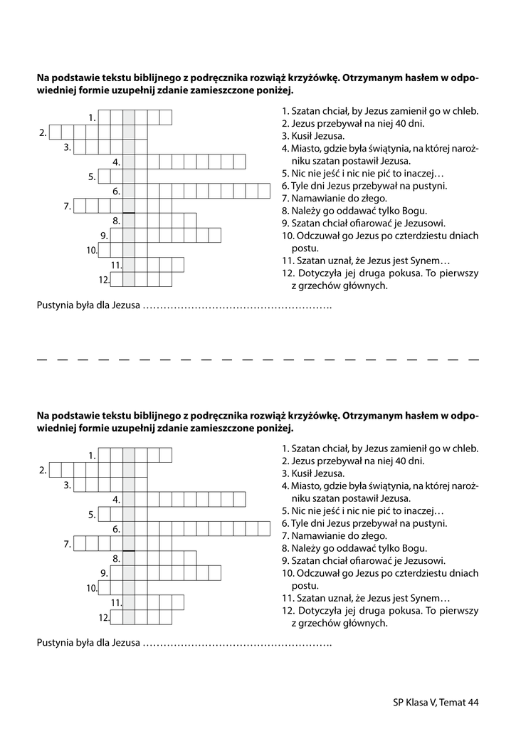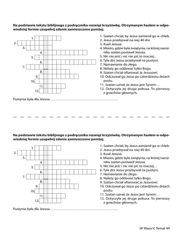 Na podstawie tekstu biblijnego z podręcznika rozwiąż krzyżówkę. Otrzymanym hasłem w odpowiedniej formie uzupełnij zdanie zamieszczone poniżej. 1. 2. 3. 4. 5. 6. 7. 8. 9. 10. 11. 12. 1. Szatan chciał, by Jezus zamienił go w chleb. 2. Jezus przebywał na niej 40 dni. 3. Kusił Jezusa. 4. Miasto, gdzie była świątynia, na której narożniku szatan postawił Jezusa. 5. Nic nie jeść i nic nie pić to inaczej… 6. Tyle dni Jezus przebywał na pustyni. 7. Namawianie do złego. 8. Należy go oddawać tylko Bogu. 9. Szatan chciał ofiarować je Jezusowi. 10. Odczuwał go Jezus po czterdziestu dniach postu. 11. Szatan uznał, że Jezus jest Synem… 12. Dotyczyła jej druga pokusa. To pierwszy z grzechów głównych. Pustynia była dla Jezusa ………………………………………………. Na podstawie tekstu biblijnego z podręcznika rozwiąż krzyżówkę. Otrzymanym hasłem w odpowiedniej formie uzupełnij zdanie zamieszczone poniżej. 1. 2. 3. 4. 5. 6. 7. 8. 9. 10. 11. 12. 1. Szatan chciał, by Jezus zamienił go w chleb. 2. Jezus przebywał na niej 40 dni. 3. Kusił Jezusa. 4. Miasto, gdzie była świątynia, na której narożniku szatan postawił Jezusa. 5. Nic nie jeść i nic nie pić to inaczej… 6. Tyle dni Jezus przebywał na pustyni. 7. Namawianie do złego. 8. Należy go oddawać tylko Bogu. 9. Szatan chciał ofiarować je Jezusowi. 10. Odczuwał go Jezus po czterdziestu dniach postu. 11. Szatan uznał, że Jezus jest Synem… 12. Dotyczyła jej druga pokusa. To pierwszy z grzechów głównych. Pustynia była dla Jezusa ………………………………………………. SP Klasa V, Temat 44 Uzupełnij tarczę do walki ze złem własnymi lub wybranymi z listy propozycjami. Sposoby walki z pokusami szatana • Modlitwa do Ducha o mądrość. • Umiejętność rozróżniania dobra i zła. • Systematyczna modlitwa. • Czytanie Pisma Świętego. • Prawdziwa przyjaźń. • Systematyczna spowiedź. • Niedzielna Msza Święta. • Przestrzeganie przykazań Bożych. • Przestrzeganie przykazań kościelnych. Uzupełnij tarczę do walki ze złem własnymi lub wybranymi z listy propozycjami. Sposoby walki z pokusami szatana • Modlitwa do Ducha o mądrość. • Umiejętność rozróżniania dobra i zła. • Systematyczna modlitwa. • Czytanie Pisma Świętego. • Prawdziwa przyjaźń. • Systematyczna spowiedź. • Niedzielna Msza Święta. • Przestrzeganie przykazań Bożych. • Przestrzeganie przykazań kościelnych. Uzupełnij tarczę do walki ze złem własnymi lub wybranymi z listy propozycjami. Sposoby walki z pokusami szatana • Modlitwa do Ducha o mądrość. • Umiejętność rozróżniania dobra i zła. • Systematyczna modlitwa. • Czytanie Pisma Świętego. • Prawdziwa przyjaźń. • Systematyczna spowiedź. • Niedzielna Msza Święta. • Przestrzeganie przykazań Bożych. • Przestrzeganie przykazań kościelnych. SP Klasa V, Temat 44