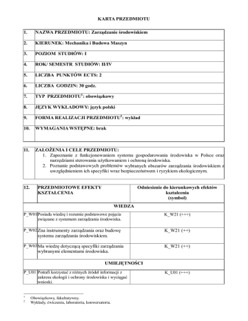 KARTA PRZEDMIOTU 1. NAZWA PRZEDMIOTU: Zarządzanie środowiskiem 2. KIERUNEK: Mechanika i Budowa Maszyn 3. POZIOM STUDIÓW: I 4. ROK/ SEMESTR STUDIÓW: II/IV 5. LICZBA PUNKTÓW ECTS: 2 6. LICZBA GODZIN: 30 godz. 7. TYP PRZEDMIOTU1: obowiązkowy 8. JĘZYK WYKŁADOWY: język polski 9. FORMA REALIZACJI PRZEDMIOTU2: wykład 10. WYMAGANIA WSTĘPNE: brak 11. ZAŁOŻENIA I CELE PRZEDMIOTU: 1. Zapoznanie z funkcjonowaniem systemu gospodarowania środowiska w Polsce oraz narzędziami sterowania użytkowaniem i ochroną środowiska. 2. Poznanie podstawowych problemów wybranych obszarów zarządzania środowiskiem z uwzględnieniem ich specyfiki wraz bezpieczeństwem i ryzykiem ekologicznym. 12. PRZEDMIOTOWE EFEKTY KSZTAŁCENIA Odniesienie do kierunkowych efektów kształcenia (symbol) WIEDZA P_W01 Posiada wiedzę i rozumie podstawowe pojęcia związane z systemem zarządzania środowiska. K_W21 (+++) P_W02 Zna instrumenty zarządzania oraz budowę K_W21 (++) systemu zarządzania środowiskiem. P_W03 Ma wiedzę dotyczącą specyfiki zarządzania K_W21 (++) wybranymi elementami środowiska. UMIEJĘTNOŚCI P_U01 Potrafi korzystać z różnych źródeł informacji z zakresu ekologii i ochrony środowiska i wyciągać wnioski. 1 2 Obowiązkowy, fakultatywny. Wykłady, ćwiczenia, laboratoria, konwersatoria. K_U01 (+++) KOMPETENCJE SPOŁECZNE P_K01 Rozumie znaczenie sprawnie działającego K_K02 systemu zarządzania dla poprawy jakości środowiska i podnoszenia ekologicznej świadomości społeczeństwa. 13. METODY OCENY EFEKTÓW KSZTAŁCENIA Symbol przedmiotowego Metody (sposoby) oceny3 efektu kształcenia Typ oceny4 Forma dokumentacji Podsumowująca Zaliczenie pisemne P_W01, P_W02, P_W03, Końcowe zaliczenie pisemne P_U01, P-K01, 14. KRYTERIA OCENY OSIĄGNIĘTYCH EFEKTÓW KSZTAŁCENIA Procentowe formy oceny: EFEKTY KSZTAŁCENIA NA OCENĘ 3,0 NA OCENĘ 3,5 NA OCENĘ 4.0 NA OCENĘ 4,5 NA OCENĘ 5,0 50-59% 60-69% 70-79% 80-89% 90-100% P_W01, P_W02, P_W03, P-K01, 15. WARUNKI UZYSKANIA ZALICZENIA PRZEDMIOTU: Osiągnięcie założonych efektów kształcenia i pozytywny wynik zaliczenia pisemnego końcowe zaliczenie na ocenę 16. TREŚCI PROGRAMOWE Forma zajęć5 (liczba godz.) Symbol przedmiotowych efektów kształcenia Podstawowe pojęcia i teoretyczne podstawy nauki o zarządzaniu środowiskiem. Modele i definicje, teoria systemów. Budowa systemu zarządzania procesami gospodarowania środowiskiem i jego organizacją. 2 P_W01 2 P_W01 Instytucje, urzędy i organizacje systemu zarządzania środowiskiem. 2 P_W01, P_W02 Treść zajęć Wykłady 1. 2. 3. 3 4 5 Ocenianie ciągłe (bieżące przygotowanie do zajęć), śródsemestralne zaliczenie pisemne, śródsemestralne zaliczenie ustne, końcowe zaliczenia pisemne, końcowe zaliczenia ustne, egzamin pisemny, egzamin ustny, praca semestralna, ocena umiejętności ruchowych, praca dyplomowa, projekt, kontrola obecności Formująca, podsumowująca. Wykłady, ćwiczenia, laboratoria, samodzielne prowadzenie zajęć przez studenta. 4. Polityka ekologiczna Polski i Unii Europejskiej. 2 P_W01, P_W02 5. System informacji ekologicznej w zarządzaniu środowiskiem. 2 P_W01, P_W02 6. System programowania i planowania środowiskowego. 2 P_W01, P_W02 7. Regulacje ogólno prawne i instrumenty prawnoadministracyjne. 2 P_W01, P_W02 8. Ekonomiczne instrumenty zarządzania środowiskiem. 2 P_W01, P_W02 9. Instrumenty dobrowolnego stosowania i instrumenty oddziaływania społecznego. 10. Zarządzanie ochroną przyrody w Polsce. 2 P_W02, P_W03, 11. Zarządzanie gospodarką odpadami. 2 P_W02, P_W03, 12. Zarządzanie gospodarką wodną. 2 P_W02, P_W03, 13. Zarządzanie bezpieczeństwem i ryzykiem ekologicznym. 2 P_W01, P_W02, P_K01 14. Zarządzanie środowiskowe w przedsiębiorstwie. 2 P_W02 15. Koszty i korzyści systemu zarządzania środowiskowego. Zaliczenie przedmiotu 2 P_W02 17. METODY DYDAKTYCZNE: 1. 2. 3. 4. 5. 18. P_W01, P_W02 Wykład informacyjny Prezentacja multimedialna Praca własna: przygotowanie do zaliczenia Dyskusja Konsultacje LITERATURA PODSTAWOWA I UZUPEŁNIAJĄCA6: Literatura podstawowa: 1. Podskrobko B. Zarządzanie środowiskiem. Polskie Wydawnictwo Ekonomiczne, Warszawa 2007. 2. Nierzwicki W. Zarządzanie środowiskowe. Polskie Wydawnictwo Ekonomiczne, Warszawa 2006. Literatura uzupełniająca: 1. Małachowski K. Gospodarka a środowisko i ekologia. Wydawnictwa CedeWu, Warszawa 2007. 2. Martyn W.: Ekologia w polityce. Wydawnictwo Officina Simonodis, Zamość 2010. 6 Dostępna w czytelni, bibliotece, Internecie. 19. OBCIĄŻENIE PRACĄ STUDENTA Forma aktywności Rodzaj zajęć b) Realizacja przedmiotu: ćwiczenia c) Realizacja przedmiotu: laboratoria d) Egzamin e) Godziny kontaktowe nauczycielem f) Konsultacje g) ………………. Łączna liczba godzin zajęć realizowanych z udziałem prowadzącego (pkt. a +b + c + d + e…) z Zajęcia wymagające udziału prowadzącego a) Realizacja przedmiotu: wykłady Liczba godzin na zrealizowanie aktywności w semestrze 30 15 45 h) Przygotowanie się do zajęć l) ………………… 20. Samokształcenie c) i) Przygotowanie się do zaliczeń/kolokwiów j) Przygotowanie się do egzaminu/zaliczenia k) Wykonanie zadań poza uczelnią 15 Łączna liczba godzin zajęć realizowanych we własnym zakresie (pkt. h + i +j + k + l …) 15 Razem godzin (zajęcia z udziałem prowadzącego + samokształcenie) 60 Liczba punktów ECTS 2 PROWADZĄCY PRZEDMIOT (IMIĘ, NAZWISKO, ADRES E-MAIL, INSTYTUT, NR POKOJU KONSULTACJI) Bożena Niemczuk, [email protected], Instytut Przyrodniczo-Techniczny, ul. Zamoyskiego 64, 22-400 Zamość, pok. 218.
