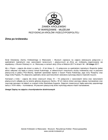 ZAMEK KRÓLEWSKI W WARSZAWIE - MUZEUM REZYDENCJA KRÓLÓW I RZECZYPOSPOLITEJ Zima po królewsku Dział Oświatowy Zamku Królewskiego w Warszawie – Muzeum zaprasza na zajęcia edukacyjne połączone z spektaklami teatralnymi oraz warsztatami tanecznymi i plastycznymi pt. Zima po królewsku, organizowane we współpracy z Biurem Edukacji m. st. Warszawy w ramach akcji Zima w Mieście 2017 w dniach 14 – 24 lutego 2017: My z Piasta – zajęcia dla dzieci w wieku 6 – 9 lat (klasy 0 – II) połączone ze spektaklem teatralnym Rzepicha (jeden aktor) odbywać się będą w stancji Arkad Kubickiego, w odtworzonym mieszkaniu służby królewskiej oraz w pracowni plastycznej w pałacu Pod Blachą. Spektakl opowiadać będzie o losach Piasta Kołodzieja, jego żony Rzepichy oraz złego króla Popiela. Po obejrzeniu spektaklu dzieci pod kierunkiem edukatora wykonają własne maskotki-myszki. Karnawał u króla – zajęcia dla dzieci starszych (klasy III – VI) połączone z warsztatami tańca oraz warsztatami plastycznymi odbędą się na terenie głównej ekspozycji Zamku. W ich trakcie dzieci poznają zabawy karnawałowe oraz zwyczaje panujące na balach w czasach króla Stanisława Augusta. Zajęciom towarzyszyć będą warsztaty popularnego tańca z XVIII wieku – kontredansa. W pracowni plastycznej dzieci wykonają własne maski karnawałowe. Uwaga! Zapisy na zajęcia u koordynatorów dzielnicowych Zamek Królewski w Warszawie - Muzeum. Rezydencja Królów i Rzeczypospolitej www.zamek-krolewski.pl