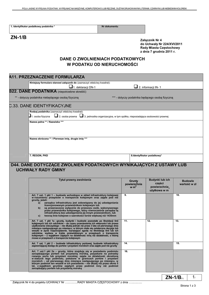 POLA JASNE WYPEŁNIA PODATNIK. WYPEŁNIAĆ NA MASZYNIE, KOMPUTEROWO LUB RĘCZNIE, DUśYMI DRUKOWANYMI LITERAMI, CZARNYM LUB NIEBIESKIM KOLOREM. 1. Identyfikator podatkowy podatnika * 2. Nr dokumentu ZN-1/B Załącznik Nr 4 do Uchwały Nr 224/XVI/2011 Rady Miasta Częstochowy z dnia 7 grudnia 2011 r. DANE O ZWOLNIENIACH PODATKOWYCH W PODATKU OD NIERUCHOMOŚCI A11. PRZEZNACZENIE FORMULARZA . Niniejszy formularz stanowi załącznik do (zaznaczyć właściwy kwadrat): 1. deklaracji DN-1 2. informacji IN- 1 B22. DANE PODATNIKA (niepotrzebne skreślić) ** - dotyczy podatnika niebędącego osobą fizyczną *** - dotyczy podatnika będącego osobą fizyczną C.33. DANE IDENTYFIKACYJNE . Rodzaj podatnika (zaznaczyć właściwy kwadrat): 1. osoba fizyczna 2. osoba prawna 3. jednostka organizacyjna, w tym spółka, nieposiadająca osobowości prawnej . Nazwa pełna ** / Nazwisko *** . Nazwa skrócona ** / Pierwsze imię, drugie imię *** 7. REGON, PKD 8.Identyfikator podatkowy* D44. DANE DOTYCZĄCE ZWOLNIEŃ PODATKOWYCH WYNIKAJĄCYCH Z USTAWY LUB UCHWAŁY RADY GMINY Tytuł prawny zwolnienia Grunty ² powierzchnia w m2 Art. 7 ust. 1 pkt 1 – budowle wchodzące w skład infrastruktury kolejowej w rozumieniu przepisów o transporcie kolejowym oraz zajęte pod nie grunty, jeŜeli: a) zarządca infrastruktury jest zobowiązany do jej udostępniania licencjonowanym przewoźnikom kolejowym lub b) są przeznaczone wyłącznie do przewozu osób, wykonywanego przez przewoźnika kolejowego, który równocześnie zarządza tą infrastrukturą bez udostępniania jej innym przewoźnikom, lub c) tworzą linie kolejowe o szerokości torów większej niŜ 1435mm 9. Art. 7 ust. 1 pkt 1a –grunty, budynki i budowle pozostałe po likwidacji linii kolejowych lub ich odcinków – do czasu przeniesienia ich własności lub prawa uŜytkowania wieczystego – nie dłuŜej jednak niŜ przez 3 lata od pierwszego dnia miesiąca następującego po miesiącu, w którym stała się ostateczna decyzja lub weszło w Ŝycie rozporządzenie, wyraŜające zgodę na likwidację linii lub ich odcinków, wydane w trybie przewidzianym w przepisach o transporcie kolejowym – z wyjątkiem zajętych na działalność inną niŜ działalność, o której mowa w przepisach o transporcie kolejowym 11. Art. 7 ust. 1 pkt 2 – budowle infrastruktury portowej, budowle infrastruktury zapewniającej dostęp do portów i przystani morskich oraz zajęte pod nie grunty 14. Art. 7 ust.1 pkt 2a – grunty, które znajdują się w posiadaniu podmiotu zarządzającego portem lub przystanią morską, pozyskane na potrzeby rozwoju portu lub przystani morskiej, zajęte na działalność określoną w statucie tego podmiotu, połoŜone w granicach portów i przystani morskich – od pierwszego dnia miesiąca następującego po miesiącu, w którym podmiot ten wszedł w ich posiadanie – nie dłuŜej niŜ przez okres 5 lat, z wyjątkiem gruntów zajętych przez podmiot inny niŜ podmiot zarządzający portem lub przystanią morską 16. Budynki lub ich części powierzchnia ² uŜytkowa w m Budowle wartość w zł 10. 12. 13. 15. ZN-1/B (1) 1/ Załącznik Nr 4 do projektu UCHWAŁY Nr …............RADY MIASTA CZĘSTOCHOWY z dnia …............. Strona 1 z 3 POLA JASNE WYPEŁNIA PODATNIK. WYPEŁNIAĆ NA MASZYNIE, KOMPUTEROWO LUB RĘCZNIE, DUśYMI DRUKOWANYMI LITERAMI, CZARNYM LUB NIEBIESKIM KOLOREM. Art. 7 ust. 1 pkt 3 – budynki, budowle i zajęte pod nie grunty na obszarze części lotniczych lotnisk uŜytku publicznego 17. (1) 19. 20. Art. 7 ust. 1 pkt 4 – budynki gospodarcze lub ich części: a) słuŜące działalności leśnej lub rybackiej, b) połoŜone na gruntach gospodarstw rolnych, słuŜące wyłącznie działalności rolniczej, c) zajęte na prowadzenie działów specjalnych produkcji rolnej ZN-1/B 18. Art. 7 ust. 1 pkt 5 – nieruchomości lub ich części zajęte na potrzeby prowadzenia przez stowarzyszenia statutowej działalności wśród dzieci i młodzieŜy w zakresie oświaty, wychowania, nauki i techniki, kultury fizycznej i sportu, z wyjątkiem wykorzystywanych do prowadzenia działalności gospodarczej, oraz grunty zajęte trwale na obozowiska i bazy wypoczynkowe dzieci i młodzieŜy 21. 22. Art. 7 ust. 1 pkt 6 – grunty i budynki wpisane indywidualnie do rejestru zabytków, pod warunkiem ich utrzymania i konserwacji zgodnie z przepisami o ochronie zabytków, z wyjątkiem części zajętych na prowadzenie działalności gospodarczej 23. 24. Art. 7 ust. 1 pkt 7 – grunty i budynki we władaniu muzeów rejestrowanych 25. 26. Art. 7 ust. 1 pkt 8 – grunty połoŜone na obszarach objętych ochroną ścisłą, czynną lub krajobrazową, a takŜe budynki i budowle trwale związane z gruntem, słuŜące bezpośrednio osiąganiu celów z zakresu ochrony przyrody- w parkach narodowych oraz w rezerwatach przyrody 27. 28. Art. 7 ust.1 pkt 8a – będące własnością Skarbu Państwa: grunty pokryte wodami jezior o ciągłym dopływie lub odpływie wód powierzchniowych oraz grunty zajęte pod sztuczne zbiorniki wodne 30. Art. 7 ust. 1 pkt 9 budowle wałów ochronnych, grunty pod wałami ochronnymi i połoŜone w międzywalach, z wyjątkiem zajętych na prowadzenie działalności gospodarczej przez inne podmioty niŜ spółki wodne, ich związki oraz związki wałowe 31. Art. 7 ust. 1 pkt 10 – grunty stanowiące nieuŜytki, uŜytki ekologiczne, grunty zadrzewione i zakrzewione, z wyjątkiem zajętych na prowadzenie działalności gospodarczej 33. Art. 7 ust. 1 pkt 11 – grunty stanowiące działki przyzagrodowe członków rolniczych spółdzielni produkcyjnych, którzy spełniają jeden z warunków: a) osiągnęli wiek emerytalny, b) są inwalidami zaliczonymi do I albo II grupy, c) są niepełnosprawnymi o znacznym lub umiarkowanym stopniu niepełnosprawności, d) są osobami całkowicie niezdolnymi do pracy w gospodarstwie rolnym albo niezdolnymi do samodzielnej egzystencji 34. 29. 32. Art. 7 ust. 1 pkt 12 – budynki połoŜone n