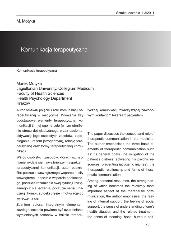 Sztuka leczenia 1-2/2011 M. Motyka Komunikacja terapeutyczna Komunikacja terapeutyczna Marek Motyka Jagiellonian University, Collegium Medicum Faculty of Health Sciences Health Psychology Department Kraków Autor omawia pojęcie i rolę komunikacji terapeutycznej w medycynie. Wymienia trzy podstawowe elementy terapeutycznej komunikacji tj. : jej ogólne cele (w tym obniżenie stresu doświadczanego przez pacjenta, aktywację jego osobistych zasobów, zapobieganie urazom jatrogennym), relację terapeutyczną oraz formy terapeutycznej komunikacji. Wśród osobistych zasobów, których wzmacnianie wydaje się najważniejszym aspektem terapeutycznej komunikacji, autor podkreśla: poczucie wewnętrznego wsparcia – siły wewnętrznej, poczucie wsparcia społecznego, poczucie rozumienia swej sytuacji i związanego z nią leczenia, poczucie sensu, nadzieję, humor, autoekspresję i motywację do wyleczenia się. Zdaniem autora, integralnym elementem każdego leczenia powinno być uzupełnianie wymienionych zasobów w trakcie terapeu- tycznej komunikacji towarzyszącej zawodowym kontaktom lekarza z pacjentem. The paper discusses the concept and role of therapeutic communication in the medicine. The author emphasises the three basic elements of therapeutic communication such as: its general goals (the mitigation of the patient’s distress, activating his psychic resources, preventing iatrogenic injuries), the therapeutic relationship and forms of therapeutic communication. Among personal resources, the strengthening of which becomes the relatively most important aspect of the therapeutic communication, the author emphasise: the feeling of internal support, the feeling of social support, the sense of understanding of one’s health situation and the related treatment, the sense of meaning, hope, humour, self73 Psychosomatic aspects of therapy and recovery expression and the motivation for recovering. As an integral element of treatment, the author recognises supplementing the listed resources of the patient in the course of therapeutic communication that accompanies professional relations of physicians with the patient. Key words: therapeutic communication, personal resources, medicine 74