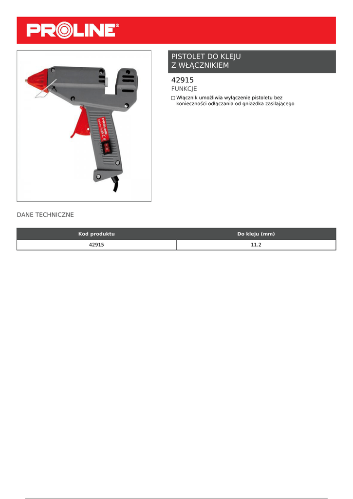 Powered by TCPDF (www.tcpdf.org) PISTOLET DO KLEJU Z WŁĄCZNIKIEM 42915 FUNKCJE Włącznik umożliwia wyłączenie pistoletu bez konieczności odłączania od gniazdka zasilającego DANE TECHNICZNE Kod produktu Do kleju (mm) 42915 11.2