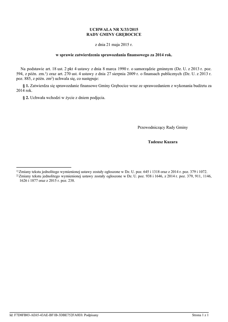 UCHWAŁA NR X/33/2015 RADY GMINY GRĘBOCICE z dnia 21 maja 2015 r. w sprawie zatwierdzenia sprawozdania finansowego za 2014 rok. Na podstawie art. 18 ust. 2 pkt 4 ustawy z dnia 8 marca 1990 r. o samorządzie gminnym (Dz. U. z 2013 r. poz. 594, z późn. zm.1) oraz art. 270 ust. 4 ustawy z dnia 27 sierpnia 2009 r. o finansach publicznych (Dz. U. z 2013 r. poz. 885, z późn. zm2) uchwala się, co następuje: § 1. Zatwierdza się sprawozdanie finansowe Gminy Grębocice wraz ze sprawozdaniem z wykonania budżetu za 2014 rok. § 2. Uchwała wchodzi w życie z dniem podjęcia. Przewodniczący Rady Gminy Tadeusz Kuzara 1] Zmiany tekstu jednolitego wymienionej ustawy zostały ogłoszone w Dz. U. poz. 645 i 1318 oraz z 2014 r. poz. 379 i 1072. tekstu jednolitego wymienionej ustawy zostały ogłoszone w Dz. U. poz. 938 i 1646, z 2014 r. poz. 379, 911, 1146, 1626 i 1877 oraz z 2015 r. poz. 238. 2] Zmiany Id: F7D8FB03-AE65-43AE-BF1B-3DBE752FA0E0. Podpisany Strona 1 z 1