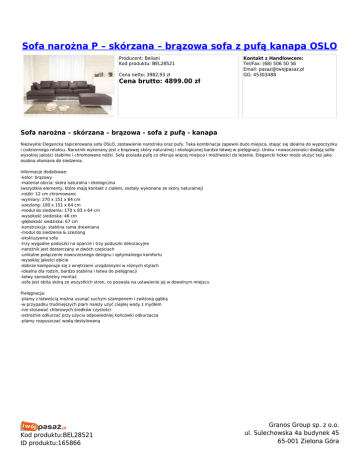 Sofa narożna P – skórzana – brązowa sofa z pufą kanapa OSLO Producent: Beliani Kod produktu: BEL28521 Cena netto: 3982,93 zł Kontakt z Handlowcem: Tel/Fax: (68) 506 50 56 Email: [email protected] GG: 45303488 Cena brutto: 4899.00 zł Sofa narożna – skórzana – brązowa - sofa z pufą - kanapa Niezwykle Elegancka tapicerowana sofa OSLO, zestawienie narożnika oraz pufy. Taka kombinacja zapewni dużo miejsca, stając się idealna do wypoczynku i codziennego relaksu. Narożnik wykonany jest z brązowej skóry naturalnej i ekologicznej bardzo łatwej w pielęgnacji. Uroku i nowoczesności dodają sofie wysokiej jakości stabilne i chromowane nóżki. Sofa posiada pufę co oferuje więcej miejsca i możliwości do leżenie. Elegancki hoker może służyć też jako osobna otomana do siedzenia. Informacje dodatkowe: -kolor: brązowy -materiał obicia: skóra naturalna i ekologiczna (wszystkie elementy, które mają kontakt z ciałem, zostały wykonane ze skóry naturalnej) -nóżki: 12 cm chromowane -wymiary: 270 x 151 x 64 cm -szezlong: 100 x 151 x 64 cm -moduł do siedzenia: 170 x 83 x 64 cm -wysokość siedziska: 46 cm -głębokość siedziska: 67 cm -konstrukcja: stabilna rama drewniana -moduł do siedzenia & szezlong -ekskluzywna sofa -trzy wygodne poduszki na oparcie i trzy poduszki dekoracyjne -narożnik jest dostarczany w dwóch częściach -unikalne połączenie nowoczesnego designu i optymalnego komfortu -wysokiej jakości obicie -dobrze komponuje się z wnętrzami urządzonymi w różnych stylach -idealna dla rodzin, bardzo stabilna i łatwa do pielęgnacji -łatwy samodzielny montaż -sofa jest obita skórą ze wszystkich stron, co pozwala na ustawienie jej w dowolnym miejscu Pielęgnacja: -plamy z łatwością można usunąć suchym szamponem i zwilżoną gąbką -w przypadku trudniejszych plam należy użyć ciepłej wody z mydłem -nie stosować chlorowych środków czystości -ostrożnie odkurzać przy użyciu odpowiedniej końcówki odkurzacza -plamy rozpuszczać wodą destylowaną Kod produktu:BEL28521 ID produktu:165866 Granos Group sp. z o.o. ul. Sulechowska 4a budynek 45 65-001 Zielona Góra