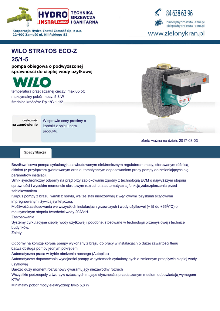 WILO STRATOS ECO-Z 25/1-5 pompa obiegowa o podwyższonej sprawności do ciepłej wody użytkowej temperatura przetłaczanej cieczy: max 65 oC maksymalny pobór mocy: 5,8 W średnica króćców: Rp 1/G 1 1/2 dostępność na zamówienie W sprawie ceny prosimy o kontakt z opiekunem produktu. oferta ważna na dzień: 2017-03-03 Bezdławnicowa pompa cyrkulacyjna z wbudowanym elektronicznym regulatorem mocy, sterowanym różnicą ciśnień (z przyłączem gwintowanym oraz automatycznym dopasowaniem pracy pompy do zmieniających się parametrów instalacji). Silnik synchroniczny odporny na prąd przy zablokowaniu zgodny z technologią ECM o najwyższym stopniu sprawności i wysokim momencie obrotowym rozruchu, z automatyczną funkcją zabezpieczenia przed zablokowaniem. Korpus pompy z brązu, wirnik z norylu, wał ze stali nierdzewnej z węglowymi łożyskami ślizgowymi impregnowanymi żywicą syntetyczną. Możliwość zastosowania we wszystkich instalacjach grzewczych i wody użytkowej (+15 do +65°C) o maksymalnym stopniu twardości wody 20°dH. Zastosowanie Systemy cyrkulacyjne ciepłej wody użytkowej i podobne, stosowane w technologii przemysłowej i technice budynków. Zalety Odporny na korozję korpus pompy wykonany z brązu do pracy w instalacjach o dużej zawartości tlenu Łatwa obsługa pompy jednym pokrętłem Automatyczna praca w trybie obniżenia nocnego (Autopilot) Automatyczne dopasowanie wydajności pompy w systemach cyrkulacyjnych o zmiennym przepływie ciepłej wody użytkowej Bardzo duży moment rozruchowy gwarantujący niezawodny rozruch Wszystkie podzespoły z tworzyw sztucznych mające styczność z przetłaczanym medium odpowiadają wymogom KTW Minimalny pobór mocy elektrycznej: tylko 5,8 W W standardzie izolacja termiczna korpusu Temperatura przetłaczanej cieczy w systemach cyrkulacji wody przy max temperaturze otoczenia +40°C: od 0 do +65 °C Napięcie zasilania 1~230 V, 50 Hz Stopień ochrony IP 44 Wersja standardowa dla ciśnienia roboczego 10 bar Wysokość podnoszenia: 1-5 m Króciec ssawny: Rp 1/G 1 1/2 Króciec tłoczny: Rp 1/G 1 1/2 Tłoczone medium : woda, czysta Woda użytkowa (maks.): +65 °C do 20 °dH Ciśnienie robocze/Ciśnienie znamionowe: PN10 Korpus: G-CuSn 5 Zn Pb Wał: Stal nierdzewna Wirnik: PP + G/F 40 % Łożysko: Grafit, impregnowany metalem Rodzaj prądu: 1~230V/50Hz Pobór mocy P1 (maks.): 5,8 W Stopień ochrony : IP 44 waga: 2,7 kg gwarancja: 24 m-ce Opiekun produktu: Andrzej Iwicki [email protected] 609 700 070