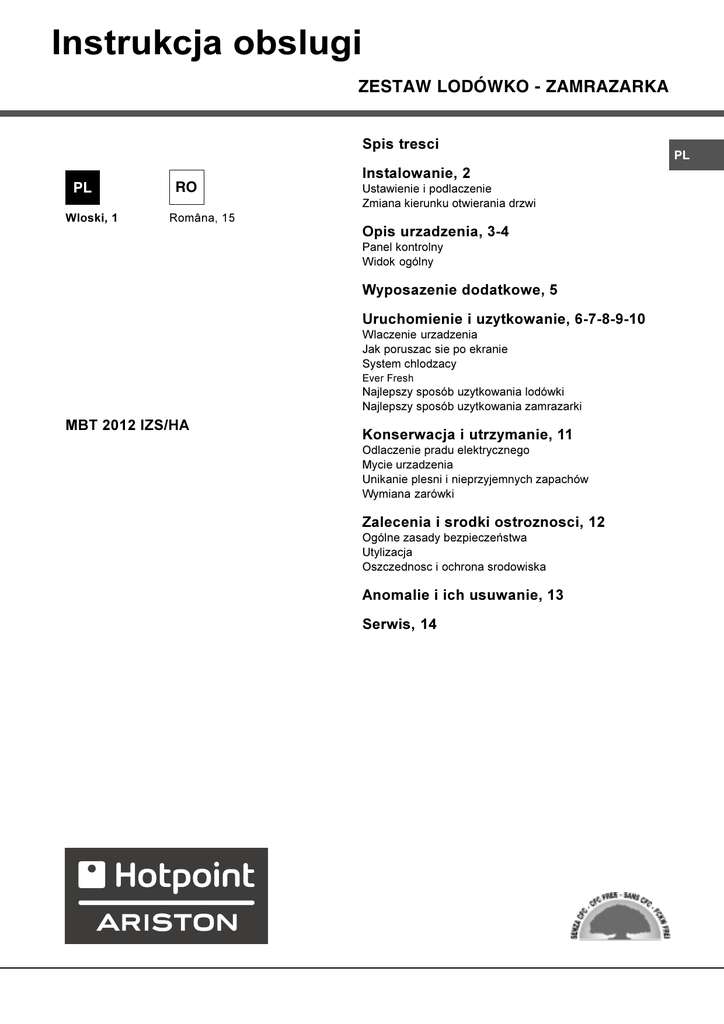 Instrukcja obslugi ZESTAW LODÓWKO - ZAMRAZARKA Spis tresci PL Wloski, 1 RO Româna, 15 Instalowanie, 2 Ustawienie i podlaczenie Zmiana kierunku otwierania drzwi Opis urzadzenia, 3-4 Panel kontrolny Widok ogólny Wyposazenie dodatkowe, 5 Uruchomienie i uzytkowanie, 6-7-8-9-10 Wlaczenie urzadzenia Jak poruszac sie po ekranie System chlodzacy Ever Fresh Najlepszy sposób uzytkowania lodówki Najlepszy sposób uzytkowania zamrazarki MBT 2012 IZS/HA Konserwacja i utrzymanie, 11 Odlaczenie pradu elektrycznego Mycie urzadzenia Unikanie plesni i nieprzyjemnych zapachów Wymiana zarówki Zalecenia i srodki ostroznosci, 12 Ogólne zasady bezpieczeñstwa Utylizacja Oszczednosc i ochrona srodowiska Anomalie i ich usuwanie, 13 Serwis, 14 PL Instalacja PL ! Nale¿y zachowaæ niniejsz¹ ksi¹¿eczkê instrukcji dla przysz³ych konsultacji. W razie sprzeda¿y, odsprzedania, czy przeniesienia urz¹dzenia w inne miejsce nale¿y upewniæ siê, by przekazane zosta³a ono razem z instrukcj¹, aby nowy w³aciciel zapoznaæ siê móg³ z dzia³aniem urz¹dzenia i z odnonymi informacjami. ! Nale¿y uwa¿nie przeczytaæ instrukcjê obs³ugi gdy¿ zawiera ona wa¿ne informacje dotycz¹ce instalacji oraz w³aciwego i bezpiecznego u¿ytkowania urz¹dzenia. Ustawienie i pod³¹czenie Ustawienie 1. Ustawiæ lodówko-zamra¿arkê w pomieszczeniu przewiewnym i nie wilgotnym. 2. Nie zas³aniaæ kratek wentylacyjnych: sprê¿arka i skraplacz wytwarzaj¹ ciep³o i wymagaj¹ dobrego przewiewu powietrza w celu w³aciwego funkcjonowania i oszczêdnoci energii elektrycznej. 3. Pomiêdzy górn¹ czêci¹ urz¹dzenia i ewentualnymi meblami pozostawiæ co najmniej 10 cm, a co najmniej 5 cm pomiêdzy ciankami bocznymi i meblami. 4. Lodówko-zamra¿arkê ustawiaæ daleko od róde³ ciep³a (promieni s³onecznych, kuchenki elektrycznej). 5. Aby utrzymaæ optyamln¹ odleg³oæ produktu od ciany mieszkania nale¿y zamontowaæ odpowiednie czêci odleg³ociowe, które znajduj¹ siê na wyposa¿eniu i wed³ug instrukcji. Wypoziomowanie 1. Ustawiæ lodówko-zamra¿arkê na pod³odze p³askiej i sztywnej. 2. Jeli pod³oga nie jest idealnie pozioma, dokonaæ kompensacji poprzez dokrêcenie lub odkrêcenie przednich nó¿ek. Pod³¹czenie do sieci elektrycznej Po transporcie ustawiæ lodówko-zamra¿arkê w pozycji pionowej, a pod³¹czyæ do sieci elektrycznej dopiero po 3 godzinach. Przed w³o¿eniem wtyczki do gniazdka sprawdziæ, czy: gniazdko posiada odpowiednie uziemienie i zgadza siê z obowi¹zuj¹cymi przepisami; wtyczka jest w stanie wytrzymaæ maksymalne obci¹¿enie mocy lodówko-zamra¿arki, jaka jest wskazana na tabliczce znamionowej, znajduj¹cej siê po lewej stronie u do³u w komorze lodówki (na przyk³ad 150W); napiêcie zasilania musi zawieraæ siê w wartociach podanych na tabliczce znamionowej, znajduj¹cej siê u do³u, po lewej stronie (na przyk³ad 220-240V); gniazdko musi byæ kompatybilne z wtyczk¹ urz¹dzenia. W przeciwnym wypadku za¿¹daæ od autoryzowanego technika wymiany wtyczki (I> patrz Serwis); nie u¿ywaæ przed³u¿aczy lub rozga³êników. ! Tak ustawiæ lodówko-zamra¿arkê, aby przewód elektryczny i gniazdko pr¹du by³y ³atwo dostêpne. ! Kabla nie wolno zginaæ i uwa¿aæ, aby nie zosta³ zgnieciony. ! Przewód elektryczny musi byæ okresowo sprawdzany i wymieniany jedynie przez autoryzowanych techników (patrz Serwis). ! W przypadku braku przestrzegania powy¿szych warunków producent zwolniony zostanie z wszelkiej odpowiedzialnoci. Zmiana kierunku otwierania drzwi W przypadku koniecznoci zmiany kierunku otwarcia drzwi nale¿y zg³osiæ siê od Serwisu Technicznego. 2 Opis urzadzenia Panel kontrolny Ekran ZAMRAzARKA Regulacja temperatury LODOWKA COOL CARE ZONE Regulacja temperatury ZAMRAzARKA Ekran ZAMRAzARKA ON/OFF PL ALARMY SUPER COOL SUPER FREEZE EVER FRESH ICE PARTY HOLIDAY I CARE ON/OFF Wduszajac ten przycisk mozliwe jest wlaczenie i wylaczenie calego urzadzenia (tak komore lodówki jak i komore zamrazarki). Czerwona dioda wskazuje, ze urzadzenie jest wylaczone, dioda zielona, ze jest wlaczone. W celu wylaczenia produktu nalezy przytrzymac wduszony przez przynajmniej 2 sekundy przycisk ON/OFF. I CARE Steruje uruchamianiem i wylaczaniem funkcji I Care (optymalna temperatura przy obnizonym zuzyciu energii). Przy uruchomieniu tej funkcji zapalaja sie jednoczesnie dioda AUTO oraz dioda I Care. ALARMY Umozliwia sygnalizacje i sterowanie wszystkimi alarmami zwiazanymi z dzialaniem urzadzenia. Child Lock Umozliwia zablokowanie przycisków panelu sterowania w celu unikniecia przypadkowego uruchomienia przez dzieci poprzez przytrzymanie przycisku ALARMY wduszonego przez 2 sekundy. Regulacja temperatury LODOWKA + i Umozliwia zmiane wyboru temperatury lodówki, wraz z odpowiednim potwierdzeniem na wyswietlaczu wybranej temperatury. Przy pomocy tych przycisków mozliwe jest takze wylaczenie samej komory lodówki (na wyswietlaczu pojawia sie - -). Regulacja temperatury ZAMRAzARKA + e Umozliwia zmiane ustawienia temperatury zamrazarki, wraz z odpowiednim potwierdzeniem na wyswietlaczu wybranej temperatury. Ekran ZAMRAzARKA Wskazuje wybrana temperature dla komory zamrazarki. COOL CARE ZONE Poprzez wduszenie przycisku mozliwe jest ustawienie 4 trybów pracy Cool Care Zone: truskawka (8°C), lody (12°C), butelka (-18° C), jesli zadna z trzech ikon nie jest wlaczona CoolCare Zone pracowac bedzie jak normalna komora zamrazarki. SUPER COOL Umozliwia uruchomienie lub wylaczenie funkcji SUPER COOL (szybkie schladzanie). Ekran lodówki wyswietla napis SC. SUPER FREEZE Umozliwia uruchomienie lub wylaczenie funkcji SUPER FREEZE (szybkie zamrazanie). Ekran ZAMRAzARKI wyswietla napis SF. EVER FRESH Umo¿liwia uruchomienie lub wy³aczenie funkcji Ever Fresh. W³¹czona dioda sygnalizuje funkcjonowanie systemu wytwarzaj¹cego pró¿niê, kiedy dioda ganie w pojemniku jest pró¿nia. Czerwona dioda sygnalizuje anomalie systemu. HOLIDAY Umozliwia uruchomienie lub wylaczenie funkcji HOLIDAY (zapala sie dioda AUTO i d