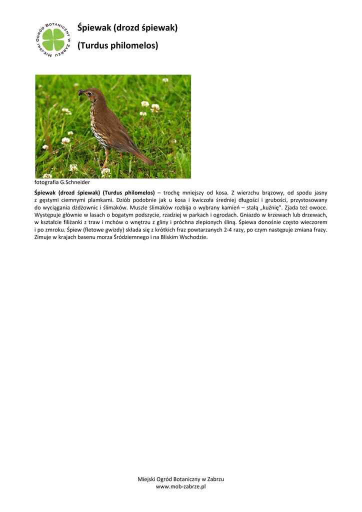 Śpiewak (drozd śpiewak) (Turdus philomelos) fotografia G.Schneider Śpiewak (drozd śpiewak) (Turdus philomelos) – trochę mniejszy od kosa. Z wierzchu brązowy, od spodu jasny z gęstymi ciemnymi plamkami. Dziób podobnie jak u kosa i kwiczoła średniej długości i grubości, przystosowany do wyciągania dżdżownic i ślimaków. Muszle ślimaków rozbija o wybrany kamień – stałą „kuźnię”. Zjada też owoce. Występuje głównie w lasach o bogatym podszycie, rzadziej w parkach i ogrodach. Gniazdo w krzewach lub drzewach, w kształcie filiżanki z traw i mchów o wnętrzu z gliny i próchna zlepionych śliną. Śpiewa donośnie często wieczorem i po zmroku. Śpiew (fletowe gwizdy) składa się z krótkich fraz powtarzanych 2‐4 razy, po czym następuje zmiana frazy. Zimuje w krajach basenu morza Śródziemnego i na Bliskim Wschodzie. Miejski Ogród Botaniczny w Zabrzu www.mob‐zabrze.pl