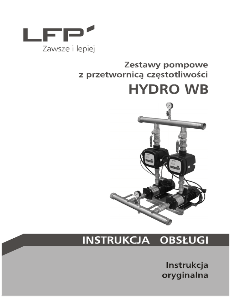 2 Spis treści 1. Informacje dotyczące bezpieczeństwa. 1.1. Informacje ogólne. 1.2. Uwagi i ostrzeżenia dotyczące bezpieczeństwa. 1.3. Kwalifikacje personelu. 2. Przeznaczenie i obszar użytkowania. 2.1. Dane techniczne. 3. Budowa zestawu. 3.1. Część pompowa. 3.2. Pompy. 3.3. Armatura. 3.4. Rama nośna. 3.5. Przetwornica PPC 50. 4. Zakres dostawy. 5. Klucz oznaczeń zestawu. 6. Zasady podłączenia i uruchomienia zestawu. 6.1. Warunki dla pomieszczeń. 6.2. Podłączenie hydrauliczne. 6.3. Podłączenie elektryczne. 6.3.1. Podłączenie zasilania do przetwornicy. 6.3.2. Podłączenie silnika pompy do przetwornicy. 6.4. Uruchomienie zestawu. 6.5. Sterowanie. 6.5.1. Zasada działania. 6.5.2. Wprowadzanie nastaw do przetwornicy. 6.5.3. Opis parametrów pracy wyświetlanych na panelu przetwornicy. 6.5.4. Nastawy użytkownika i wyświetlanie nastaw. 6.5.4.1. Wejścia dwustanowe definiowane. 6.5.4.2. Praca w systemie dwóch wartości zadanych. 6.5.4.3. Wyjścia dwustanowe. 7. Awarie. 8. Konserwacja. 8.1. Konserwacja pomp WB. 8.2. Konserwacja przetwornicy częstotliwości. 8.3. Części zamienne. 9. Serwis. 10. Przegląd zakłóceń. 11. Karta gwarancyjna. 4 4 4 4 5 5 5 5 7 8 8 8 9 9 9 9 9 10 10 11 11 11 12 13 14 16 16 16 18 19 20 20 20 20 20 21 22 3 1. INFORMACJE DOTYCZĄCE BEZPIECZEŃSTWA. 1.1. Informacje ogólne. W instrukcji obsługi zawarto istotne informacje dotyczące bezpiecznego instalowania i użytkowania wyrobu. Przed podjęciem czynności związanych z zainstalowaniem, uruchomieniem i użytkowaniem należy dokładnie przeczytać niniejszą instrukcję obsługi. Instrukcję należy zachować do przyszłego użytku w miejscu dostępnym przez obsługę. 1.2. Uwagi i ostrzeżenia dotyczące bezpieczeństwa. Instrukcja obsługi zaopatrzona jest w uwagi i ostrzeżenia dotyczące bezpieczeństwa. Znak umieszczono obok zaleceń zawartych w instrukcji, których nieprzestrzeganie może wpływać na bezpieczeństwo. Znak UWAGA umieszczono obok zaleceń zawartych w instrukcji, które należy wziąć pod uwagę ze względu na bezpieczną pracę urządzenia. W celu zapewnienia bezpieczeństwa podczas montażu, obsługi i eksploatacji należy: - stosować urządzenie zgodnie z przeznaczeniem, - nie stosować zestawu w otoczeniu zagrożonym wybuchem gazu, - podczas wykonywania prac w komorach i zbiornikach nigdy nie pracować w pojedynkę, - wykluczyć zagrożenie porażenia prądem elektrycznym, - przed przystąpieniem do wykonywania prac przy urządzeniach mogących znajdować się pod napięciem odłączyć zasilanie elektryczne przez spowodowanie widocznej przerwy, - nie zbliżać rąk do wlotu pompy i innych przedmiotów jeżeli pompa jest podłączona do zasilania elektrycznego, - przed odłączeniem przewodów silnika sprawdzić bezwzględnie, czy jest on odłączony od zasilania, odłączyć najpierw przewód fazowy, a następnie przewód ochronny, - stosować przy wymianie i naprawie wyłącznie oryginalne części zamienne. Nieprzestrzeganie tego zalecenia zwalnia producenta z odpowiedzialności za jakiekolwiek skutki mogące powstać z zastosowania innych części, - po zakończeniu prac ponownie zamontować lub załączyć wszelkie urządzenia ochronne i zabezpieczające. 1.3. Kwalifikacje personelu. Prace związane z montażem, podłączeniem do sieci elektrycznej, obsługą, konserwacją i przeglądem powinien wykonywać wykwalifikowany personel, posiadający odpowiednie uprawnienia. 4 2. Przeznaczenie i obszar użytkowania. Zestaw przeznaczony jest do tłoczenia wody czystej nieagresywnej chemicznie o pH = 6 – 8 i do podwyższania ciśnienia w instalacjach. Może być zasilany bezpośrednio z sieci wodociągowej lub też ze zbiornika otwartego przy zachowaniu napływu wody na zestaw odpowiednio do zastosowanych pomp. Zabezpieczenie przed suchobiegiem realizowane jest bezpośrednio przez przetwornicę częstotliwości. Główne obszary użytkowania: • budynki mieszkalne, • budynki użyteczności publicznej, • instalacje przemysłowe, 2.1. Dane techniczne. Typ zestawu Liczba pomp Wys. podnoszenia Max. ciś. robocze Wydajność Zakres temperatury Temperatura otoczenia Obroty silnika Średnica przyłączy - ssanie - tłoczenie HYDRO.….. WB-1 1 do 77 m 1,0 MPa do 14 m3/h do 35 oC max.40 oC 2900 min-1 25 ÷ 40 mm 40 mm HYDRO…… WB-2 2 do 77 m 1,0 MPa do 28 m3/h do 35 oC max.40 oC 2900 min-1 25 ÷ 40 mm 40 ÷ 50 mm 3. Budowa zestawu. Zestaw pompowy HYDRO składa się z jednej lub dwóch pomp, kolektorów, ramy wsporczej i sterowania. Sterowanie pompami odbywa się poprzez przetwornice częstotliwości. Szczegółowy opis budowy, zasady działania oraz sterowania znajduje się w dalszej części instrukcji obsługi. 3.1. Część pompowa. Część pompowa zestawu HYDRO to jedna lub dwie pompy z kolektorem tłocznym dla wykonania jednopompowego i ssąco-tłocznym dla wykonania dwupompowego oraz armaturą zwrotną i odcinającą. Pompy (lub pompa) znajdują się na ramie nośnej wykonanej ze stali nierdzewnej. Na kolektorze tłocznym każdej pompy umieszczona jest przetwornica częstotliwości i manometr do pomiaru ciśnienia. Rysunki 1 i 2 przedstawiają budowę zestawów jedno i dwupompowych HYDRO. 5 1. 2. 3. 4. 5. 6. 7. 8. Pompa Rama Zawór zwrotny Zawór kulowy Manometr Kolektor tłoczny Przetwornica częstotliwości Kolektor ssący 5 5 6 7 4 7 4 3 3 5 1 1 2 2 6 Rysunek 1. Zestaw HYDRO……WB-1. 8 Rysunek 2. Zestaw HYDRO…… WB-2. 6 3.2. Pompy. W skład zestawu HYDRO wchodzą pompy wirowe typoszeregu WB. Pompa typoszeregu WB jest normalnie ssącą poziomą wielostopniową pompą odśrodkową wyposażoną w standardowy silnik. Pompa posiada niewymagające konserwacji mechaniczne uszczelnienie wału. Pompa ta składa się z komory ssącej i głowicy. Komora ssąca przykręcona jest do głowicy pompy za pomocą śrub ściągających. Tabela 1. Wykonanie materiałowe. Nr Części 1. 2. 3. 4. 5. 6. 7. 8. 9. 10. Nazwa części Komora ssąca Głowica Komora Wirnik Tuleja 