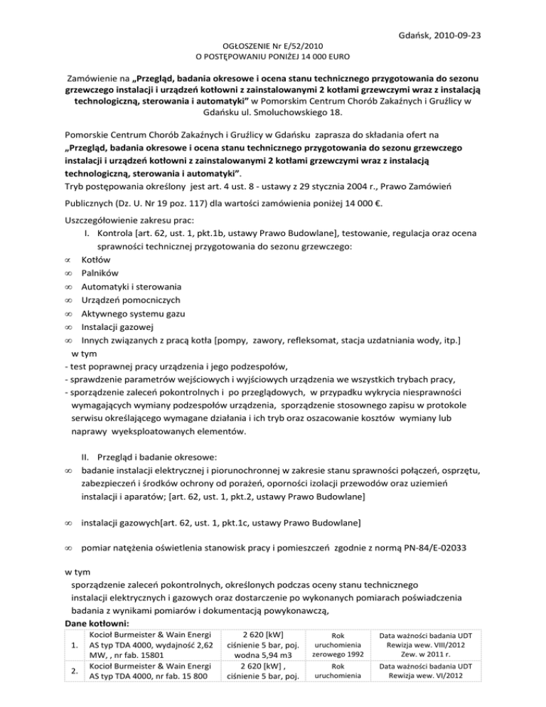 Gdańsk, 2010-09-23 OGŁOSZENIE Nr E/52/2010 O POSTĘPOWANIU PONIŻEJ 14 000 EURO Zamówienie na „Przegląd, badania okresowe i ocena stanu technicznego przygotowania do sezonu grzewczego instalacji i urządzeń kotłowni z zainstalowanymi 2 kotłami grzewczymi wraz z instalacją technologiczną, sterowania i automatyki” w Pomorskim Centrum Chorób Zakaźnych i Gruźlicy w Gdańsku ul. Smoluchowskiego 18. Pomorskie Centrum Chorób Zakaźnych i Gruźlicy w Gdańsku zaprasza do składania ofert na „Przegląd, badania okresowe i ocena stanu technicznego przygotowania do sezonu grzewczego instalacji i urządzeń kotłowni z zainstalowanymi 2 kotłami grzewczymi wraz z instalacją technologiczną, sterowania i automatyki”. Tryb postępowania określony jest art. 4 ust. 8 - ustawy z 29 stycznia 2004 r., Prawo Zamówień Publicznych (Dz. U. Nr 19 poz. 117) dla wartości zamówienia poniżej 14 000 €. Uszczegółowienie zakresu prac: I. Kontrola [art. 62, ust. 1, pkt.1b, ustawy Prawo Budowlane], testowanie, regulacja oraz ocena sprawności technicznej przygotowania do sezonu grzewczego: • Kotłów • Palników • Automatyki i sterowania • Urządzeń pomocniczych • Aktywnego systemu gazu • Instalacji gazowej • Innych związanych z pracą kotła [pompy, zawory, refleksomat, stacja uzdatniania wody, itp.] w tym - test poprawnej pracy urządzenia i jego podzespołów, - sprawdzenie parametrów wejściowych i wyjściowych urządzenia we wszystkich trybach pracy, - sporządzenie zaleceń pokontrolnych i po przeglądowych, w przypadku wykrycia niesprawności wymagających wymiany podzespołów urządzenia, sporządzenie stosownego zapisu w protokole serwisu określającego wymagane działania i ich tryb oraz oszacowanie kosztów wymiany lub naprawy wyeksploatowanych elementów. II. Przegląd i badanie okresowe: badanie instalacji elektrycznej i piorunochronnej w zakresie stanu sprawności połączeń, osprzętu, zabezpieczeń i środków ochrony od porażeń, oporności izolacji przewodów oraz uziemień instalacji i aparatów; [art. 62, ust. 1, pkt.2, ustawy Prawo Budowlane] • • instalacji gazowych[art. 62, ust. 1, pkt.1c, ustawy Prawo Budowlane] • pomiar natężenia oświetlenia stanowisk pracy i pomieszczeń zgodnie z normą PN-84/E-02033 w tym sporządzenie zaleceń pokontrolnych, określonych podczas oceny stanu technicznego instalacji elektrycznych i gazowych oraz dostarczenie po wykonanych pomiarach poświadczenia badania z wynikami pomiarów i dokumentacją powykonawczą, Dane kotłowni: 1. 2. Kocioł Burmeister & Wain Energi AS typ TDA 4000, wydajność 2,62 MW, , nr fab. 15801 Kocioł Burmeister & Wain Energi AS typ TDA 4000, nr fab. 15 800 2 620 [kW] ciśnienie 5 bar, poj. wodna 5,94 m3 2 620 [kW] , ciśnienie 5 bar, poj. Rok uruchomienia zerowego 1992 Data ważności badania UDT Rewizja wew. VIII/2012 Zew. w 2011 r. Rok uruchomienia Data ważności badania UDT Rewizja wew. VI/2012 wodna 5,94 m3 zerowego 1992 Zew. w 2011 r. 3. Palniki Max Weishaupt A/S, typ RGL 50/1-B-ZM modulowane, 2.656 Mcal/h 4. Pompy zasilające: Grundfos typ CR 4-190, silnik 4 kW 5. Pompy kondensatu : Grundfos typ CR 16-30/2 silnik 2,2 kW, poj. kondensatu 4.000 l. 6. Regulatory gazu: Max Weishaupt A/S typ 5-25/50 7. Urządzenia zabezpieczające: kontrola szczelności WO-DK 3/01, czujnik ciśnienia gazu GW 150 Instalacja elektryczna: Rodzaj zasilania: TN-C 0,4 kV, 50Hz, Miejsce badań Pomiar skut. ochr. pporaż ilość szt. Pomiar rezystancji izolacji ilość szt. Pomiar oporności inst. odgrom. ilość szt. 147 83 11 Budynek kotłowni - kotłownia - Termin realizacji: Po otrzymaniu zlecenia w przeciągu 3 tygodni. Zamówienie zostanie wystawione w terminie 7 dni od dokonania wyboru wykonawcy. Warunki płatności za wykonanie usługi: Płatność przelewem w terminie 30 dni od dostarczenia faktury z protokółem odbioru wykonanej usługi. Oferta winna zawierać : 1. Wypełniony formularz ofertowo-cenowy – zał. nr 1 2. Aktualny /wystawiony nie wcześniej niż 6 miesięcy przed upływem terminu składania ofert/ odpis z właściwego rejestru lub zaświadczenie o wpisie do ewidencji działalności gospodarczej/ podpisany przez osobę uprawnioną z adnotacją, że dane zawarte w rejestrze /ewidencji/ nie ulęgły zmianie. 3. Zaświadczenie o przyznaniu numeru identyfikacji podatkowej NIP i Regon, Kryteria oceny ofert Przy wyborze najkorzystniejszej oferty, Zamawiający będzie kierował się jedynym kryterium oceny oferty - ceną - 100%. Punkty za cenę będą obliczane wg następującego wzoru: liczba punktów = (najniższa łączna cena oferty / cena łączna danej oferty) x 100 Ceną danej oferty jest suma wyrażona w złotych polskich zawierająca podatek od towarów i usług (VAT) - wartość brutto dla przedmiotu zamówienia. Miejsca i terminy Ogłoszenie zamówienia oraz oświadczenie ofertowe - formularz ofertowy (załącznik nr 1) i wzór zlecenia (załącznik nr 2) dostępne są na stronie internetowej Zamawiającego www.pcchz.pl oraz w siedzibie Zamawiającego w Dziale Eksploatacji w budynku głównym „C” pok. 29, Pomorskiego Centrum Chorób Zakaźnych i Gruźlicy w Gdańsku, ul. Smoluchowskiego 18, w dni robocze od poniedziałku do piątku w godz. od 800 do 1400. Oferty należy składać w zamkniętych kopertach z napisem: „E/52/2010 Przegląd, badania okresowe i ocena stanu technicznego przygotowania do sezonu grzewczego instalacji i urządzeń kotłowni z zainstalowanymi 2 kotłami grzewczymi wraz z instalacją technologiczną, sterowania i automatyki” - do dnia 30.09.2010r. do godz. 1200 , w siedzibie Zamawiającego w Dziale Eksploatacji w bud. „C” pok. 29 Jawne otwarcie ofert odbędzie się dnia 30.09.2010 r. o godz. 1215 w siedzibie Zamawiającego w Dziale Eksploatacyjnym, bud. C, pok. 29. Wyniki rozstrzygnięcia postepowania zostaną zamieszczone na stronie internetowej zamawiającego w dziale zamówień publicznych o wartości do 14 tys €. Kontakt: Osoba upoważ
