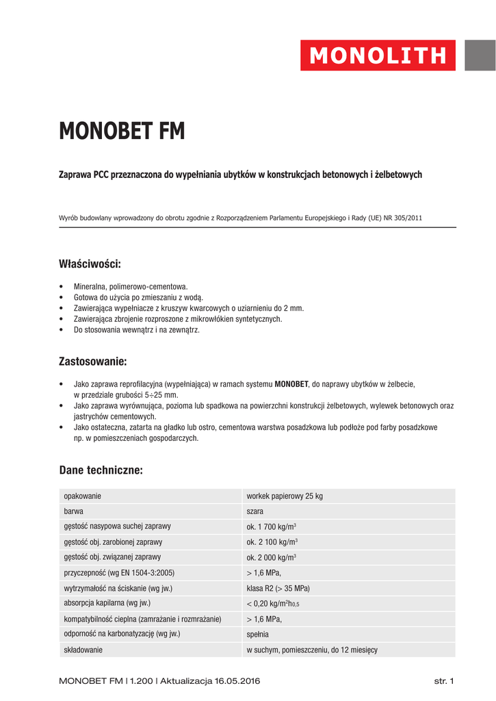 Monobet FM Zaprawa PCC przeznaczona do wypełniania ubytków w konstrukcjach betonowych i żelbetowych Wyrób budowlany wprowadzony do obrotu zgodnie z Rozporządzeniem Parlamentu Europejskiego i Rady (UE) NR 305/2011 Właściwości: • • • • • Mineralna, polimerowo-cementowa. Gotowa do użycia po zmieszaniu z wodą. Zawierająca wypełniacze z kruszyw kwarcowych o uziarnieniu do 2 mm. Zawierająca zbrojenie rozproszone z mikrowłókien syntetycznych. Do stosowania wewnątrz i na zewnątrz. Zastosowanie: • • • Jako zaprawa reprofilacyjna (wypełniająca) w ramach systemu MONOBET, do naprawy ubytków w żelbecie, w przedziale grubości 5÷25 mm. Jako zaprawa wyrównująca, pozioma lub spadkowa na powierzchni konstrukcji żelbetowych, wylewek betonowych oraz jastrychów cementowych. Jako ostateczna, zatarta na gładko lub ostro, cementowa warstwa posadzkowa lub podłoże pod farby posadzkowe np. w pomieszczeniach gospodarczych. Dane techniczne: opakowanie workek papierowy 25 kg barwa szara gęstość nasypowa suchej zaprawy ok. 1 700 kg/m3 gęstość obj. zarobionej zaprawy ok. 2 100 kg/m3 gęstość obj. związanej zaprawy ok. 2 000 kg/m3 przyczepność (wg EN 1504-3:2005) > 1,6 MPa, wytrzymałość na ściskanie (wg jw.) klasa R2 (> 35 MPa) absorpcja kapilarna (wg jw.) < 0,20 kg/m2h 0,5 kompatybilność cieplna (zamrażanie i rozmrażanie) > 1,6 MPa, odporność na karbonatyzację (wg jw.) spełnia składowanie w suchym, pomieszczeniu, do 12 miesięcy MONOBET FM | 1.200 | Aktualizacja 16.05.2016 str. 1 Zużycie: Zużycie suchej zaprawy: ok. 1,9 kg/m2 na 1 mm grubości warstwy. Przygotowanie podłoża: Wszystkie podłoża muszą być nośne, stabilne, czyste i wolne od substancji zmniejszających przyczepność. Odpowiednią metodą (mechanicznie, wodą pod ciśnieniem itp. środkami) usunąć źle związane lub wystające elementy podłoża (skorodowany beton, resztki zaprawy, łuszczące powłoki itp.). W szczególności: • nowe podłoża mineralne – oczyścić, lekko zwilżyć wodą, • podłoża chłonne – oczyścić, zwilżyć wodą do postaci matowej, • podłoża bardzo chłonne lub powierzchniowo piaszczące – zagruntować właściwym materiałem impregnującym. Bezpośrednio przed układaniem materiału nanieść na powierzchnię podłoża mostek sczepny z zaprawy Monobet ZH/MK. Wykonanie: Przygotowanie materiału do użycia: Do ręcznego zarobu materiału nadają się np. betoniarki wolnospadowe oraz mieszadła wolnoobrotowe do zapraw. Do pojemnika z odmierzoną, wg podanego niżej zapotrzebowania, ilością wody wodociągowej wsypać powoli materiał suchy. Mieszać do uzyskania jednorodnej zaprawy, dającej się nakładać szpachelką lub kielnią i pacą. Odczekać ok. 2 do 5 minut, po czym całość ponownie wymieszać. W razie potrzeby konsystencję roboczą można regulować niewielkim dodatkiem wody. Nie zarabiać więcej materiału niż można przerobić w czasie 45 minut. Podczas nakładania unikać gęstnienia materiału poprzez częste mieszanie. UWAGA: W trakcie nakładania nie wolno „polepszać” konsystencji gęstniejącego materiału dodatkiem wody. Zapotrzebowanie wody: Ok. 3,5-3,7 l na worek 25 kg. Ostateczna konsystencja robocza zależy od takich czynników, jak np. warunki pogodowe, temperatura, przeznaczenie zaprawy czy preferencje wykonawcy. Zaleca się określać ją na podstawie prób i utrzymywać bez zmian na wydzielonych powierzchniach. Jednorodność konsystencji wpływa na jednolitość struktury i powierzchni nakładanego materiału. Nakładanie materiału: Na podłoże z nałożoną świeżą warstwą sczepną Monobet ZH/MK nakładać materiał przy pomocy szpachli, kielni, pacy warstwą grubości 5÷25 mm, starannie go zagęszczając. Jeżeli grubość warstwy nie będzie wystarczać do wypełnienia ubytku, pozostawić jej powierzchnię „na ostro”, pod nałożenie kolejnej warstwy sczepnej i reprofilacyjnej. Powierzchnię ostateczną można zatrzeć na gładko lub wyfilcować, a jeżeli ma zostać pokryta warstwą wykończeniowej szpachlówki drobnoziarnistej Monobet OF - pozostawić zatartą „na ostro”. Świeżo nałożony materiał chronić przed zbyt szybkim wysychaniem. Możliwość dalszej pracy: Po ok. 2 godzinach twardnienia warstwy wypełnienia ubytku, można nakładać kolejne warstwy zaprawy szczepnej i reprofilacyjnej. Po ok. 1 godzinie można przystąpić do filcowania powierzchni lub nakładania szpachlówki drobnoziarnistej Monobet OF. Podane czasy mają charakter orientacyjny i odnoszą się do klimatu o temperaturze 20ºC. Należy uwzględnić, że w wyższej temperaturze i niższej wilgotności ulegają one skróceniu. Czyszczenie narzędzi: Czystą, zimną wodą, bezpośrednio po użyciu. Produkty wchodzące w skład systemu Monobet: Monobet ZH/MK – zabezpieczenie antykorozyjne zbrojenia i warstwa sczepna. Monobet FM – zaprawa reprofilacyjna. Monobet OF – zaprawa szpachlowa. MONOBET FM | 1.200 | Aktualizacja 16.05.2016 str. 2 Ważne wskazówki: • • • • • • Podczas nakładania, wiązania i wysychania wymagana jest minimalna temperatura materiału, otoczenia i podłoża: +5˚C. Nie pracować pod bezpośrednim działaniem nasłonecznienia, deszczu i wiatru oraz w temperaturach wyższych niż +25˚C. Niskie temperatury spowalniają, wysokie przyspieszają wiązanie. Nie należy dodawać wody powyżej ilości określonej w instrukcji. Osłonić (okleić) elementy narażone na zabrudzenie materiałem. W razie potrzeby stosować rusztowaniowe plandeki (siatki) ochronne. Stosować się do zaleceń zawartych w normie PN-EN 1504. Bezpieczeństwo pracy / zalecenia: Produkt zawiera cement. Reaguje silnie alkalicznie z wodą. W przypadku kontaktu ze skórą i oczami przemyć obficie czystą zimną wodą. Po połknięciu lub kontakcie z oczami skonsultować się z lekarzem. Bliższe informacje na temat bezpieczeństwa podczas transportu, przechowywania i obchodzenia się z produktem dostępn