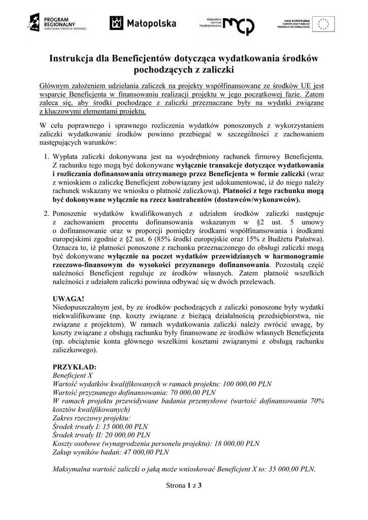 Instrukcja dla Beneficjentów dotycząca wydatkowania środków pochodzących z zaliczki Głównym założeniem udzielania zaliczek na projekty współfinansowane ze środków UE jest wsparcie Beneficjenta w finansowaniu realizacji projektu w jego początkowej fazie. Zatem zaleca się, aby środki pochodzące z zaliczki przeznaczane były na wydatki związane z kluczowymi elementami projektu. W celu poprawnego i sprawnego rozliczenia wydatków ponoszonych z wykorzystaniem zaliczki wydatkowanie środków powinno przebiegać w szczególności z zachowaniem następujących warunków: 1. Wypłata zaliczki dokonywana jest na wyodrębniony rachunek firmowy Beneficjenta. Z rachunku tego mogą być dokonywane wyłącznie transakcje dotyczące wydatkowania i rozliczania dofinansowania otrzymanego przez Beneficjenta w formie zaliczki (wraz z wnioskiem o zaliczkę Beneficjent zobowiązany jest udokumentować, iż do niego należy rachunek wskazany we wniosku o płatność zaliczkową). Płatności z tego rachunku mogą być dokonywane wyłącznie na rzecz kontrahentów (dostawców/wykonawców). 2. Ponoszenie wydatków kwalifikowanych z udziałem środków zaliczki następuje z zachowaniem procentu dofinansowania wskazanym w §2 ust. 5 umowy o dofinansowanie oraz w proporcji pomiędzy środkami współfinansowania i środkami europejskimi zgodnie z §2 ust. 6 (85% środki europejskie oraz 15% z Budżetu Państwa). Oznacza to, iż płatności ponoszone z rachunku przeznaczonego do obsługi zaliczki mogą być dokonywane wyłącznie na poczet wydatków przewidzianych w harmonogramie rzeczowo-finansowym do wysokości przyznanego dofinansowania. Pozostałą część należności Beneficjent reguluje ze środków własnych. Zatem płatność wszelkich należności z udziałem zaliczki powinna odbywać się w dwóch przelewach. UWAGA! Niedopuszczalnym jest, by ze środków pochodzących z zaliczki ponoszone były wydatki niekwalifikowane (np. koszty związane z bieżącą działalnością przedsiębiorstwa, nie związane z projektem). W ramach wydatkowania zaliczki należy zwrócić uwagę, by koszty związane z obsługą rachunku były finansowane ze środków własnych Beneficjenta (np. obciążenie konta głównego wszelkimi kosztami związanymi z obsługą rachunku zaliczkowego). PRZYKŁAD: Beneficjent X Wartość wydatków kwalifikowanych w ramach projektu: 100 000,00 PLN Wartość przyznanego dofinansowania: 70 000,00 PLN W ramach projektu przewidywane badania przemysłowe (wartość dofinansowania 70% kosztów kwalifikowanych) Zakres rzeczowy projektu: Środek trwały I: 15 000,00 PLN Środek trwały II: 20 000,00 PLN Koszty osobowe (wynagrodzenia personelu projektu): 18 000,00 PLN Zakup wyników badań: 47 000,00 PLN Maksymalna wartość zaliczki o jaką może wnioskować Beneficjent X to: 35 000,00 PLN. Strona 1 z 3 UWAGA! Mając na uwadze główne założenie zaliczkowania projektów współfinansowanych ze środków publicznych (EFRR i BP) zalecamy, aby punktem wyjścia do ustalenia wartości wnioskowanej zaliczki była wartość wydatków, które Beneficjent zamierza z jej pomocą sfinansować, nie zaś możliwa maksymalna dostępna wartość. Beneficjent X złożył wniosek o płatność zaliczkową na kwotę 35 000,00 PLN, z której zamierzał sfinansować zakup głównych elementów projektu w postaci 2 środków trwałych: W powyższym przykładzie zaliczkę należy wydatkować w następujący sposób: I ŚT: 15 000,00 PLN x 70% = 10 500,00 PLN II ŚT: 20 000,00 PLN x 70% = 14 000,00 PLN Kwoty 10 500,00 PLN oraz 14 000,00 PLN należy uregulować przelewem z rachunku zaliczkowego bezpośrednio na rachunek wystawcy faktury, natomiast pozostałą należność wynikającą z dokumentu księgowego (wkład własny Beneficjenta) należy dopłacić z własnych środków również bezpośrednio na rachunek wystawcy faktury. W przedstawionym przypadku, gdy Beneficjent występuje o płatność zaliczkową z zamiarem sfinansowania zakupu 2 środków trwałych jako kluczowych wydatków w projekcie zaleca się, aby wniosek o zaliczkę opiewał na kwotę 24 500,00 PLN. 3. Odsetki bankowe narosłe od przekazanych transz zaliczek, zgromadzone na wyodrębnionym rachunku bankowym podlegają zwrotowi na rachunek bankowy wskazany przez MCP (Beneficjent jest zobowiązany przedstawić kompletny wyciąg z rachunku zaliczkowego obejmującego okres od momentu otrzymania zaliczki do całkowitego jej wydatkowania). 4. Środki przekazane w ramach zaliczki stanowiące współfinansowanie (15% pochodzące z BP) winny być wydatkowane w terminie do 31 grudnia roku budżetowego, w którym zaliczka została wypłacona. W przeciwnym przypadku Beneficjent zobowiązany jest zwrócić niewydatkowane środki na rachunek MCP nr 31 1240 6292 1111 0010 5125 2091: - w terminie do 15 grudnia tego roku lub - w terminie do 15 dni od zakończenia realizacji projektu wskazanego w umowie – nie później, niż w dniu złożenia wniosku o płatność końcową. UWAGA! W przypadku przekroczenia terminu przewidzianego na wydatkowanie zaliczki w części stanowiącej współfinansowanie (15% pochodzących z BP) i jej zwrotu na rachunek MCP, pozostałą część zaliczki stanowiącą środki europejskie (85%, które Beneficjent otrzymał z Banku Gospodarstwa Krajowego) należy wydatkować zgodnie z poniższym przykładem: Wartość zakupu wyników badań: 47 000,00 PLN Poziom dofinansowania: 70% Maksymalna kwota zaliczki z udziałem środków europejskich regulowana z konta zaliczkowego: (47 000,00 PLN x 70%) – 15%= 32 900,00 PLN -15% = 27 965,00 PLN Strona 2 z 3 Z kolei po dokonaniu zakupu 2 środków trwałych oraz zwrotu niewykorzystanej części zaliczki odpowiadającej współfinansowaniu (15% z BP) Beneficjentowi do wykorzystania w ramach zaliczki pozostała kwota: 10 500,00 PLN - 15% = 8 925,00 PLN W związku z powyższym z konta zaliczkowego Beneficjent powinien zapłacić kwotę 8 925,00 PLN. Pozostałą należność wynikającą 