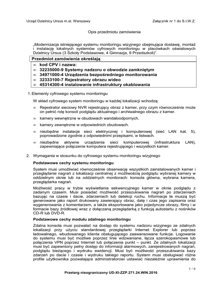 Urząd Dzielnicy Ursus m.st. Warszawy Załącznik nr 1 do S.I.W.Z. Opis przedmiotu zamówienia „Modernizacja istniejącego systemu monitoringu wizyjnego obejmująca dostawę, montaż i instalację lokalnych systemów cyfrowych monitoringu w placówkach oświatowych Dzielnicy Ursus (3 Szkoły Podstawowe, 4 Gimnazja, 9 Przedszkoli)”. Przedmiot zamówienia określają • kod CPV i nazwa: • 32235000-9 Systemy nadzoru o obwodzie zamkniętym • 34971000-4 Urządzenia bezpośredniego monitorowania • 32333100-7 Rejestratory obrazu wideo • 45314300-4 instalowanie infrastruktury okablowania 1. Elementy cyfrowego systemu monitoringu W skład cyfrowego system monitoringu w każdej lokalizacji wchodzą: • Rejestrator sieciowy NVR rejestrujący obraz z kamer, przy czym równocześnie może on pełnić rolę konsoli podglądu aktualnego i archiwalnego obrazu z kamer. • kamery wewnętrzne w obudowach wandaloodpornych. • kamery zewnętrzne w odpowiednich obudowach. • niezbędne instalacje sieci elektrycznej i komputerowej (sieć LAN kat. 5), poprowadzone zgodnie z odpowiednimi przepisami, w listwach. • niezbędne aktywne urządzenia sieci komputerowej (infrastruktura zapewniające połączenie komputera rejestrującego i wszystkich kamer. LAN), 2. Wymagania w stosunku do cyfrowego systemu monitoringu wizyjnego Podstawowe cechy systemu monitoringu System musi umożliwiać równocześnie obserwację wszystkich zainstalowanych kamer i przeglądanie nagrań z lokalizacji centralnej z możliwością podglądu wybranej kamery w oddzielnym oknie lub na oddzielnych monitorach: konsola główna, wybrana kamera, przeglądarka nagrań. Możliwość pracy w trybie wyświetlania sekwencyjnego kamer w oknie podglądu z zadanym czasem. Musi posiadać możliwość przeszukiwania nagrań po zdarzeniach bazując na czasie i dacie, zdarzeniach lub detekcji ruchu. Informacje te muszą być generowane jako raport drukowany zawierający obraz, datę i czas jego zapisania oraz wygenerowania z komentarzem, a także eksportowane jako pojedyncze obrazy, filmy i w formacie bazy źródłowej wraz z dołączaną przeglądarką z funkcją autostartu z nośników CD-R lub DVD-R. Podstawowe cechy modułu zdalnego monitoringu Zdalna konsola musi pozwalać na dostęp do systemu nadzoru wizyjnego ze zdalnych lokalizacji przy użyciu standardowej przeglądarki Internet Explorer lub poprzez ładowalnego, wbudowanego klienta obsługującego zaawansowane funkcje. Logowanie do systemu musi być możliwe poprzez linie wdzwaniane, łącza szerokopasmowe lub połączenia VPN poprzez Internet lub połączenia punkt – punkt. Ze zdalnych lokalizacji musi być zapewniony pełny dostęp do informacji alarmowych, zarejestrowanych nagrań, podglądu bieżącego i wydruku ewidencji. Musi być możliwość przeszukiwania bazy zdarzeń po dacie i czasie i wydruku takiego raportu. System musi obsługiwać różne profile użytkownika pozwalające administratorowi ustawiać niezależnie uprawnienia do 1/6 Przetarg nieograniczony UD-XI-ZZP.271.24.WIN.2016 Urząd Dzielnicy Ursus m.st. Warszawy Załącznik nr 1 do S.I.W.Z. poszczególnych kamer i definiować różnorodne układy widoków. Zdalny klient musi umożliwiać równoczesną obsługę podglądu strumieni MJPEG. Cyfrowy system monitoringu wizyjnego musi charakteryzować się następującymi cechami (lub lepszymi): 1. Możliwość zapisu nagrań oraz odtwarzania zapisu z co najmniej 25 kamer na jednym stanowisku rejestrującym (konsoli). 2. Skalowalność systemu – rozbudowa z krokiem co 1 kamerę 3. Zwiększanie szybkości odświeżania (fps) w przypadku wykrycia ruchu (VMD) lub zdarzenia. 4. Definiowanie alarmów: przed i po dla detekcji ruchu oraz dla zdarzeń. 5. Prędkość zapisu: do 25 klatek/s na kamerę. 6. Rejestracja obrazów w standardzie MJPEG. 7. Powiadamianie o zdarzeniach poprzez dźwięk, 8. Możliwość podglądu z wykorzystaniem trybu wielomonitorowego. 9. Praca w architekturze klient-serwer 10. Ciągłe przeszukiwanie wg czasu, daty lub aktywności / alarmu. 11. Ciągłe odtwarzanie nagrań w realnym czasie. 12. Eksport nagrań wideo w formacie filmu (np. AVI), obrazów (np. JPEG) i w formacie wewnętrznym z dołączonym programem do przeglądania. 13. W pełni konfigurowalna detekcja ruchu (VMD) w czasie rzeczywistym z obsługą wyłączeń obszarów z detekcji dla każdej kamery. 14. Automatyzacja czasu pracy kamer poprzez kalendarz z dokładnością do 5 minut lub poprzez zdarzenia. 15. Podgląd alarmowy nagrań w wydzielonym oknie pozwalający na szybszy dostęp do zapisanych nagrań alarmowych. 16. Wielopoziomowe zabezpieczenie hasłem i logowaniem. 17. Obsługa wejść i wyjść przekaźnikowych pozwalająca na zdalną kontrolę np. wejść i bram. 18. Konfigurowanie dostępu dla użytkowników zdalnych do kamer i funkcjonalności systemu. 19. Zdalny dostęp do nagrań i bieżącego podglądu z kamer poprzez wbudowanego w system zdalnego klienta. 20. Zdalny eksport nagrań (podobnie jak na konsoli). 21. Możliwość podglądu obrazu z kamery niezależnie od systemu funkcjonującego na konsoli (nie poprzez zdalnego klienta). 22. Różne poziomy kompresji dla zdalnego podglądu na żywo i nagrań. 23. Zdalna kontrola wyjść sygnałowych. 24. Drukowanie dokumentacji raportowej zdalnie i centralnie. 25. Inteligentne wyszukiwanie 26. Możliwość zarządzania wszystkimi kamerami zainstalowanymi w systemie za pomocą jednej aplikacji (diagnostyka, aktualizacja oprogramowania) Kamera wewnętrzna: 1. Kamera stacjonarna IP o rozdzielczości min. 2 MP z zasilaczem 2. Przetwornik ½.8´´ Skanowanie progresywne CMOS 3. Obiektyw min. 4.0 mm/F2.0 4. Min. oświetlenie 0,01 Lux @(F1.2, AGC wł.), 0 Lux przy wł. IR; 0,028 Lux @(F2.0, AGC wł.), 0 Lux przy wł. IR, 5. Migawka – 1/3 s-1/100,000s 6. Wbudowana detekcja ruchu (VMD) 7. Cyfrowa redukcja szumów 3D DNR, 8. Szeroki zakres dynamiki Digital WDR, 9. Regulacja kąta widzenia: panorama 0°- 355°, pochylenie 0°