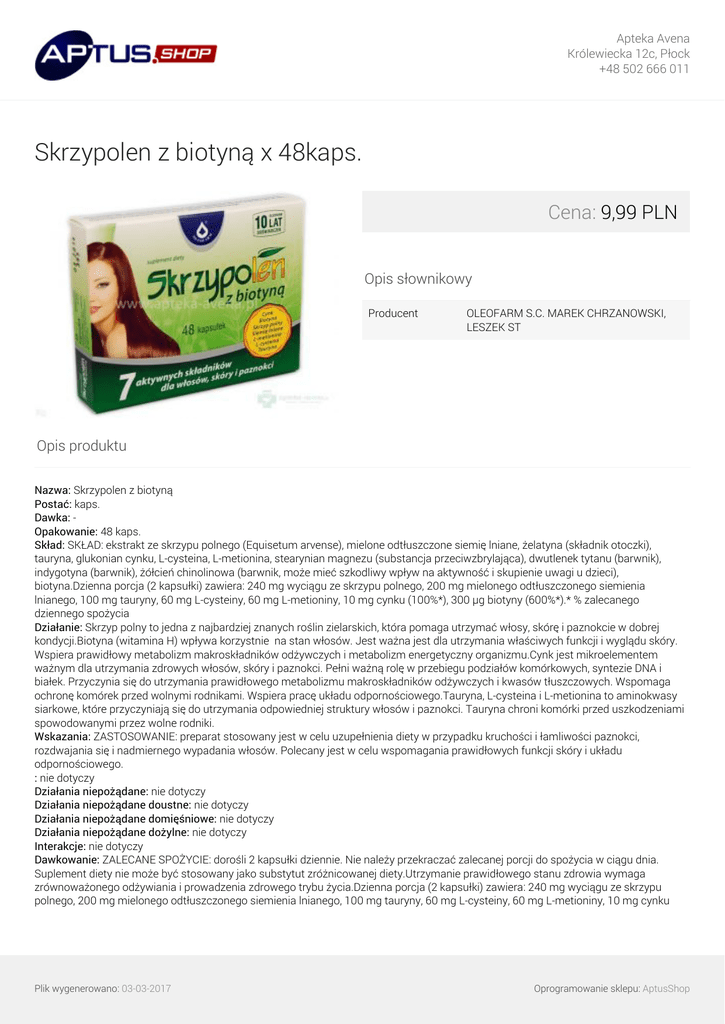 Apteka Avena Królewiecka 12c, Płock +48 502 666 011 Skrzypolen z biotyną x 48kaps. Cena: 9,99 PLN Opis słownikowy Producent OLEOFARM S.C. MAREK CHRZANOWSKI, LESZEK ST Opis produktu Nazwa: Skrzypolen z biotyną Postać: kaps. Dawka: Opakowanie: 48 kaps. Skład: SKŁAD: ekstrakt ze skrzypu polnego (Equisetum arvense), mielone odtłuszczone siemię lniane, żelatyna (składnik otoczki), tauryna, glukonian cynku, L-cysteina, L-metionina, stearynian magnezu (substancja przeciwzbrylająca), dwutlenek tytanu (barwnik), indygotyna (barwnik), żółcień chinolinowa (barwnik, może mieć szkodliwy wpływ na aktywność i skupienie uwagi u dzieci), biotyna.Dzienna porcja (2 kapsułki) zawiera: 240 mg wyciągu ze skrzypu polnego, 200 mg mielonego odtłuszczonego siemienia lnianego, 100 mg tauryny, 60 mg L-cysteiny, 60 mg L-metioniny, 10 mg cynku (100%*), 300 μg biotyny (600%*).* % zalecanego dziennego spożycia Działanie: Skrzyp polny to jedna z najbardziej znanych roślin zielarskich, która pomaga utrzymać włosy, skórę i paznokcie w dobrej kondycji.Biotyna (witamina H) wpływa korzystnie na stan włosów. Jest ważna jest dla utrzymania właściwych funkcji i wyglądu skóry. Wspiera prawidłowy metabolizm makroskładników odżywczych i metabolizm energetyczny organizmu.Cynk jest mikroelementem ważnym dla utrzymania zdrowych włosów, skóry i paznokci. Pełni ważną rolę w przebiegu podziałów komórkowych, syntezie DNA i białek. Przyczynia się do utrzymania prawidłowego metabolizmu makroskładników odżywczych i kwasów tłuszczowych. Wspomaga ochronę komórek przed wolnymi rodnikami. Wspiera pracę układu odpornościowego.Tauryna, L-cysteina i L-metionina to aminokwasy siarkowe, które przyczyniają się do utrzymania odpowiedniej struktury włosów i paznokci. Tauryna chroni komórki przed uszkodzeniami spowodowanymi przez wolne rodniki. Wskazania: ZASTOSOWANIE: preparat stosowany jest w celu uzupełnienia diety w przypadku kruchości i łamliwości paznokci, rozdwajania się i nadmiernego wypadania włosów. Polecany jest w celu wspomagania prawidłowych funkcji skóry i układu odpornościowego. : nie dotyczy Działania niepożądane: nie dotyczy Działania niepożądane doustne: nie dotyczy Działania niepożądane domięśniowe: nie dotyczy Działania niepożądane dożylne: nie dotyczy Interakcje: nie dotyczy Dawkowanie: ZALECANE SPOŻYCIE: dorośli 2 kapsułki dziennie. Nie należy przekraczać zalecanej porcji do spożycia w ciągu dnia. Suplement diety nie może być stosowany jako substytut zróżnicowanej diety.Utrzymanie prawidłowego stanu zdrowia wymaga zrównoważonego odżywiania i prowadzenia zdrowego trybu życia.Dzienna porcja (2 kapsułki) zawiera: 240 mg wyciągu ze skrzypu polnego, 200 mg mielonego odtłuszczonego siemienia lnianego, 100 mg tauryny, 60 mg L-cysteiny, 60 mg L-metioniny, 10 mg cynku Plik wygenerowano: 03-03-2017 Oprogramowanie sklepu: AptusShop Apteka Avena Królewiecka 12c, Płock +48 502 666 011 (100%*), 300 μg biotyny (600%*).* % zalecanego dziennego spożycia Dawkowanie (dorośli): ZALECANE SPOŻYCIE: dorośli 2 kapsułki dziennie. Nie należy przekraczać zalecanej porcji do spożycia w ciągu dnia. Suplement diety nie może być stosowany jako substytut zróżnicowanej diety.Utrzymanie prawidłowego stanu zdrowia wymaga zrównoważonego odżywiania i prowadzenia zdrowego trybu życia.Dzienna porcja (2 kapsułki) zawiera: 240 mg wyciągu ze skrzypu polnego, 200 mg mielonego odtłuszczonego siemienia lnianego, 100 mg tauryny, 60 mg L-cysteiny, 60 mg L-metioniny, 10 mg cynku (100%*), 300 μg biotyny (600%*).* % zalecanego dziennego spożycia Dawkowanie (dzieci): nie dotyczy Dawkowanie (noworodki): nie dotyczy Odtrutki: nie dotyczy Środki ostrożności: nie dotyczy Prowadzenie pojazdów: nie wplywa na zdolność prowadzenia pojazdów Przedawkowanie: nie dotyczy Plik wygenerowano: 03-03-2017 Powered by TCPDF (www.tcpdf.org) Oprogramowanie sklepu: AptusShop
