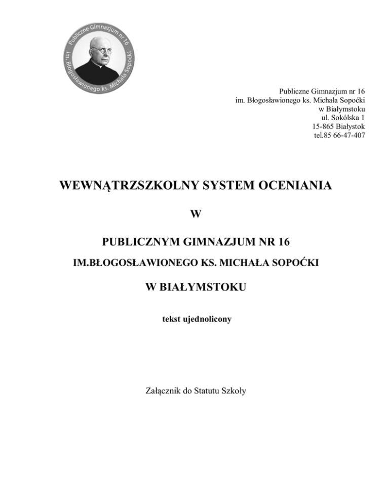 Publiczne Gimnazjum nr 16 im. Błogosławionego ks. Michała Sopoćki w Białymstoku ul. Sokólska 1 15-865 Białystok tel.85 66-47-407 WEWNĄTRZSZKOLNY SYSTEM OCENIANIA W PUBLICZNYM GIMNAZJUM NR 16 IM.BŁOGOSŁAWIONEGO KS. MICHAŁA SOPOĆKI W BIAŁYMSTOKU tekst ujednolicony Załącznik do Statutu Szkoły ROZDZIAŁ I POSTANOWIENIA WSTĘPNE § 1. Opracowany na podstawie Ustawy z dnia 7 września 1991 roku o systemie oświaty ( Dz. U. z 1996 roku nr 67. poz. 329, z 2004r. nr 256, poz. 2572 z późniejszymi zmianami) oraz aktów prawnych wydanych na jej podstawie. ROZDZIAŁ II CELE I ZADANIA OCENIANIA W PG 16 § 2. 1. Ocenianiu podlegają: - osiągnięcia edukacyjne ucznia, - zachowanie ucznia. 2. Ocenianie osiągnięć ucznia w PG nr 16 w Białymstoku polega na rozpoznawaniu przez nauczycieli poziomu i postępów w opanowaniu przez ucznia wiadomości i umiejętności w stosunku do wymagań edukacyjnych wynikających z podstawy programowej i realizowanych w szkole programów nauczania, uwzględniających tę podstawę. 3. Ocenianie zachowania ucznia polega na rozpoznawaniu przez wychowawcę klasy, nauczycieli oraz uczniów danej klasy stopnia respektowania przez ucznia zasad współżycia społecznego i norm etycznych oraz obowiązków ucznia określonych w statucie szkoły. § 3. Ocenianie wewnątrzszkolne ma na celu: 1) informowanie ucznia o poziomie jego osiągnięć edukacyjnych: bieżących, śródrocznych i rocznych i jego zachowaniu oraz o postępach w tym zakresie, 2) udzielanie uczniowi pomocy w nauce poprzez przekazanie uczniowi informacji o tym co zrobił dobrze i jak powinien dalej się uczyć, 3) udzielanie uczniowi pomocy w samodzielnym planowaniu swojego rozwoju, 4) motywowanie ucznia do dalszych postępów w nauce i zachowaniu, 5) dostarczenie rodzicom (prawnym opiekunom) i nauczycielom informacji o postępach, trudnościach w nauce, zachowaniu oraz specjalnych uzdolnieniach ucznia, 6) umożliwienie nauczycielom doskonalenia organizacji i metod pracy dydaktyczno – wychowawczej. § 4. Ocenianie wewnątrzszkolne obejmuje: 1) formułowanie przez nauczyciela wymagań edukacyjnych niezbędnych do uzyskania poszczególnych śródrocznych i rocznych ocen klasyfikacyjnych z obowiązkowych i dodatkowych zajęć edukacyjnych.. 2) ustalenie kryteriów oceniania zachowania, 3) ocenianie bieżące i ustalenie śródrocznych ocen klasyfikacyjnych z obowiązkowych i dodatkowych zajęć edukacyjnych oraz śródrocznej oceny klasyfikacyjnej zachowania przyjętych w szkole, 4) przeprowadzenie egzaminów klasyfikacyjnych zgodnie z § 15, 5) ustalenie rocznych ( semestralnych) ocen klasyfikacyjnych z obowiązkowych i dodatkowych zajęć edukacyjnych oraz rocznej oceny klasyfikacyjnej zachowania, 6) ustalenie warunków i trybu uzyskania wyższych niż przewidywane rocznych (semestralnych) ocen klasyfikacyjnych z obowiązkowych i dodatkowych zajęć edukacyjnych oraz rocznej oceny klasyfikacyjnej z zachowania, 7) ustalenie warunków i sposobu przekazywania rodzicom (prawnym opiekunom) informacji o postępach i trudnościach ucznia w nauce. ROZDZIAŁ III OGÓLNE KRYTERIA OCENIANIA § 5. Wewnątrzszkolny system oceniania ocenia umiejętności z zakresu: 1. wiedzy i umiejętności niezbędnych do zdania egzaminów 2. komunikacji: a. komunikacji werbalnej ( w języku polskim, języku angielskim, języku niemieckim, ,języku rosyjskim), b. umiejętności poszukiwania i analizowania informacji, c. umiejętności posługiwania się komputerem, d. komunikacji interpersonalnej - asertywności ( wyrażanie opinii, obrona stanowiska ), umiejętność rozwiązywania konfliktów, 3. umiejętności współpracy w grupie, w klasie, 4. odpowiedzialności za: a. wykonanie powierzonych i przyjętych samodzielnie zadań, b. ponoszenia konsekwencji własnego czynu, 5. rozwoju psychologicznego polegającego na: a. poczuciu własnej wartości, b. umiejętności oceny własnych zachowań, c. dawania sobie rady w sytuacjach trudnych i problemowych (elastyczność), d. wyrabianiu samodyscypliny myślowej i zachowań. § 6. Wymagania edukacyjne dostosowuje się do indywidualnych potrzeb rozwojowych i edukacyjnych oraz możliwości psychofizycznych ucznia: 1) posiadającego orzeczenie o potrzebie kształcenia specjalnego – na podstawie tego orzeczenia oraz ustaleń zawartych w indywidualnym programie edukacyjnoterapeutycznym; 2) posiadającego orzeczenie o potrzebie indywidualnego nauczania – na podstawie tego orzeczenia; 3) posiadającego opinię poradni psychologiczno-pedagogicznej, w tym poradni specjalistycznej, o specyficznych trudnościach w uczeniu się lub inną opinię poradni psychologiczno-pedagogicznej, w tym poradni specjalistycznej, wskazującą na potrzebę takiego dostosowania – na podstawie tej opinii; 4) nieposiadającego orzeczenia lub opinii wymienionych w pkt 1–3, który jest objęty pomocą psychologiczno-pedagogiczną w szkole – na podstawie rozpoznania indywidualnych potrzeb rozwojowych i edukacyjnych oraz indywidualnych możliwości psychofizycznych ucznia dokonanego przez nauczycieli i specjalistów; 5) posiadającego opinię lekarza o ograniczonych możliwościach wykonywania przez ucznia określonych ćwiczeń fizycznych na zajęciach wychowania fizycznego – na podstawie tej opinii. § 7. uchylono § 8. uchylono § 9. Przy ustalaniu oceny z wychowania fizycznego, zajęć technicznych, plastyki, muzyki i zajęć artystycznych należy przede wszystkim brać pod uwagę wysiłek wkładany przez ucznia w wywiązywanie się z obowiązków wynikających ze specyfiki tych zajęć, a w przypadku wychowania fizycznego – także systematyczność udziału ucznia w zajęciach oraz aktywność ucznia w działaniach podejmowanych przez szkołę na rzecz kultury fizycznej. § 10. Oceny klasyfikacyjne roczne, śródroczne i bieżące ustala się w stopniu: 1) stopień celujący - 6 2) stopień bardzo dobry - 5 3) stopień dobry - 4 4) stopień dostateczny - 3 5) stopień dopuszczający - 2 6) sto