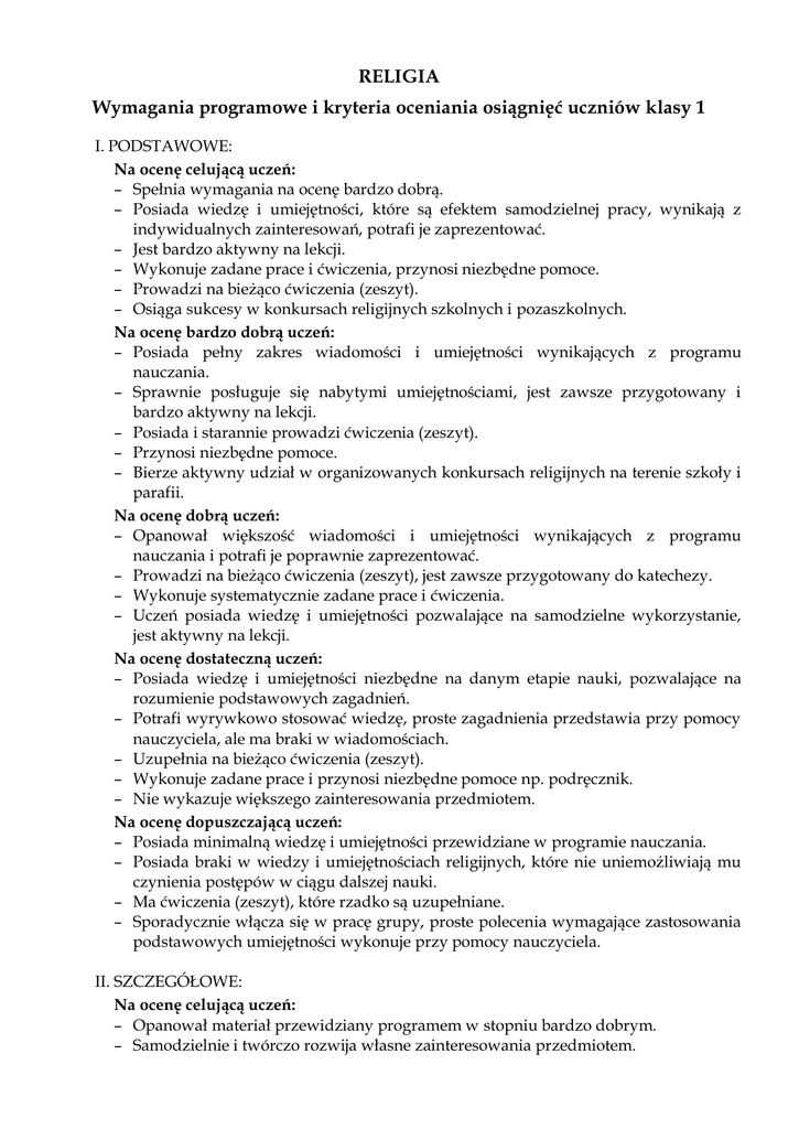 RELIGIA Wymagania programowe i kryteria oceniania osiągnięć uczniów klasy 1 I. PODSTAWOWE: Na ocenę celującą uczeń: – Spełnia wymagania na ocenę bardzo dobrą. – Posiada wiedzę i umiejętności, które są efektem samodzielnej pracy, wynikają z indywidualnych zainteresowań, potrafi je zaprezentować. – Jest bardzo aktywny na lekcji. – Wykonuje zadane prace i ćwiczenia, przynosi niezbędne pomoce. – Prowadzi na bieżąco ćwiczenia (zeszyt). – Osiąga sukcesy w konkursach religijnych szkolnych i pozaszkolnych. Na ocenę bardzo dobrą uczeń: – Posiada pełny zakres wiadomości i umiejętności wynikających z programu nauczania. – Sprawnie posługuje się nabytymi umiejętnościami, jest zawsze przygotowany i bardzo aktywny na lekcji. – Posiada i starannie prowadzi ćwiczenia (zeszyt). – Przynosi niezbędne pomoce. – Bierze aktywny udział w organizowanych konkursach religijnych na terenie szkoły i parafii. Na ocenę dobrą uczeń: – Opanował większość wiadomości i umiejętności wynikających z programu nauczania i potrafi je poprawnie zaprezentować. – Prowadzi na bieżąco ćwiczenia (zeszyt), jest zawsze przygotowany do katechezy. – Wykonuje systematycznie zadane prace i ćwiczenia. – Uczeń posiada wiedzę i umiejętności pozwalające na samodzielne wykorzystanie, jest aktywny na lekcji. Na ocenę dostateczną uczeń: – Posiada wiedzę i umiejętności niezbędne na danym etapie nauki, pozwalające na rozumienie podstawowych zagadnień. – Potrafi wyrywkowo stosować wiedzę, proste zagadnienia przedstawia przy pomocy nauczyciela, ale ma braki w wiadomościach. – Uzupełnia na bieżąco ćwiczenia (zeszyt). – Wykonuje zadane prace i przynosi niezbędne pomoce np. podręcznik. – Nie wykazuje większego zainteresowania przedmiotem. Na ocenę dopuszczającą uczeń: – Posiada minimalną wiedzę i umiejętności przewidziane w programie nauczania. – Posiada braki w wiedzy i umiejętnościach religijnych, które nie uniemożliwiają mu czynienia postępów w ciągu dalszej nauki. – Ma ćwiczenia (zeszyt), które rzadko są uzupełniane. – Sporadycznie włącza się w pracę grupy, proste polecenia wymagające zastosowania podstawowych umiejętności wykonuje przy pomocy nauczyciela. II. SZCZEGÓŁOWE: Na ocenę celującą uczeń: – Opanował materiał przewidziany programem w stopniu bardzo dobrym. – Samodzielnie i twórczo rozwija własne zainteresowania przedmiotem. – Bierze udział i osiąga sukcesy w konkursach religijnych. – Biegle posługuje się zdobytą wiedzą, posiada wiedzę wykraczającą poza program nauczania klasy pierwszej. – Jest wzorem i przykładem dla innych uczniów. – Posiada uzupełnione ćwiczenia (zeszyt). Na ocenę bardzo dobrą uczeń: – Zna modlitwy: Ojcze nasz, Zdrowaś Maryjo, Przykazanie miłości, Aniele Boży, Wieczny odpoczynek, Akt nadziei, Akt żalu. – Rozumie religijne znaczenie znaku krzyża i poprawnie czyni znak krzyża. – Wie, kim była i dlaczego warto naśladować Świętą Kingę – patronkę roku. – Rozpoznaje Pismo Święte. – Wie, że Pismo Święte jest najważniejszą Księgą. – Rozumie, że kościół jest miejscem spotkania z Bogiem. – Rozumie, że Pan Jezus jest obecny w kościele i sakramentach. – Wie, kim jest Maryja. – Opowiada o narodzeniu Pana Jezusa i Jego życiu. – Zna pojęcia: sumienie, Bóg, dobro, zło. – Wie, czym jest chrzest święty w życiu człowieka. – Wyjaśnia modlitwę Ojcze nasz. – Wymienia najważniejsze święta: Boże Narodzenie, Zmartwychwstanie. – Rozpoznaje znaki i symbole religijne: krzyż, różaniec, Pismo Święte. – Zna i stosuje pozdrowienia chrześcijańskie. – Poprawnie zachowuje się w kościele i w miejscach kultu. – Z szacunkiem odnosi się do kapłanów, rodziców, nauczycieli, wychowawców. – Posiada uzupełnione ćwiczenia (zeszyt). Na ocenę dobrą uczeń: – Zna większość modlitw przewidzianych w programie nauczania. – Rozumie religijne znaczenie znaku krzyża i poprawnie czyni znak krzyża. – Wie, kim była i dlaczego warto naśladować Świętą Kingę – patronkę roku. – Rozpoznaje Pismo Święte. – Wie, że Pismo Święte jest najważniejszą Księgą. – Wie, kim jest Maryja. – Opowiada o narodzeniu Pana Jezusa i Jego życiu. – Zna pojęcia: sumienie, Bóg, dobro, zło. – Wie, czym jest chrzest w życiu człowieka. – Wymienia najważniejsze święta: Boże Narodzenie, Zmartwychwstanie. – Rozpoznaje znaki i symbole religijne: krzyż, różaniec, Pismo Święte. – Zna i stosuje pozdrowienia chrześcijańskie. – Poprawnie zachowuje się w kościele i w miejscach kultu. – Z szacunkiem odnosi się do kapłanów, rodziców, nauczycieli, wychowawców. – Posiada uzupełnione ćwiczenia (zeszyt). Na ocenę dostateczną uczeń: – Zna niektóre modlitwy przewidziane w programie nauczania. – Poprawnie czyni znak krzyża. – Wie, że Święta Kinga jest patronką roku. – Rozpoznaje Pismo Święte. – Wie, kim jest Maryja. – Zna pojęcia: dobro, zło. – Rozumie czym jest chrzest święty w życiu człowieka. – Wymienia najważniejsze święta: Boże Narodzenie, Zmartwychwstanie. – Rozpoznaje znaki i symbole religijne: krzyż, różaniec, Pismo Święte. – Zna i stosuje pozdrowienia chrześcijańskie. – Poprawnie zachowuje się w kościele i miejscach kultu. – Z szacunkiem odnosi się do kapłanów, rodziców, nauczycieli, wychowawców. – Na bieżąco uzupełnia ćwiczenia (zeszyt). Na ocenę dopuszczającą uczeń: – Zna wybrane modlitwy przewidziane w programie nauczania, powie je z pomocą nauczyciela. – Poprawnie czyni znak krzyża. – Wie, że Święta Kinga jest patronką roku. – Wie, kim jest Maryja. – Zna pojęcia: dobro, zło. – Wymienia najważniejsze święta: Boże Narodzenie, Zmartwychwstanie. – Rozpoznaje znaki i symbole religijne: krzyż, różaniec, Pismo Święte. – Zna pozdrowienia chrześcijańskie.