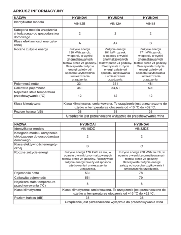 ARKUSZ INFORMACYJNY NAZWA Identyfikator modelu Kategoria modelu urządzenia chłodzącego do gospodarstwa domowego Klasa efektywności energetycznej Roczne zużycie energii Pojemność netto Całkowita pojemność Najniższa stała temperatura przechowywania (°C) Klasa klimatyczna Poziom hałasu (dB) NAZWA Identyfikator modelu Kategoria modelu urządzenia chłodzącego do gospodarstwa domowego Klasa efektywności energetycznej Roczne zużycie energii Pojemność netto Całkowita pojemność Najniższa stała temperatura przechowywania (°C) Klasa klimatyczna Poziom hałasu (dB) HYUNDAI HYUNDAI HYUNDAI VIN12B VIN12A VIN18 2 2 2 A A+ B Zużycie energii Zużycie energii Zużycie energii 130 kWh za rok, 101 kWh za rok, 171 kWh za rok, w oparciu o wyniki w oparciu o wyniki w oparciu o wyniki znormalizowanych znormalizowanych znormalizowanych testów przez 24 godziny. testów przez 24 godziny. testów przez 24 godziny. Rzeczywiste zużycie Rzeczywiste zużycie Rzeczywiste zużycie energii zależy od energii zależy od energii zależy od sposobu użytkowania sposobu użytkowania sposobu użytkowania i umieszczenia i umieszczenia i umieszczenia urządzenia. urządzenia. urządzenia. 33 l 34 l 33 l 34,5 l 48 l 50 l 12 12 12 Klasa klimatyczna: umiarkowana. To urządzenie jest przeznaczone do użytku w temperaturze otoczenia od +16 °C do +32 oC. 38 38 38 Urządzenie jest przeznaczone wyłącznie do przechowywania wina HYUNDAI VIN18DZ HYUNDAI VIN32DZ 2 2 B C Zużycie energii 176 kWh za rok, w oparciu o wyniki znormalizowanych testów przez 24 godziny. Rzeczywiste zużycie energii zależy od sposobu użytkowania i umieszczenia urządzenia. Zużycie energii 238 kWh za rok, w oparciu o wyniki znormalizowanych testów przez 24 godziny. Rzeczywiste zużycie energii zależy od sposobu użytkowania i umieszczenia urządzenia. 53 l 55 l 78 l 79 l 8 8 Klasa klimatyczna: umiarkowana. To urządzenie jest przeznaczone do użytku w temperaturze otoczenia od +16 °C do +32 oC. 38 38 Urządzenie jest przeznaczone wyłącznie do przechowywania wina