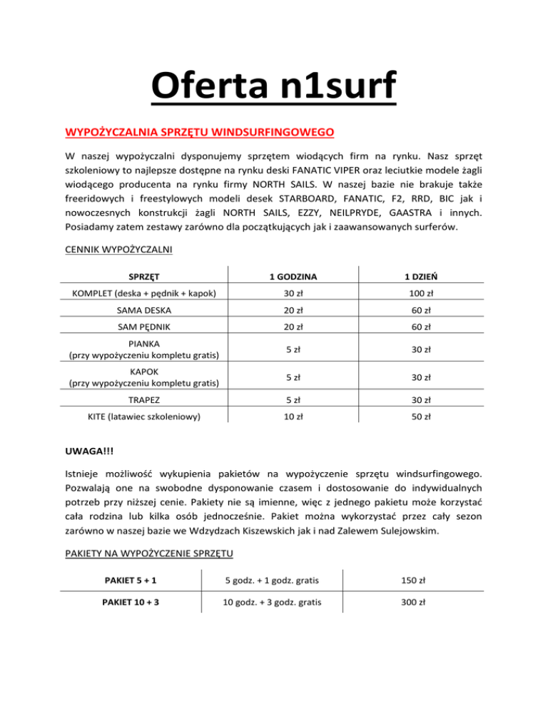 Oferta n1surf WYPOŻYCZALNIA SPRZĘTU WINDSURFINGOWEGO W naszej wypożyczalni dysponujemy sprzętem wiodących firm na rynku. Nasz sprzęt szkoleniowy to najlepsze dostępne na rynku deski FANATIC VIPER oraz leciutkie modele żagli wiodącego producenta na rynku firmy NORTH SAILS. W naszej bazie nie brakuje także freeridowych i freestylowych modeli desek STARBOARD, FANATIC, F2, RRD, BIC jak i nowoczesnych konstrukcji żagli NORTH SAILS, EZZY, NEILPRYDE, GAASTRA i innych. Posiadamy zatem zestawy zarówno dla początkujących jak i zaawansowanych surferów. CENNIK WYPOŻYCZALNI SPRZĘT 1 GODZINA 1 DZIEŃ KOMPLET (deska + pędnik + kapok) 30 zł 100 zł SAMA DESKA 20 zł 60 zł SAM PĘDNIK 20 zł 60 zł PIANKA (przy wypożyczeniu kompletu gratis) 5 zł 30 zł KAPOK (przy wypożyczeniu kompletu gratis) 5 zł 30 zł TRAPEZ 5 zł 30 zł KITE (latawiec szkoleniowy) 10 zł 50 zł UWAGA!!! Istnieje możliwość wykupienia pakietów na wypożyczenie sprzętu windsurfingowego. Pozwalają one na swobodne dysponowanie czasem i dostosowanie do indywidualnych potrzeb przy niższej cenie. Pakiety nie są imienne, więc z jednego pakietu może korzystać cała rodzina lub kilka osób jednocześnie. Pakiet można wykorzystać przez cały sezon zarówno w naszej bazie we Wdzydzach Kiszewskich jak i nad Zalewem Sulejowskim. PAKIETY NA WYPOŻYCZENIE SPRZĘTU PAKIET 5 + 1 5 godz. + 1 godz. gratis 150 zł PAKIET 10 + 3 10 godz. + 3 godz. gratis 300 zł LEKCJE INDYWIDUALNE Lekcje indywidualne są niewątpliwie najbardziej efektywną formą nauki windsurfingu. Instruktor całą uwagę może skupić na uczniu i dostosować metodykę do jego oczekiwań i umiejętności. Cennik lekcji indywidualnych wraz ze sprzętem: Lekcja 1 osoba z instruktorem 2 osoby z instruktorem 3 osoby z instruktorem 1 godzina 80 zł 140 zł 180 zł 2 godziny 140 zł 240 zł 300 zł UWAGA!!! Istnieje możliwość wykupienia pakietów na lekcje indywidualne z instruktorem. Pakiet umożliwia bardzo efektywny trening przy niższej cenie. Zajęcia są ściśle dopasowane do poziomu zaawansowania, a w trakcie samodzielnego pływania można szlifować umiejętności zdobyte podczas lekcji. W skład pakietu wchodzi kompletny sprzęt oraz 2 lub 3 godziny zajęć z instruktorem połączone z 1 lub 2 godzinami samodzielnego pływania. Pakiety są imienne, z jednego może korzystać jedna osoba, ale można je wykorzystać zarówno w naszej bazie we Wdzydzach Kiszewskichy jak i nad Zalewem Sulejowskim do końca sezonu 2012. PAKIET 2 + 1 PAKIET 3 + 2 2 godz. z instruktorem + 1 godz. samodzielnego pływania 3 godz. z instruktorem + 2 godz. samodzielnego pływania 150 zł 200 zł PAKIETY PROMOCYJNE PAKIETY NA LEKCJE INDYWIDUALNE Z INSTRUKTOREM Pakiet umożliwia bardzo efektywny trening przy niższej cenie. Zajęcia są ściśle dopasowane do poziomu zaawansowania, a w trakcie samodzielnego pływania można szlifować umiejętności zdobyte podczas lekcji. W skład pakietu wchodzi kompletny sprzęt oraz 2 lub 3 godziny zajęć z instruktorem połączone z 1 lub 2 godzinami samodzielnego pływania. Pakiety są imienne, z jednego może korzystać jedna osoba, ale można je wykorzystać zarówno w naszej bazie we Wdzydzach Kiszewskich jak i nad Zalewem Sulejowskim do końca sezonu 2012. PAKIET 2 + 1 PAKIET 3 + 2 2 godz. z instruktorem + 1 godz. samodzielnego pływania 3 godz. z instruktorem + 2 godz. samodzielnego pływania 150 zł 200 zł PAKIETY NA WYPOŻYCZENIE SPRZĘTU Istnieje możliwość wykupienia pakietów na wypożyczenie sprzętu windsurfingowego. Pozwalają one na swobodne dysponowanie czasem i dostosowanie do indywidualnych potrzeb przy niższej cenie. Pakiety nie są imienne, więc z jednego pakietu może korzystać cała rodzina lub kilka osób jednocześnie. Pakiet można wykorzystać przez cały sezon zarówno w naszej bazie we Wdzydzach Kiszewskich jak i nad Zalewem Sulejowskim. PAKIET 5 + 1 5 godz. + 1 godz. gratis 150 zł PAKIET 10 + 3 10 godz. + 3 godz. gratis 300 zł KURS WEEKENDOWY od 270 zł* Dla każdego, kto chce szybko opanować podstawy windsurfingu, a obowiązki zawodowe nie pozwalają na dłuższy pobyt, mamy idealne rozwiązanie – windsurfingowe kursy weekendowe. W cenie kursu: 8 godzin nauki windsurfingu w grupie od 3 do 8 osób (4 godz./dzień w godzinach 10.30-12.30, 16-18) pod okiem licencjonowanych instruktorów windsurfingu, kompletny sprzęt windsurfingowy (deski, żagle, kamizelki asekuracyjne oraz pianki windsurfingowe), karnet na 2 godziny wypożyczenia sprzętu (do wykorzystania przez cały sezon), ubezpieczenie NNW. Dodatkowe możliwości: zakwaterowanie w naszym Surf Campie w namiotach IGLO (20zł/dobę za osobę), zakwaterowanie w domkach (30-50 zł/dobę za osobę), wyżywienie (40 zł/dobę za osobę), zakup sprzętu windsurfingowego po atrakcyjnych cenach. Inne atrakcje: wypożyczalnia kajaków, żaglówek, spływy kajakowe, sauna, wieża widokowa, skimboard, rowery, kajaki, mini golf, żaglówki, siatkówka, koszykówka, piłka nożna, badminton Lp. Termin Rabat* Cena 1. 08.06 – 09.06.2013 -10% 270 zł 2. 15.06 – 16.06.2013 -10% 270 zł 3. 22.06 – 23.06.2013 -10% 270 zł 4. 29.06 – 30.06.2013 -10% 270 zł 5. 06.07 – 07.07.2013 300 zł 6. 13.07 – 14.07.2013 300 zł 7. 20.07 – 21.07.2013 300 zł 8. 27.07 – 28.07.2013 300 zł 9. 03.08 – 04.08.2013 300 zł 10. 10.08 – 11.08.2013 300 zł 11. 17.08 – 18.08.2013 300 zł 12. 24.08 – 25.08.2013 300 zł 13. 31.08 – 01.09.2013 -10% 270 zł 14. 07.09 – 08.09.2013 -10% 270 zł 15. 14.09 – 15.09.2013 -10% 270 zł KURS WINDSURFINGOWY 5-DNIOWY od 350 zł* Kursy windsurfingowe 5 dniowe prowadzimy przez okres całych wakacji w systemie poniedziałek – piątek w kilkuosobowych grupach, ale istnieje również możliwość skorzystania z opcji 7 dniowej jak i kursów weekendowych. Zajęcia grupowe cieszą się ogromną popularnością ze względu na ciekawy sposób prowadzenia zajęć, łączący naukę z zabawą. Kilkudniowe szkolenia pozwalają