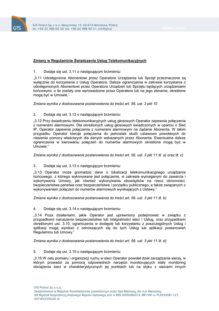 Zmiany w Regulaminie Świadczenia Usług Telekomunikacyjnych 1. Dodaje się ust. 3.11 o następującym brzmieniu: „3.11 Udostępnione Abonentowi przez Operatora Urządzenia lub Sprzęt przeznaczone są wyłącznie do korzystania z Usług Operatora. Dalsze ograniczenia w zakresie korzystania z udostępnionych Abonentowi przez Operatora Urządzeń lub Sprzętu będących urządzeniami końcowymi, o ile zostały one wprowadzone przez Operatora lub na jego zlecenie, określone mogą być w Umowie.” Zmiana wynika z dostosowania postanowienia do treści art. 56. ust. 3 pkt 10 2. Dodaje się ust. 3.12 o następującym brzmieniu: „3.12 Przy świadczeniu telekomunikacyjnych usług głosowych Operator zapewnia połączenia z numerami alarmowymi. Dla określonych usług głosowych świadczonych w oparciu o Sieć IP, Operator zapewnia połączenia z numerami alarmowymi na żądanie Abonenta. W takim przypadku Operator kieruje połączenia do jednostek służb ustawowo powołanych do niesienia pomocy właściwych dla danych wskazanych przez Abonenta. Ewentualne dalsze ograniczenia w kierowaniu połączeń do numerów alarmowych określone mogą być w Umowie.” Zmiana wynika z dostosowania postanowienia do treści art. 56. ust. 3 pkt 11 lit. a) oraz lit. c) 3. Dodaje się ust. 3.13 o następującym brzmieniu: „3.13 Operator może gromadzić dane o lokalizacji telekomunikacyjnego urządzenia końcowego, z którego wykonywane jest połączenie, w zakresie wymaganym do zawarcia i wykonywania Umowy, jak również wykonywania obowiązków na rzecz obronności, bezpieczeństwa państwa oraz bezpieczeństwa i porządku publicznego, a także związanych z wykonywaniem połączeń do numerów alarmowych wynikających z Ustawy.” Zmiana wynika z dostosowania postanowienia do treści art. 56. ust. 3 pkt 11 lit. b) 4. Dodaje się ust. 3.14 o następującym brzmieniu: „3.14 Poza działaniami, jakie Operator jest uprawniony podejmować w związku z przypadkami naruszenia bezpieczeństwa lub integralności sieci i Usług, oraz przypadkami określonymi ust. 3.10, ograniczenia w dostępie lub korzystaniu z poszczególnych Usług i aplikacji mogą wynikać z odnoszących się do tych Usług lub aplikacji postanowień Regulaminu lub Umowy.” Zmiana wynika z dostosowania postanowienia do treści art. 56. ust. 3 pkt 11 lit. d) 5. Dodaje się ust. 3.15 o następującym brzmieniu: „3.15 W celu pomiaru i organizacji ruchu w sieci Operator powołał dział zarządzania siecią, w którym prowadzi za pomocą odpowiednich narzędzi monitorujących stały monitoring obciążenia sieci w charakterystycznych jej punktach lub na styku z sieciami innych operatorów, aby zapobiec osiągnięciu lub przekroczeniu pojemności łącza. Monitorowanie nie wpływa na jakość świadczonej Usługi. Szczegółowe postanowienia dotyczące metod prowadzenia monitoringu może określać Umowa.” Zmiana wynika z dostosowania postanowienia do treści art. 56. ust. 3 pkt 11 lit. e) 6. Dodaje się ust. 3.16 o następującym brzmieniu: „3.16 Informacje o zagrożeniach związanych ze świadczoną Uługą, w tym o sposobach ochrony bezpieczeństwa, prywatności i danych osobowych Operator zamieszcza na swojej stronie internetowej lub w Umowie.” Zmiana wynika z dostosowania postanowienia do treści art. 56. ust. 3 pkt 20) 7. Ust. 4.1 zdanie drugie otrzymuje brzmienie: „Umowa może być zawarta w formie elektronicznej za pomocą formularza udostępnionego na stronie internetowej Operatora, jeżeli Operator dopuścił taką możliwość.” Zmiana wynika z dostosowania postanowienia do treści art. 56. ust. 6 8. Ust. 4.4, 4.4.1 oraz 4.4.6 otrzymują następujące brzmienie: „4.4. Przed zawarciem Umowy, Podmiot zobowiązany jest przekazać Operatorowi następujące dane i oryginały lub poświadczone za zgodność z oryginałem kopie, a w przypadkach wskazanych poniżej wydruki komputerowe, dokumentów: 4.4.1 identyfikujących status prawny, w szczególności, aktualny odpis z Krajowego Rejestru Sądowego albo zaświadczenia o wpisie w Centralnej Ewidencji i Informacji o Działalności Gospodarczej w formie dokumentu elektronicznego albo wydruku ze strony internetowej CEIDG lub innych dokumentów urzędowych, potwierdzających fakty zgłoszone do zawarcia Umowy; 4.4.6 w przypadku, gdy osoba reprezentująca nie jest wpisana do rejestru Podmiotu chcącego zawrzeć Umowę, osoba ta powinna przedstawić ważne pełnomocnictwo, złożone na piśmie, podpisane czytelnie przez osobę lub osoby upoważnione do reprezentowania Podmiotu zgodnie z treścią aktualnego odpisu lub wydruku komputerowego z rejestru Podmiotu, opatrzone pieczątką mocodawcy. Wniesienie opłaty skarbowej leży po stronie mocodawcy. Osoby występujące w imieniu Podmiotu zobowiązane są wylegitymować się dowodem osobistym lub paszportem;” Zmiana wynika z dostosowania postanowień do treści art. 38 ust. 4 Ustawy o swobodzie działalności gospodarczej tj. z dnia 14 października 2010 r. (Dz.U. Nr 220, poz. 1447 ze zm.) 9. Ust. 4.13 otrzymuje brzmienie: „Wszelkie zmiany Umowy, w tym zmiana zakresu numeracji, z wyłączeniem przypadku, o którym mowa w ust. 4. 11 zdanie drugie powyżej i ust. 4.16 , wymagają zawarcia przez należycie umocowanych przedstawicieli Operatora i Abonenta pisemnego Aneksu, pod rygorem nieważności.” Zmiana wynika z dostosowania postanowienia do treści art. 56. ust. 6 10. Dodaje się ust. 4.16, 4.17 oraz 4.18 o następującym brzmieniu: „4.16 Operator może umożliwić Abonentowi będącemu stroną Umowy zawartej w formie pisemnej lub elektronicznej zmianę warunków Umowy w zakresie: 4.16.1. świadczonych Usług ze wskazaniem elementów składających się na opłaty wnoszone przez Abonenta; 4.16.2. okresu, na jaki została zawarta Umowa, w tym Minimalnego Okresu Świadczenia Usługi; 4.16.3. pakietów taryfowych, jeżeli na świadczone Usługi obowiązują różne pakiety taryfowe; 4.16.4. sposobu składania zamówień na paki