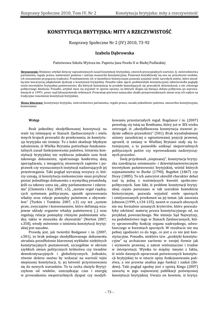 Rozprawy Społeczne 2010, Tom IV, Nr 2 Konstytucja brytyjska: mity a rzeczywistość KONSTYTUCJA BRYTYJSKA: MITY A RZECZYWISTOŚĆ Rozprawy Społeczne Nr 2 (IV) 2010, 73-92 Izabela Dąbrowska Państwowa Szkoła Wyższa im. Papieża Jana Pawła II w Białej Podlaskiej Streszczenie: Niniejszy artykuł dotyczy najważniejszych zasad konstytucji brytyjskiej, czterech pryncypialnych wartości, tj. zwierzchnictwa parlamentu, reguły prawa, unitarności państwa i ustroju monarchii konstytucyjnej. Ponieważ kształtowały się one na przestrzeni wieków, ich zrozumienie przysparza trudności. Przedstawienie ich w kontekście historycznym pozwala wyjaśnić wiele narosłych mitów, które nieodłącznie towarzyszą jakąkolwiek dyskusji o konstytucji brytyjskiej. Ponadto takie ujęcie problematyki konstytucyjnej odzwierciedla poglądy wielu teoretyków brytyjskiej państwowości, dla których konstytucja to produkt kumulujących się przeszłych doświadczeń, a nie celowego politycznego działania. Ponadto, artykuł stara się wyjaśnić te sporne sprawy, na których skupia się bieżąca debata polityczna po wprowadzonych w 1997r. przez rząd laburzystowski reformach. Prezentuje pierwsze namacalne skutki przeprowadzonych zmian oraz ich wpływ na tradycyjne rozumienie konstytucji brytyjskiej. Słowa kluczowe: konstytucja brytyjska, zwierzchnictwo parlamentu, reguła prawa, zasada jednolitości państwa, monarchia konstytucyjna, konwenanse Wstęp Brak jednolitej skodyfikowanej konstytucji na wzór tej istniejącej w Stanach Zjednoczonych i wielu innych krajach prowadzi do przekonania, że konstytucja brytyjska nie istnieje. To z kolei skutkuje błędnym założeniem, iż Wielka Brytania potrzebuje fundamentalnych zasad funkcjonowania państwa. Istnienia konstytucji brytyjskiej nie wyklucza jednakże sam brak takowego dokumentu, opatrzonego konkretną datą sporządzenia, z mnogością stosownych zapisów i poprawek czy wyznaczonych instytucji nadzorujących jej przestrzegania. Taki pogląd wyrażają wszyscy ci, którzy uznają, iż konstytucja niekoniecznie musi przybrać postać jednolitego dokumentu z wymyślną preambułą. Jeśli za takowy uzna się „akty parlamentarne i zdarzenia” (Clements i Kay 2001, s.5), „zestaw reguł rządzących systemem politycznym, sposób sprawowania władzy oraz relacje pomiędzy państwem a obywatelem” (Turkin i Tomkins 2007, s.3) czy też „system praw, zwyczajów i konwenansów, które definiują wzajemne układy organów władzy państwowej (..) oraz regulują relacje pomiędzy różnymi podmiotami władzy, także w stosunku do obywatela” (Norton 2007, s.358), wtedy mówienie o istnieniu konstytucji brytyjskiej jest zasadne. Prawdą jest, jak twierdzi Bodganor i in. (2007, s.501), że brak jednego skodyfikowanego dokumentu utrudnia przedłożenie klarownej wykładni niektórych konstytucyjnych postanowień, szczególnie w okresie szybkich zmian politycznych królestwa czy trendów demokratyzacyjnych i globalistycznych. Jednakże, równie dobrze można by wskazać na wartość tejże niepisanej konstytucji, tj. jej łatwość przystosowania się do nowych warunków. To ta cecha służyła Brytyjczykom od wieków, oszczędzając czas i energię w prowadzeniu niepotrzebnych dysput czy modyfi- kowaniu przestarzałych reguł. Bogdanor i in. (2007) powołują się tutaj na Benthama, który już w XIX wieku ostrzegał, iż „skodyfikowana konstytucja stanowi jedynie odbicie przeszłości” (501). Brak wyodrębnionej ustawy zasadniczej o ugruntowanej pozycji prawnej, sprawił, iż zmiany w Wielkiej Brytanii stały się łatwiejszymi, a to pozwoliło uniknąć niepotrzebnych politycznych patów czy wprowadzania nadzwyczajnych procedur. Swój przydomek „niepisanej”, konstytucja brytyjska zawdzięcza osiemnasto- i dziewiętnastowiecznym teoretykom państwowości brytyjskiej, wśród których najznamienitsi to Burke (1790), Bagehot (1867) czy Dicey (1885). To ich autorytet określił charakter debat nad tą jedną z ważniejszych kwestii społecznopolitycznych. Sam fakt, iż problem konstytucji brytyjskiej często poruszano w tak szerokim kontekście historycznym, pozwala wyjaśnić wiele spornych i zmityzowanych przekonań na jej temat. Jak zauważa Johnson (1999, s.134-135), nawet w czasach obecnych nie ma formalnie uznanych kryteriów, które pozwalałyby odróżnić materię prawa konstytucyjnego od, na przykład, powszechnego. Nie istnieje Sąd Najwyższy, na podobieństwo tego w Stanach Zjednoczonych, który sprawowałby funkcję organu nadrzędnego, odwoławczego w kwestiach spornych. W rezultacie nie ma pełnej zgodności co do tego, co jest a co nie jest konstytucyjne. Ponadto, niektóre tzw. „praktyki konstytucyjne” są archaiczne zarówno w swojej formie jak i wymowie prawnej, a zatem wieloznaczne i trudne w interpretacji. Wynika to między innymi z faktu, iż wiele dawnych opracowań poświeconych konstytucji brytyjskiej to w istocie opisy funkcjonowania państwa, a nie prawna analiza jego funkcji i zadań (ibidem). Taki pogląd zgodny jest z opinią Kinga (2007) zawartą w jego najnowszej publikacji poświęconej konstytucji brytyjskiej. Uważa on bowiem, iż brytyj- - 73 - Rozprawy Społeczne 2010, Tom IV, Nr 2 Konstytucja brytyjska: mity a rzeczywistość skie prawo konstytucyjne to w istocie zagadnienie interdyscyplinarne, obejmujące różnorodne dziedziny, w tym historię, socjologię, politologię, filozofię i prawo, a znaczna część zmian konstytucyjnych to „wtórna reakcja na działania podejmowane przez rządy centralne z zupełnie innych powodów” (s. 350). Niniejszy artykuł stawia sobie zatem za zadanie przedstawienie najistotniejszych zasad konstytucji brytyjskiej, ukształtowanych podczas wielowiekowego procesu przemian politycznych. Cztery najważniejsze pryncypia, zdaniem Nortona (2007, s.360), to: nadrzędność władzy parlamentu, reguła prawa, jedność królestwa oraz istnienie rządu w systemie monarchii kon