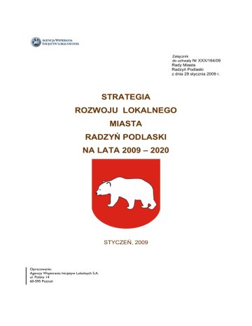 Załącznik do uchwały Nr XXX/164/09 Rady Miasta Radzyń Podlaski z dnia 29 stycznia 2009 r. STRATEGIA ROZWOJU LOKALNEGO MIASTA RADZYŃ PODLASKI NA LATA 2009 – 2020 STYCZEŃ, 2009 Opracowanie: Agencja Wspierania Inicjatyw Lokalnych S.A. ul. Polska 14 60-595 Poznań Strategia Rozwoju Lokalnego Miasta Radzyń Podlaski na lata 2009 – 2020 SPIS TREŚCI 1. WSTĘP................................................................................................................................................ 3 2. DIAGNOZA SYTUACJI SPOŁECZNO – GOSPODARCZEJ NA OBSZARZE MIASTA RADZYŃ PODLASKI .............................................................................................................................................. 6 2.1. PRZESTRZEŃ I ŚRODOWISKO ........................................................................................................... 6 2.1.1.PołoŜenie miasta.................................................................................................................... 6 2.1.2. Charakterystyka sieci osadniczej........................................................................................ 11 2.1.3. Zasoby naturalne ................................................................................................................ 11 2.1.4.Zasoby kulturowe................................................................................................................. 19 2.1.5. Identyfikacja podstawowych problemów ............................................................................ 23 2.2. SFERA SPOŁECZNA ....................................................................................................................... 23 2.2.1. Demografia ......................................................................................................................... 23 2.2.2. Rynek pracy ........................................................................................................................ 26 2.2.3. Uczestnictwo w kulturze ..................................................................................................... 30 2.2.4. Identyfikacja podstawowych problemów ............................................................................ 31 2.3. SFERA GOSPODARCZA .................................................................................................................. 31 2.3.1. Główni pracodawcy............................................................................................................. 31 2.3.2. Struktura podstawowych branŜ gospodarki........................................................................ 32 2.3.3. Ilość podmiotów gospodarczych i osób zatrudnionych w poszczególnych sektorach ...... 33 2.3.4. Ruch turystyczny na terenie Miasta Radzyń Podlaski........................................................ 35 2.3.5. Identyfikacja podstawowych problemów ............................................................................ 36 2.4. INFRASTRUKTURA TECHNICZNA...................................................................................................... 36 2.4.1. Infrastruktura komunikacyjna.............................................................................................. 36 2.4.2. Infrastruktura ochrony środowiska...................................................................................... 38 2.4.3. Infrastruktura energetyczna ................................................................................................ 39 2.4.4. Identyfikacja podstawowych problemów ............................................................................ 43 2.5. INFRASTRUKTURA SPOŁECZNA ....................................................................................................... 43 2.5.1. Infrastruktura edukacyjna ................................................................................................... 43 2.5.2. Infrastruktura sportowa ....................................................................................................... 45 2.5.3. Infrastruktura kultury ........................................................................................................... 46 2.5.4. Infrastruktura ochrony zdrowia i pomocy społecznej.......................................................... 46 2.5.5. Bezpieczeństwo publiczne.................................................................................................. 48 2.5.6. Identyfikacja podstawowych problemów ............................................................................ 49 2.6. ZARZĄDZANIE ............................................................................................................................... 50 2.6.1. MoŜliwości budŜetowe miasta ............................................................................................ 50 2.6.2. Planowanie strategiczne i promocja miasta ....................................................................... 53 2.6.3. Kapitał społeczny ................................................................................................................ 57 2.6.4. Identyfikacja podstawowych problemów ............................................................................ 63 2.7. ANALIZA SWOT ........................................................................................................................... 64 3. MISJA I WIZJA STRATEGII (CEL GENERALNY)........................................................................... 65 4. CELE STRATEGICZNE (OBSZARY PRIORYTETOWE), CELE OPERACYJNE ORAZ PROPONOWANE KIERUNKI DZIAŁAŃ .............................................................................................. 67 5. ZGODNOŚĆ ZE STRATEGICZNYMI DOKUMENTAMI .................................................................. 76 6. SYSTEM WDRAśANIA I MONITOROWANIA ................................................................................. 83 7. ŹRÓDŁA FINANSOWANIA ZADAŃ ....