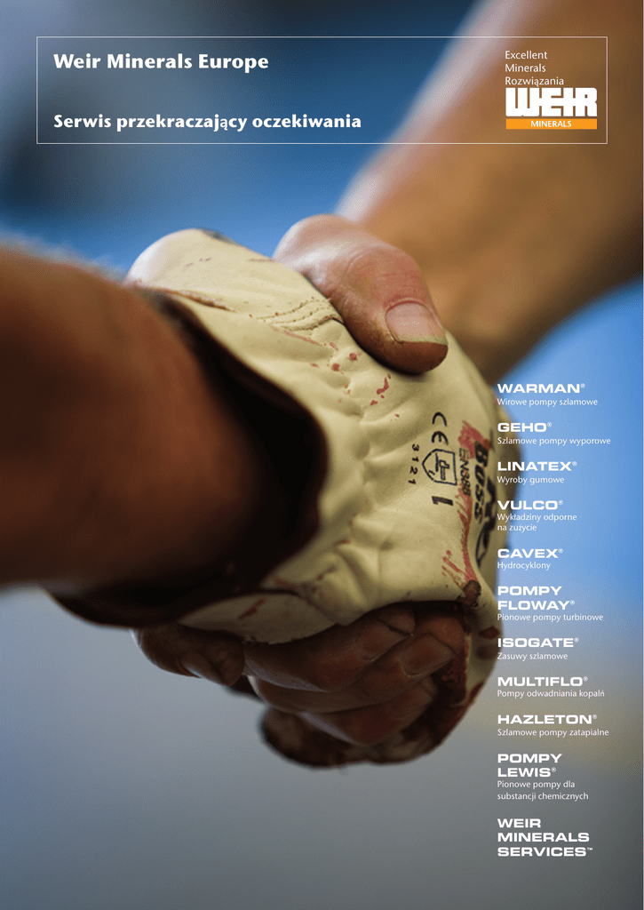 Weir Minerals Europe Excellent Minerals Rozwiązania Serwis przekraczający oczekiwania WARMAN® Wirowe pompy szlamowe GEHO® Szlamowe pompy wyporowe LINATEX® Wyroby gumowe VULCO® Wykładziny odporne na zużycie CAVEX® Hydrocyklony POMPY FLOWAY® Pionowe pompy turbinowe ISOGATE® Zasuwy szlamowe MULTIFLO® Pompy odwadniania kopalń HAZLETON® Szlamowe pompy zatapialne POMPY LEWIS® Pionowe pompy dla substancji chemicznych WEIR MINERALS SERVICES™ W zakresie serwisu, firma Weir Minerals wykracza poza oczekiwania Firma Weir Minerals oferuje w pełni profesjonalne usługi i sprawdzoną wiedzę zapewniając, że nasze zaangażowanie nie kończy się tylko na dostawie urządzenia. Stworzyliśmy europejską sieć usług obejmującą stałe i mobilne punkty serwisowe i zdobyliśmy cenne doświadczenie w obsłudze potrzeb naszych klientów. Nasze stałe i mobilne punkty serwisowe zatrudniają wysoko wyspecjalizowanych techników, co gwarantuje, że zawsze będziemy tam gdzie nas potrzebujesz, aby utrzymać twój zakład przetwórczy w szczytowej formie. Zaangażowanie i wiara w jakość naszych wyrobów i w strategię serwisową są powodem, dla którego najwięksi światowi operatorzy wciąż wybierają nasze wysoce wydajne urządzenia. Tony Locke, Dyrektor zarządzający Weir Minerals Europe Niektóre z naszych produktów i usług są dostępne jedynie poprzez sieć naszych autoryzowanych dystrybutorów. Serwis przekraczający wszelkie oczekiwania Filozofia prowadzenia biznesu, obowiązująca w Weir Minerals wymaga od nas znajomości rynku części i serwisu, co jest kluczowym czynnikiem w zapewnieniu optymalnej wydajności i w zminimalizowaniu długoterminowych kosztów eksploatacji ponoszonych przez naszych klientów. Działając w regionie od 1981 roku, firma Weir Minerals Europe zanotowała znaczny wzrost bazy klientów i konsekwentnie inwestuje w rozwój potencjału serwisowego, stanowiącego podstawowy element naszej strategii rozwoju. Stanowi to dla nas pomoc w zwiększaniu poziomu wsparcia udzielanego naszym klientom, rozwijając tym samym i cementując silne więzy współpracy. Sieć naszych centrów serwisowych, strategicznie rozlokowana w Europie jest wyposażona w szeroki asortyment części zamiennych, a w każdym z nich istnieje możliwość przeprowadzenia prac na wszystkich produktach Weir Minerals przy optymalnej szybkości i sprawności. Nasz model opieki serwisowej pozwala nam zaoferować usługi profesjonalne i wysokiej jakości, które zapewniają optymalną wydajność naszego sprzętu i zminimalizowane ryzyko awarii. Zapewniamy szeroki zakres usług, począwszy od obsługi technicznej na zlecenie, aż po zawieranie długoterminowych umów serwisowych. Odbiór Nasz zespół serwisowy może wykonać wstępne ustawienia i przeprowadzić rozruch wszystkich nowych maszyn wyprodukowanych przez Weir Minerals po ich instalacji. Serwis wykonany przez naszych specjalistów gwarantuje, że urządzenia będą pracowały od samego początku z najwyższą wydajnością i ze zoptymalizowanymi parametrami. Serwis wykonywany u klienta Weir Minerals posiada zespół doświadczonych inżynierów serwisowych, operujących w poszczególnych regionach Europy, zapewniający wykonanie usługi na miejscu u klienta, czyli tam, gdzie są najbardziej potrzebni. W zakres działania serwisu wchodzą także wszystkie poziomy monitorowania stanu technicznego, regularne konserwacje, przeglądy i przebudowy sprzętu celem zapewnienia optymalnej wydajności. Renowacje wyrobów w naszych centrach serwisowych W znakomicie wyposażonych centrach serwisowych Weir Minerals możemy się podjąć całkowitej renowacji dowolnego urządzenia. Jest to korzyść wynikająca z technologii i bezpośrednio dostępnego wsparcia technicznego. Wymiana podzespołów pomp W naszym centrum Todmorden dysponujemy ograniczonym zapasem regenerowanych pomp Warman® i powszechnie używanych łożysk montażowych. Są one gotowe do natychmiastowego użycia, a także mogą być wysłane na zasadzie wymiany. Takie rozwiązanie minimalizuje czas przestoju zakładu klienta, ponieważ nie ma potrzeby rozkładania lub ponownego składania części. Wszystkie nasze zregenerowane pompy i łożyska montażowe posiadają taką samą gwarancję, jak nowe urządzenia. Monitorowanie stanu technicznego Monitorowanie stanu technicznego, będące głównym elementem utrzymania systemów sprawności, stanowi proces sprawdzania parametrów na sprzęcie w momencie gdy jest on uruchomiony. Taki monitoring umożliwia ustalenie harmonogramu konserwacji, lub podjęcie innych działań mających na celu uniknięcie konsekwencji awarii przed jej nastąpieniem. Wszyscy technicy zatrudnieni w Weir Minerals są przeszkoleni w zakresie stosowania oprogramowania opracowanego specjalnie z myślą o monitorowaniu stanu technicznego urządzeń. Dzięki temu zapewnia się sprawny i wiarygodny proces zbierania danych o wszystkich urządzeniach produkcji Weir Minerals, co w konsekwencji umożliwia optymalną pracę danej instalacji. Wykładziny gumowe Nasz zespół serwisowy Weir Minerals może dostarczyć na miejsce odpowiednie wykładziny gumowe i inne rozwiązania ochrony przed uszkodzeniami, zaprojektowane według indywidualnych potrzeb klienta, a także dokonać ich aplikacji przy użyciu najlepszych dostępnych wykładzin gumowych Linatex®, wybranych z szerokiej gamy gatunków i produktów opracowanych dla wysoce ścieralnych powierzchni. Indywidualne szkolenia produktowe Znakomicie wyszkoleni i doświadczeni technicy serwisowi mogą przeprowadzić na stanowiskach pracy, lub w salach wykładowych wielopoziomowe szkolenia dla personelu zajmującego się obsługą klienta. Indywidualne szkolenia w zakresie produktów Weir Minerals gwarantują zadowalające rezultaty, gdy brane pod uwagę są korzyści płynące z dłuższej żywotności i większej niezawodności urządzeń. Wypożyczanie pomp Weir Minerals dysponuje szeregiem pomp zanurzeniowych i pomp War