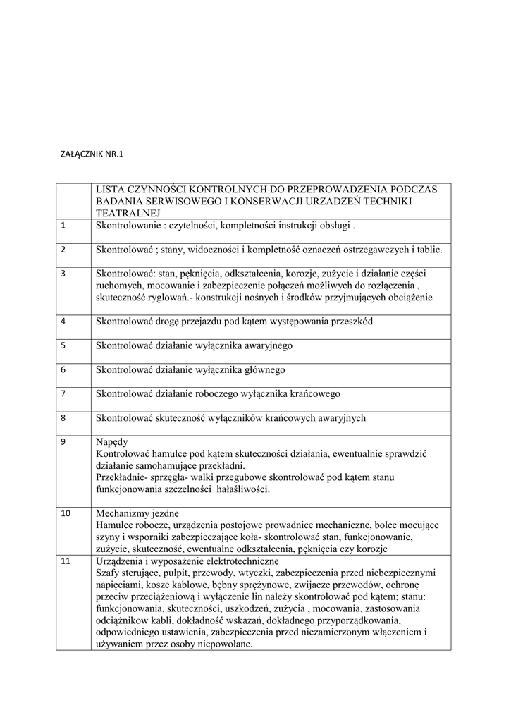 ZAŁĄCZNIK NR.1 1 LISTA CZYNNOŚCI KONTROLNYCH DO PRZEPROWADZENIA PODCZAS BADANIA SERWISOWEGO I KONSERWACJI URZADZEŃ TECHNIKI TEATRALNEJ Skontrolowanie : czytelności, kompletności instrukcji obsługi . 2 Skontrolować ; stany, widoczności i kompletność oznaczeń ostrzegawczych i tablic. 3 Skontrolować: stan, pęknięcia, odkształcenia, korozje, zużycie i działanie części ruchomych, mocowanie i zabezpieczenie połączeń możliwych do rozłączenia , skuteczność ryglowań.- konstrukcji nośnych i środków przyjmujących obciążenie 4 Skontrolować drogę przejazdu pod kątem występowania przeszkód 5 Skontrolować działanie wyłącznika awaryjnego 6 Skontrolować działanie wyłącznika głównego 7 Skontrolować działanie roboczego wyłącznika krańcowego 8 Skontrolować skuteczność wyłączników krańcowych awaryjnych 9 Napędy Kontrolować hamulce pod kątem skuteczności działania, ewentualnie sprawdzić działanie samohamujące przekładni. Przekładnie- sprzęgła- walki przegubowe skontrolować pod kątem stanu funkcjonowania szczelności hałaśliwości. 10 Mechanizmy jezdne Hamulce robocze, urządzenia postojowe prowadnice mechaniczne, bolce mocujące szyny i wsporniki zabezpieczające koła- skontrolować stan, funkcjonowanie, zużycie, skuteczność, ewentualne odkształcenia, pęknięcia czy korozje Urządzenia i wyposażenie elektrotechniczne Szafy sterujące, pulpit, przewody, wtyczki, zabezpieczenia przed niebezpiecznymi napięciami, kosze kablowe, bębny sprężynowe, zwijacze przewodów, ochronę przeciw przeciążeniową i wyłączenie lin należy skontrolować pod kątem; stanu: funkcjonowania, skuteczności, uszkodzeń, zużycia , mocowania, zastosowania odciążnikow kabli, dokładność wskazań, dokładnego przyporządkowania, odpowiedniego ustawienia, zabezpieczenia przed niezamierzonym włączeniem i używaniem przez osoby niepowołane. 11 12 Liny druciane, bębny linowe i łańcuchy stalowe Kontrolować na połączeniach zakończeń, rolki, pałąki wyłączające, ochronę nawijania, urządzenia wyrównujące, urządzenia mocujące, zabezpieczenia przeciw przeciążeniowe i zabezpieczenia miejsc wciągania. Kontrolować pod kątem: stanu, funkcji, obracania się, zużycia, wydłużenia, zgnieceń, luzów, pęknięć i tworzenie sie ostrych krawędzi i zadziorów. 13 Śruby Na wrzecionach, nakrętkach nośnych, nakrętkach zabezpieczających i urządzeniach wyrównujących należy skontrolować: stan, funkcje , składowanie, położenie, odkształcenie, zabrudzenie, nacięcia, wyżłobienia, rowki, naloty, skuteczność pokryw i zużycie gwintów, względnie luzy. 14 Listwy zębate i palce napędowe Na zębnikach i bolcach palców napędowych należy skontrolować: stan, funkcje, mocowanie, 15 Specjalne urządzenia zderzakowe i nośne Liny z włókien, urządzenia zatrzymujące, połączenia końców lin zderzaki, należy skontrolować pod kątem stanu, funkcji i skuteczności. Sztankiety i trawersy podciągów Na sztankietach, połączeniach śródków nośnych, urządzeniach zaciskowych, wyciąganych przedłużeniach, tablicach informacyjnych o nośności, mocowaniach przeciw obciążników należy skontrolować : przestrzenne odkształcenie się , działanie, zabezpieczenie przed zluzowaniem i czytelność. 16 17 Urządzenia szynowe Na przekierowaniach końcowych i podciągach lin, wózkach przeciąganych, rolkach i kanałach bieżnych należy skontrolować: stan, funkcje, nastawienie, odkształcenie, hałaśliwość, ruchomości ograniczniki położenia krańcowego. 18 Wyposażenie tkaninowe Skontrolować przyłączenia, pęknięcia, uszkodzenia, punkty styczne ze źródłami ciepła, trudno zapalność lub palność Podwieszenie kurtyny 19 .